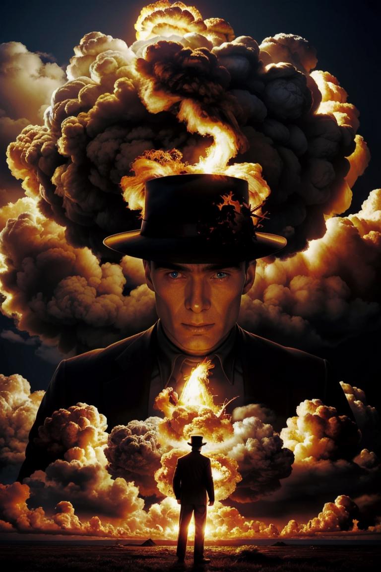 cinematic style,nuclear explosion,1boy,Cillian Murphy,silhouette,flame,solo,hat,mushroom cloud,surrounded by cloud,orange theme,outdoors,
