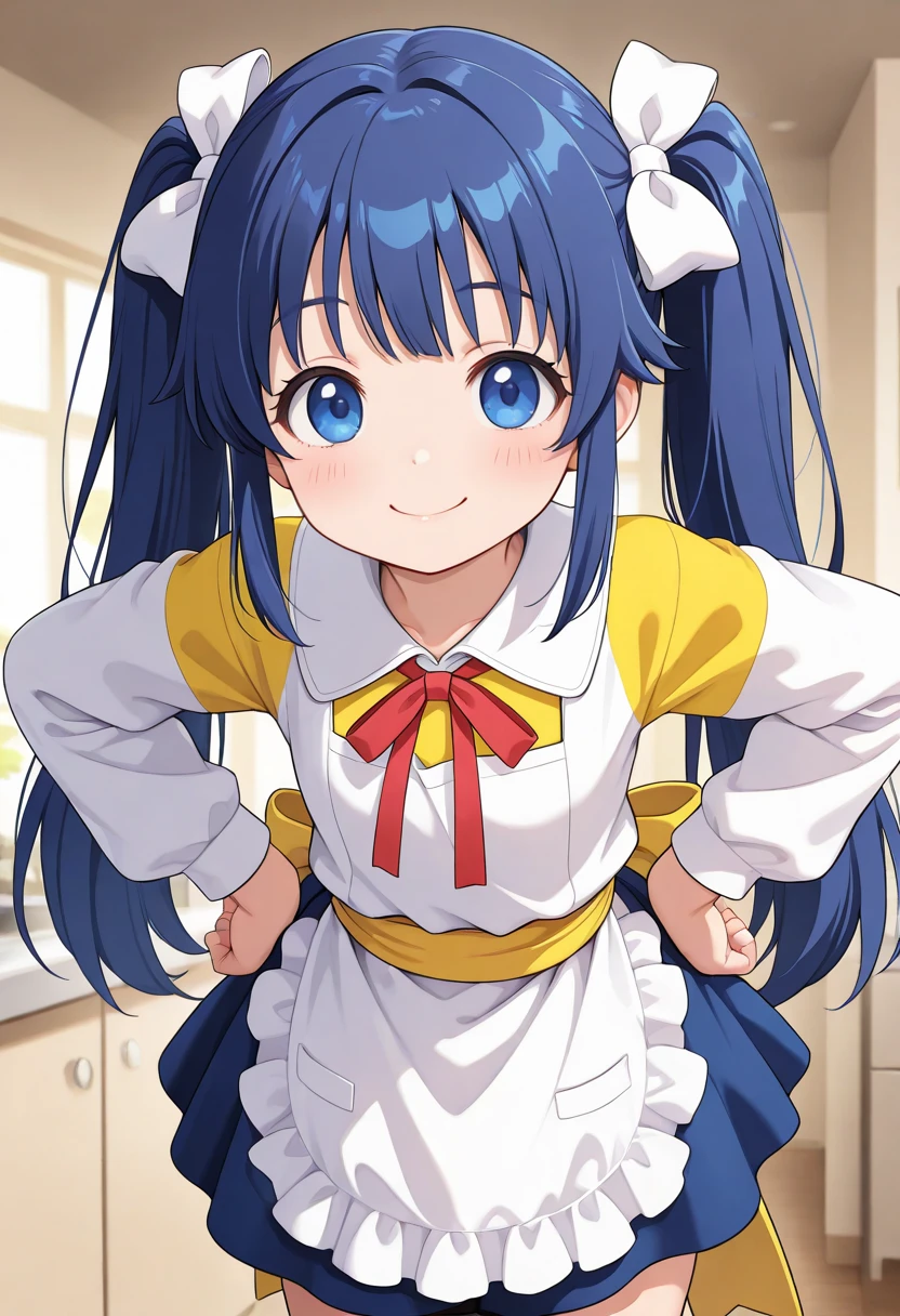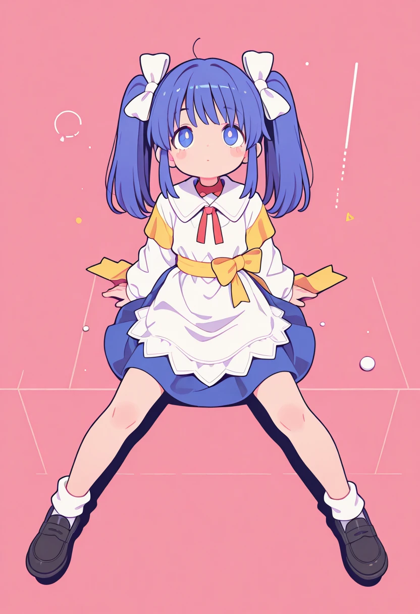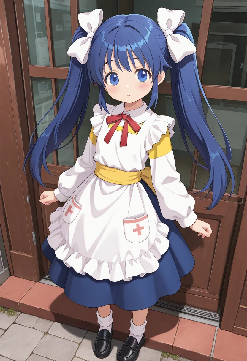 nise_sakura, blue hair, twintail hair, white bow, sidelocks, blue eyes, white dress, white sleeve, yellow sleeve, layered sleeves, long sleeve, apron, yellow waist sash, blue skirt, red neck ribbon, black loafer,