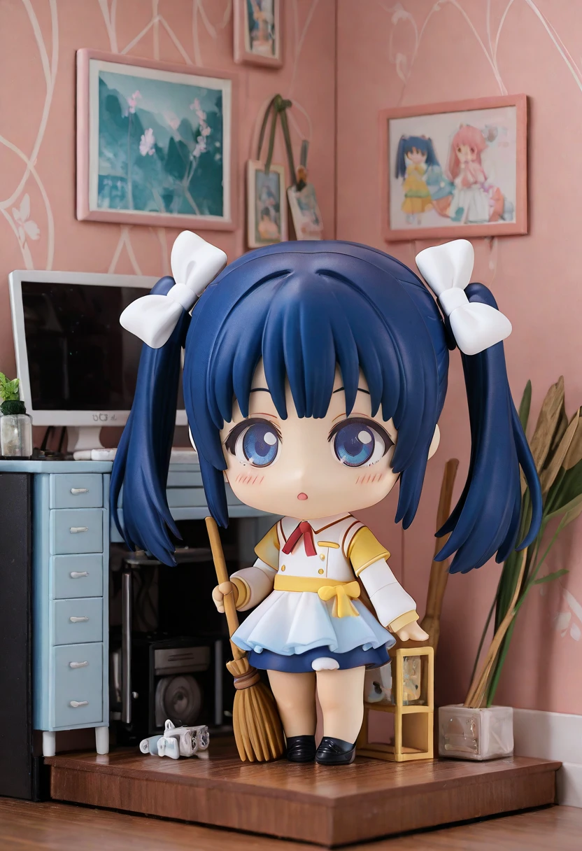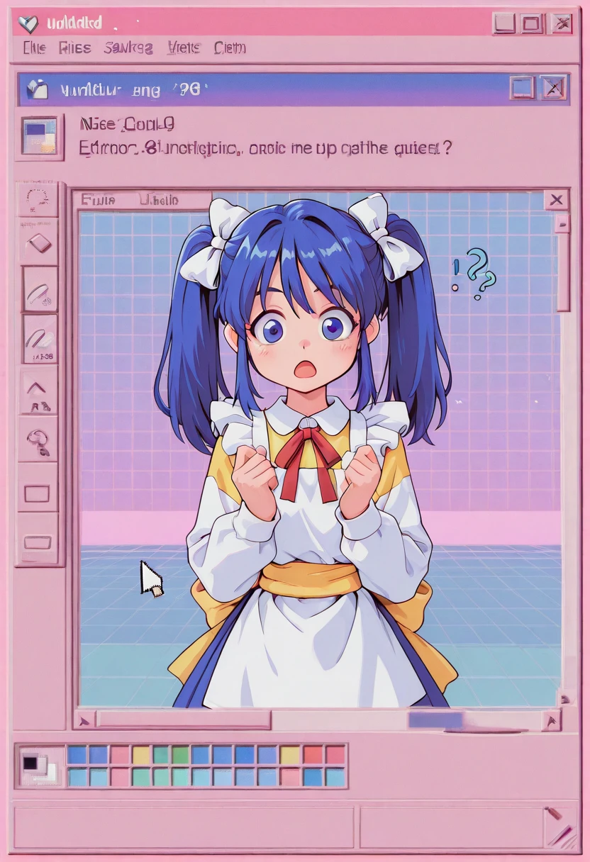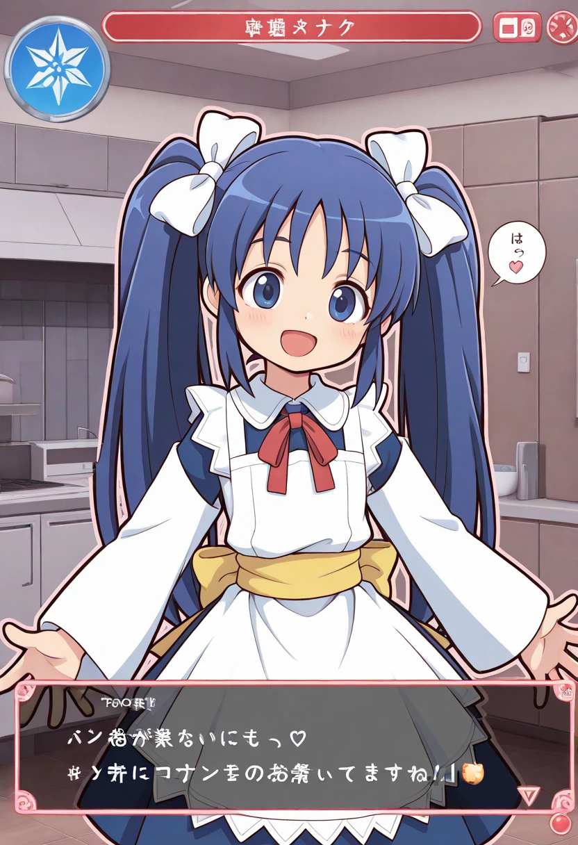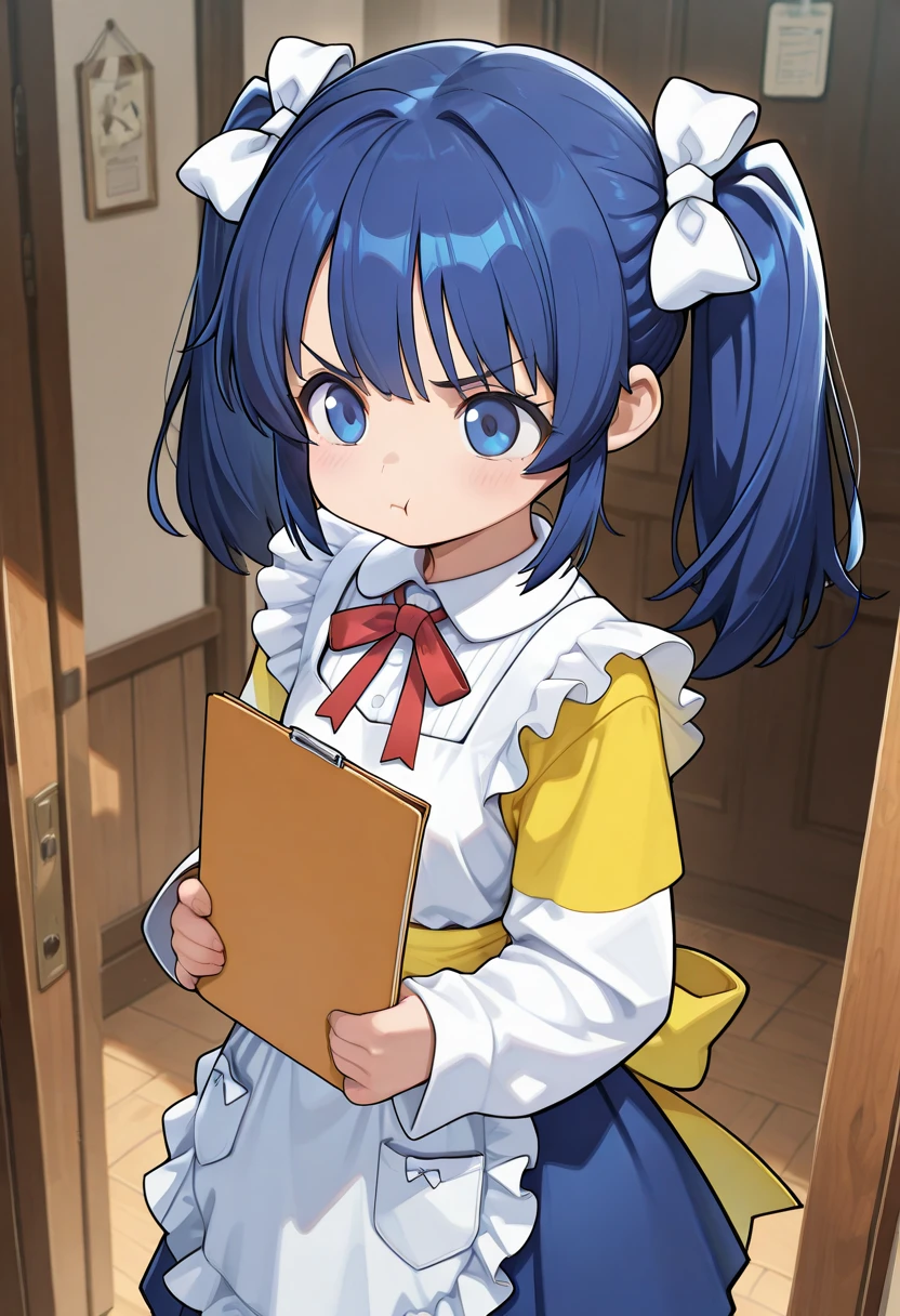 nise_sakura, blue hair, twintail hair, white bow, sidelocks, blue eyes, white dress, white sleeve, yellow sleeve, layered sleeves, long sleeve, apron, yellow waist sash, blue skirt, red neck ribbon, black loafer,