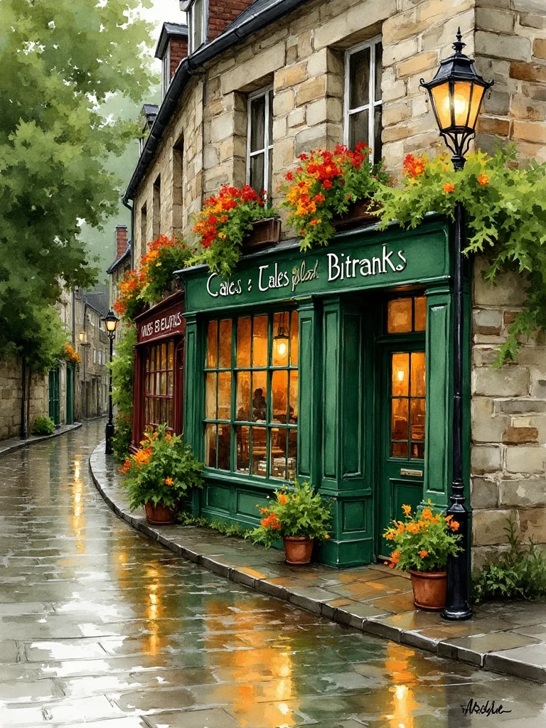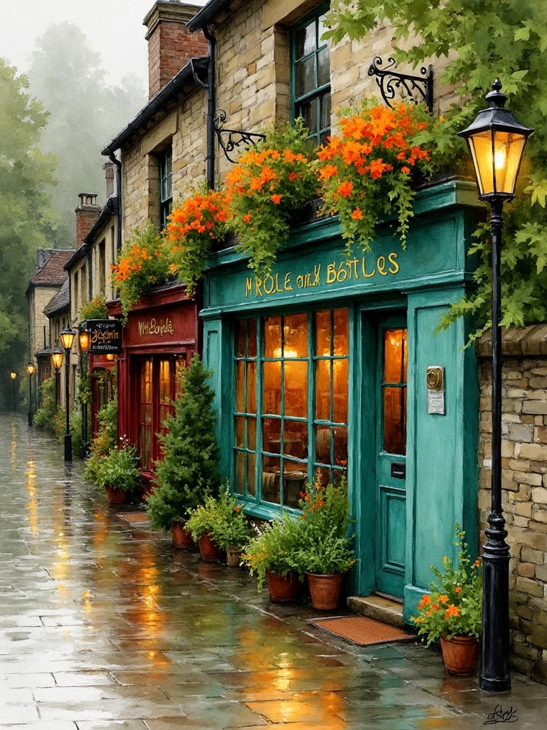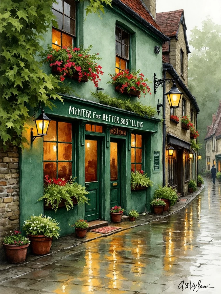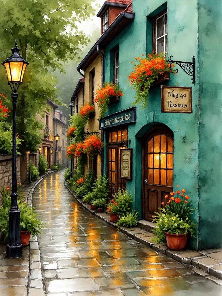 1. Rainy street scene with green buildings and flower decorations, soft light glows from windows, wet cobblestones reflect warm hues, creating a cozy, nostalgic vibe.