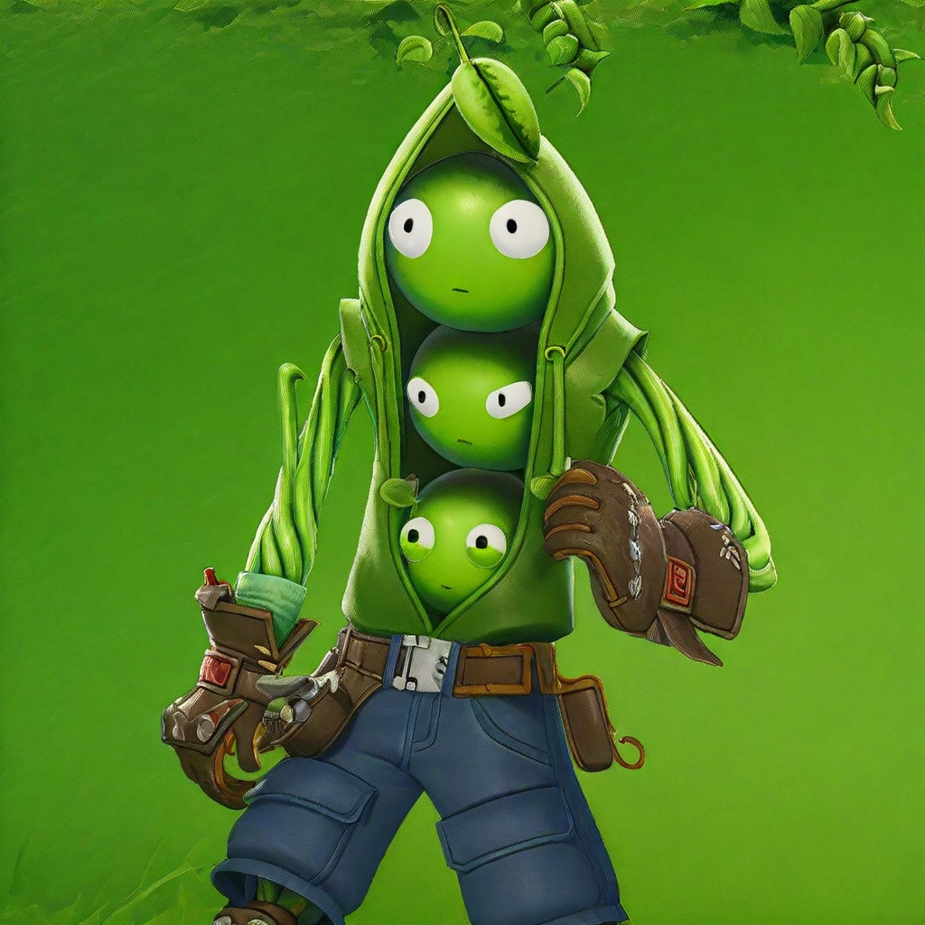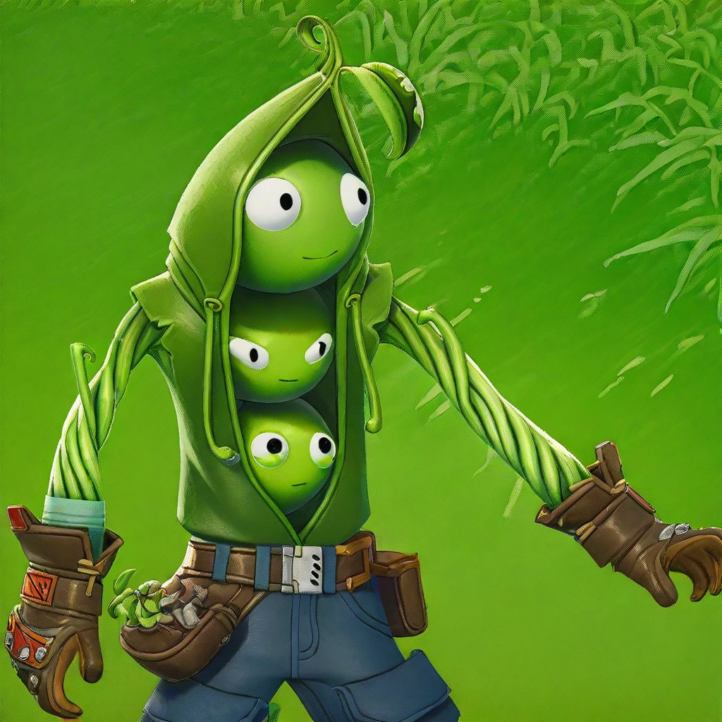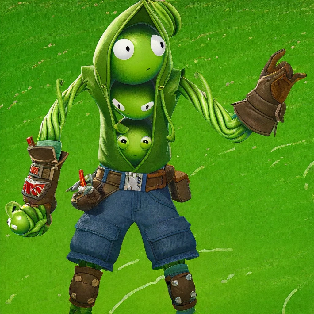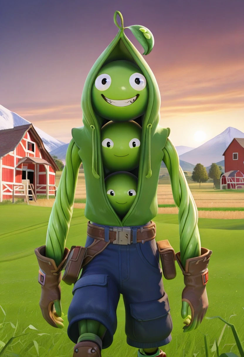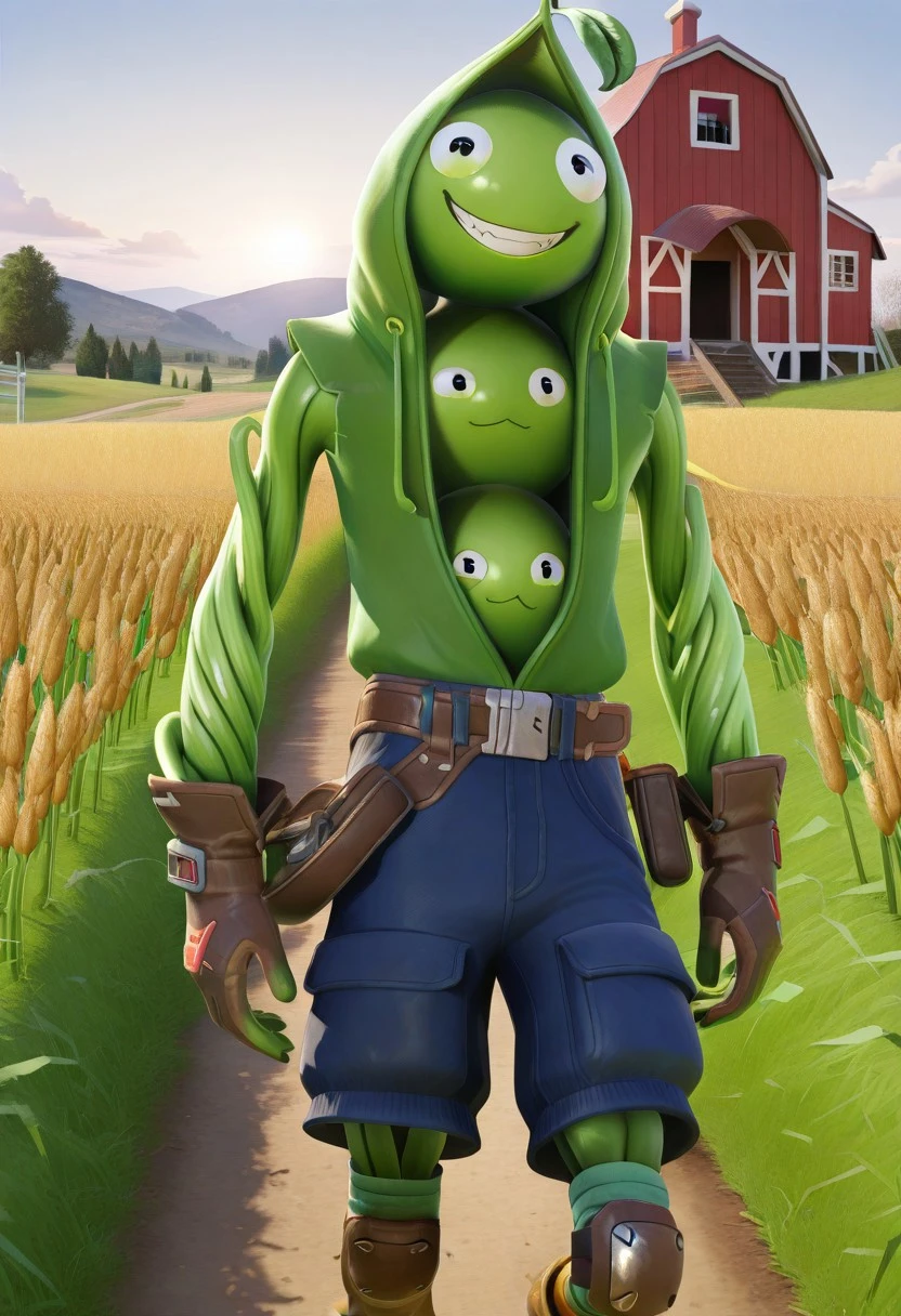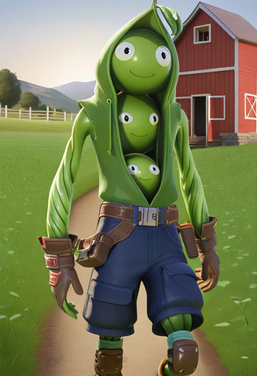 peabody, anthropomorphic pea pod, green pea pod hood, three small green pea faces, large white eyes, green skin, dark blue denim overalls, brown leather utility belt, brown leather work gloves, knee guards, brown work boots with green vine wrappings, vine legs, vine arms,