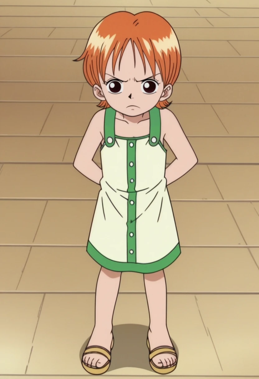 nami, 1girl, child, orange hair, short hair, dress, green dress,
