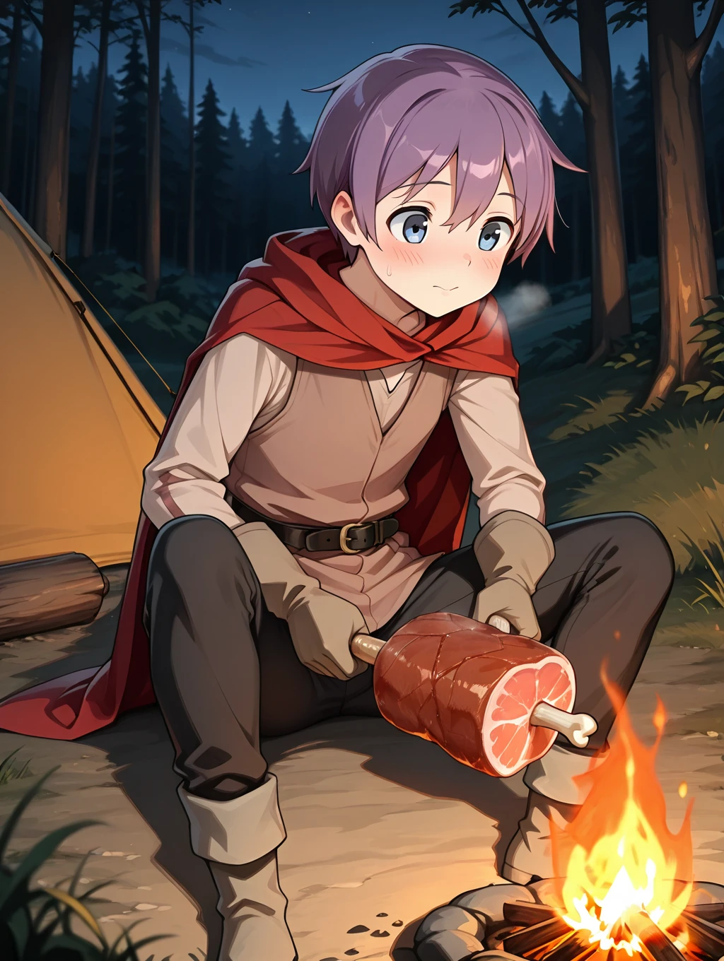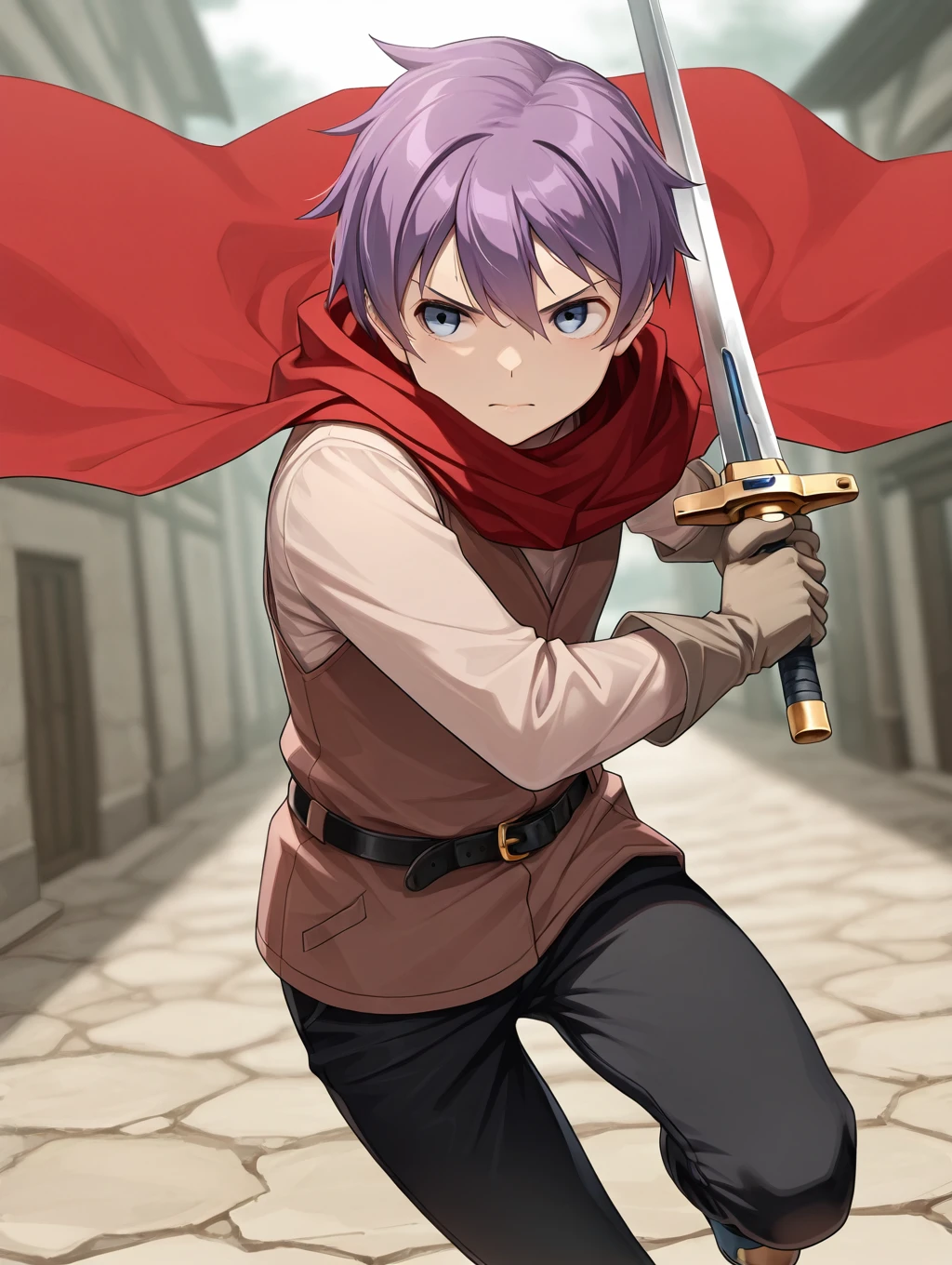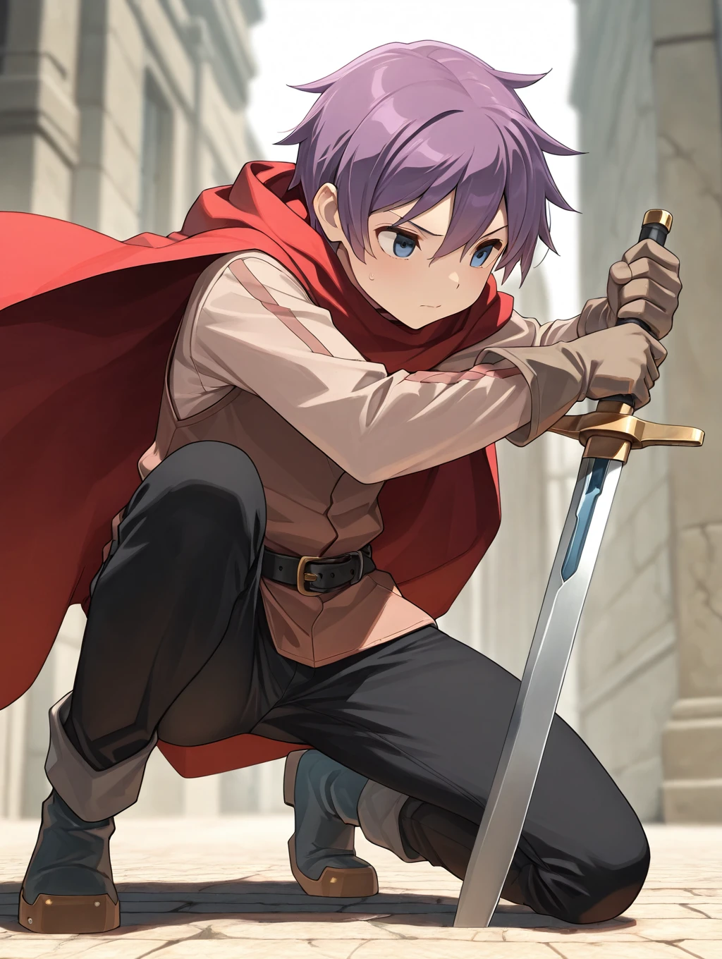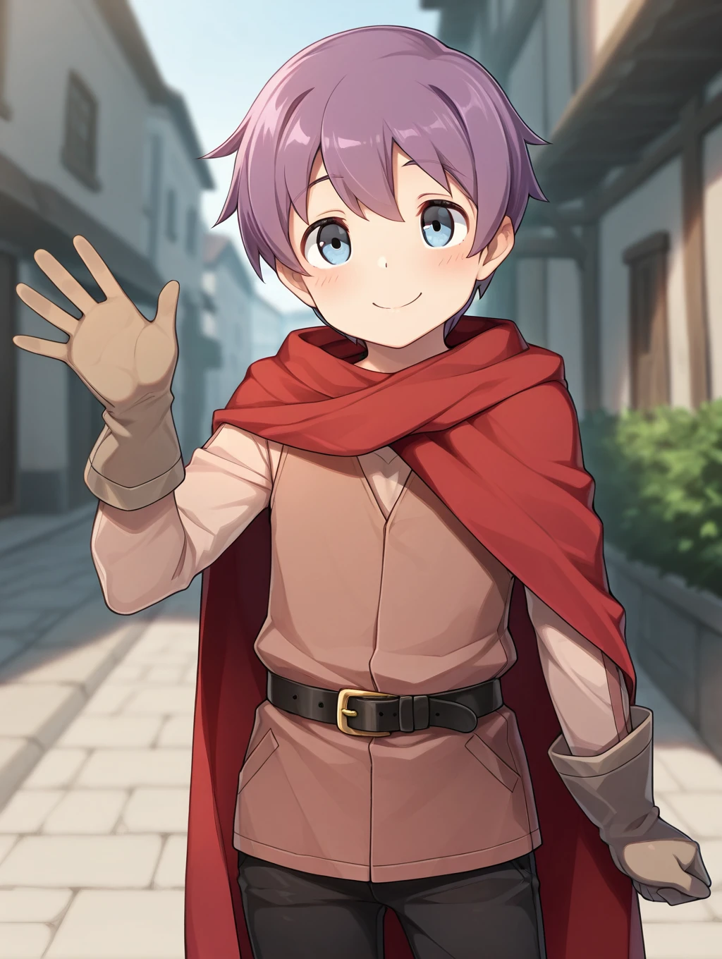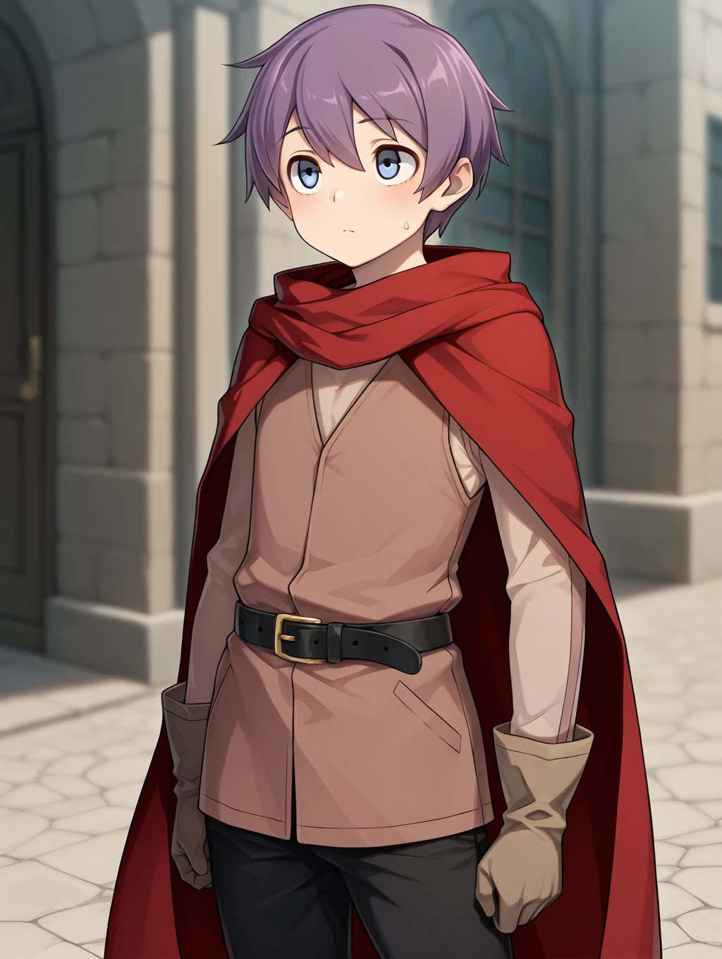 Luka, purple hair, short hair, blue eyes, red cape, brown vest, beige shirt, long sleeves, belt, black pants, gloves,