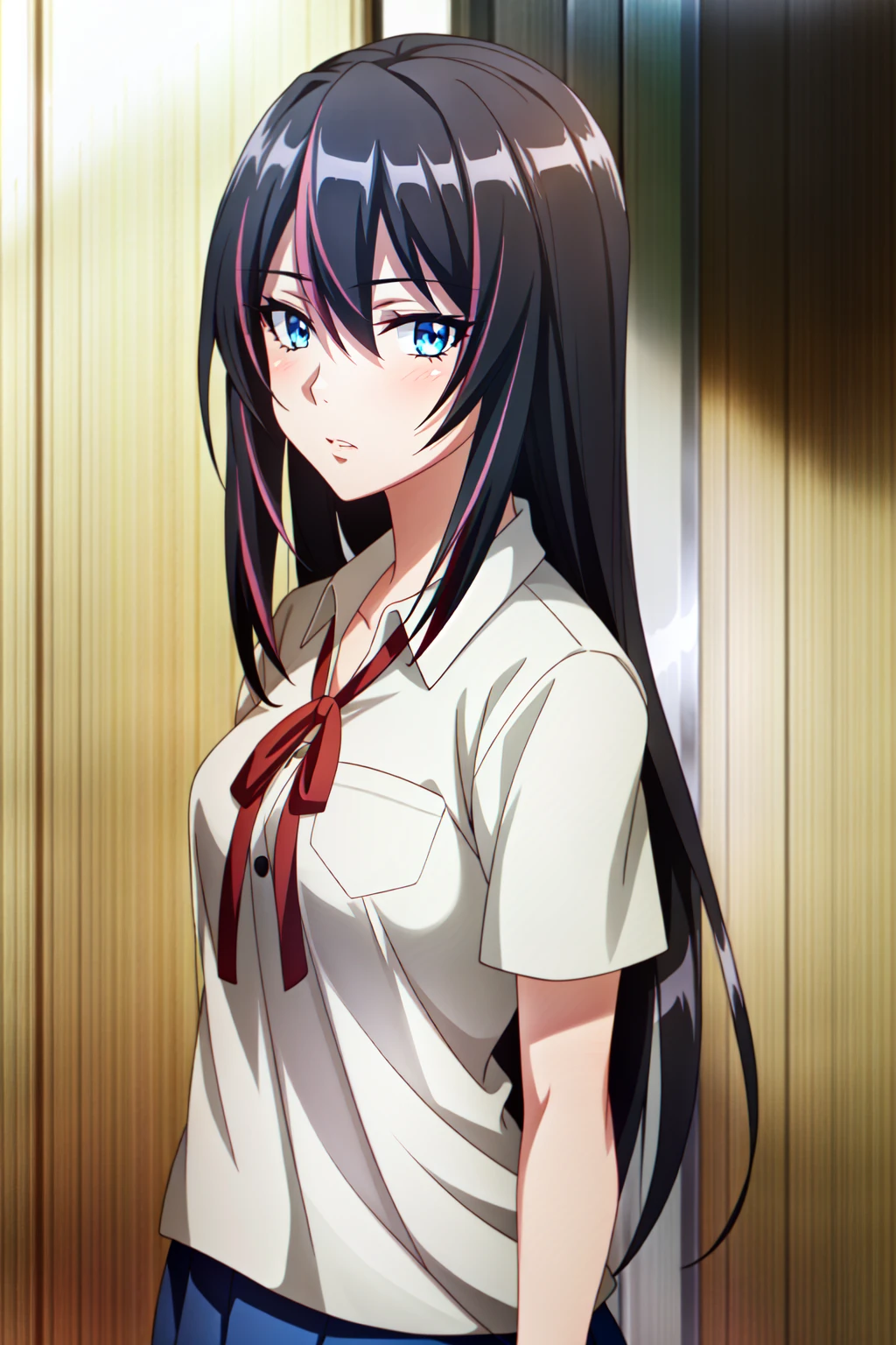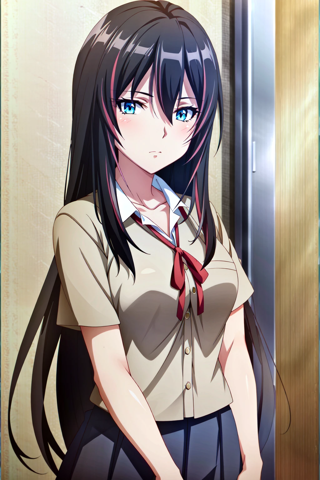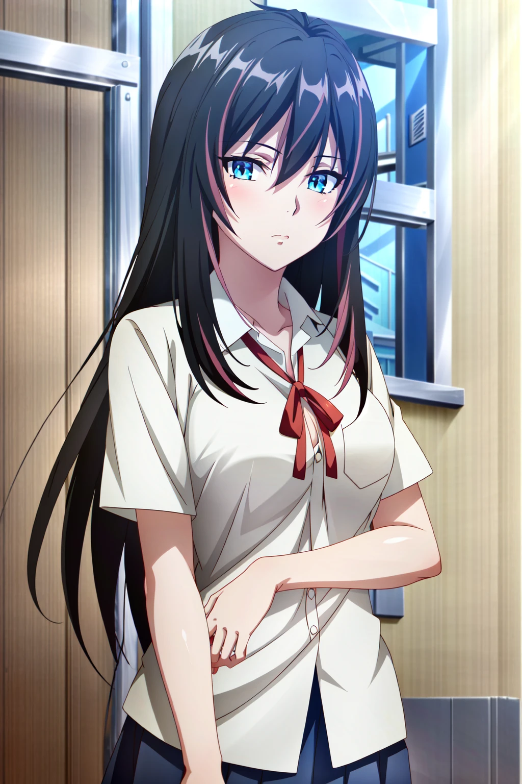 Misa Aoi, 1girl, solo, long hair, black hair, skirt, school uniform, blue eyes, socks, loafers, shoes, pleated skirt, shirt, looking at viewer