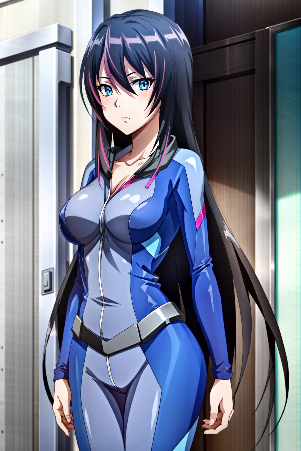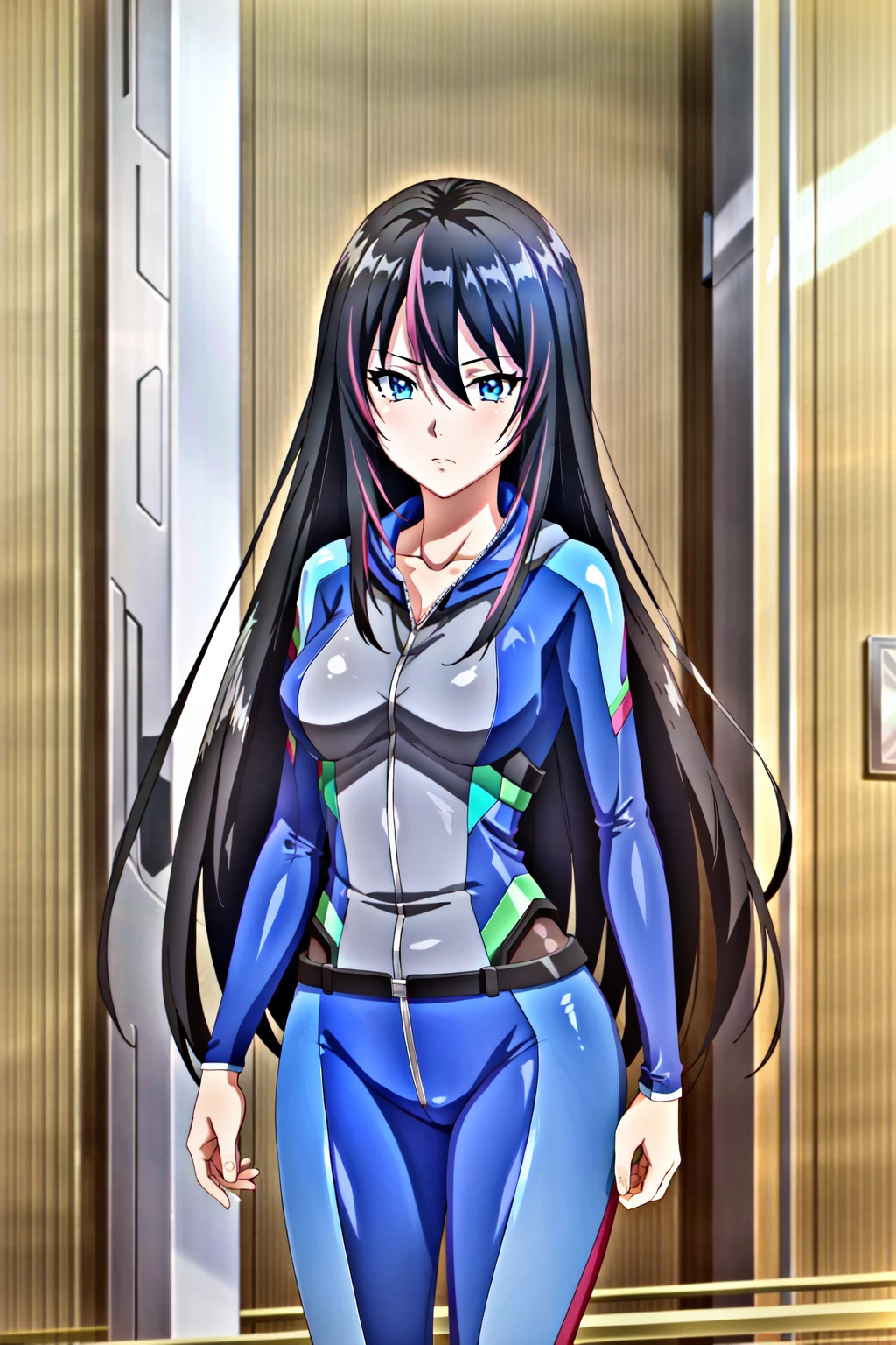 Misa Aoi, 1girl, solo, long hair, black hair, blue eyes, looking at viewer, jacket, hair between eyes, very long hair, breasts, medium breasts