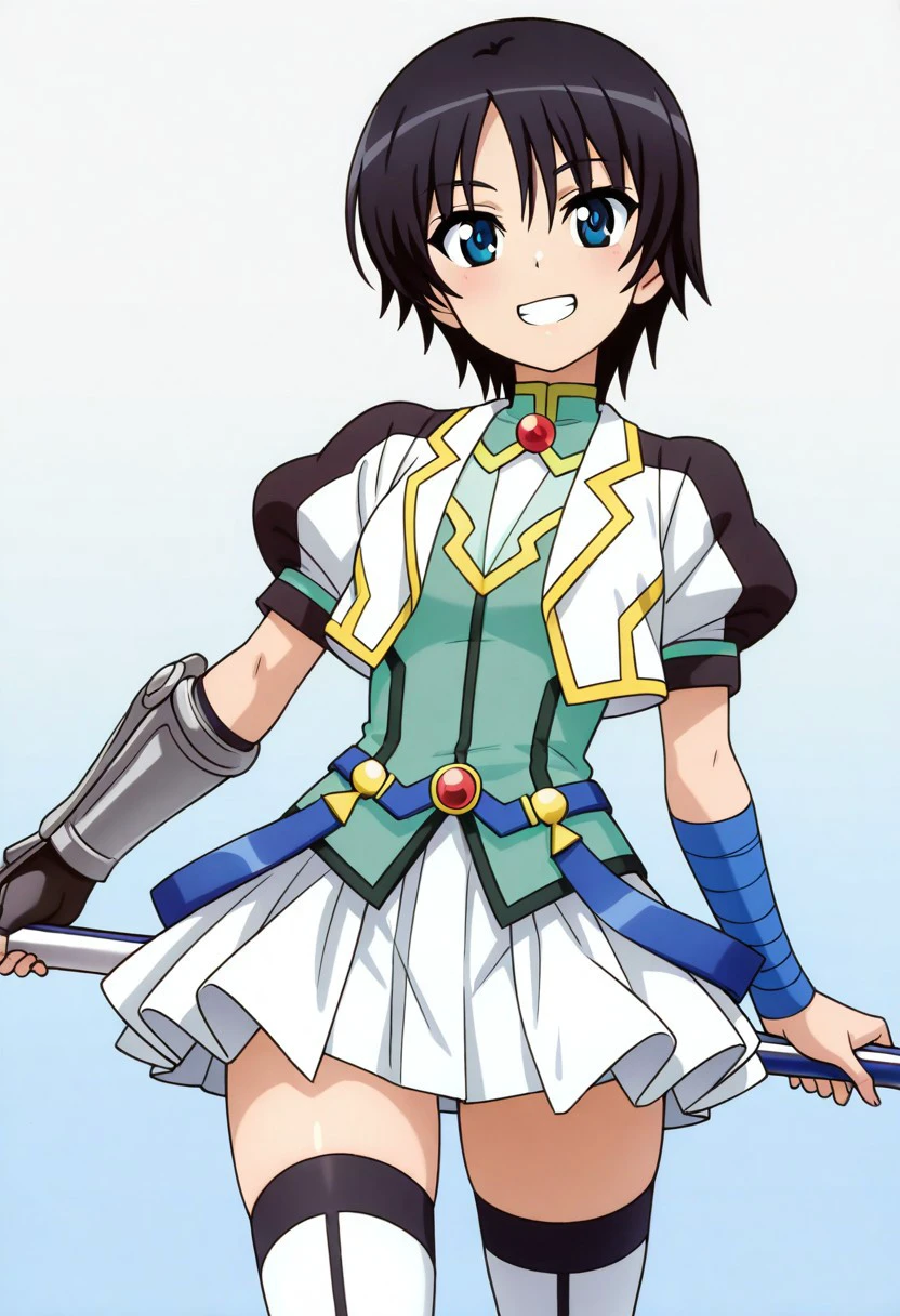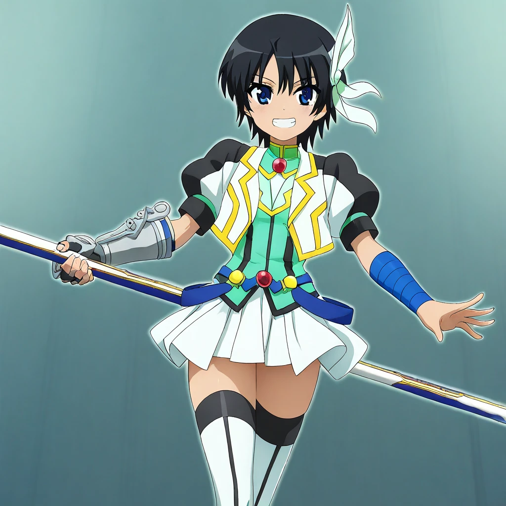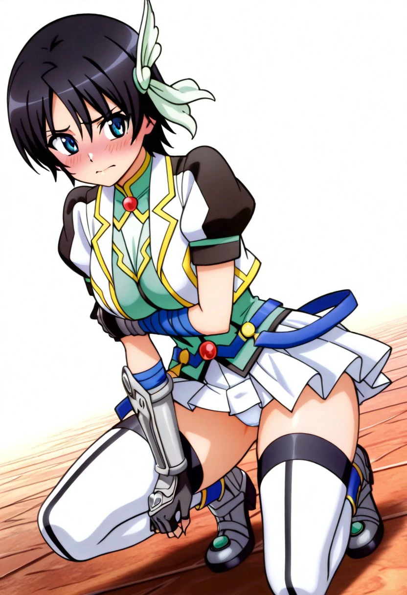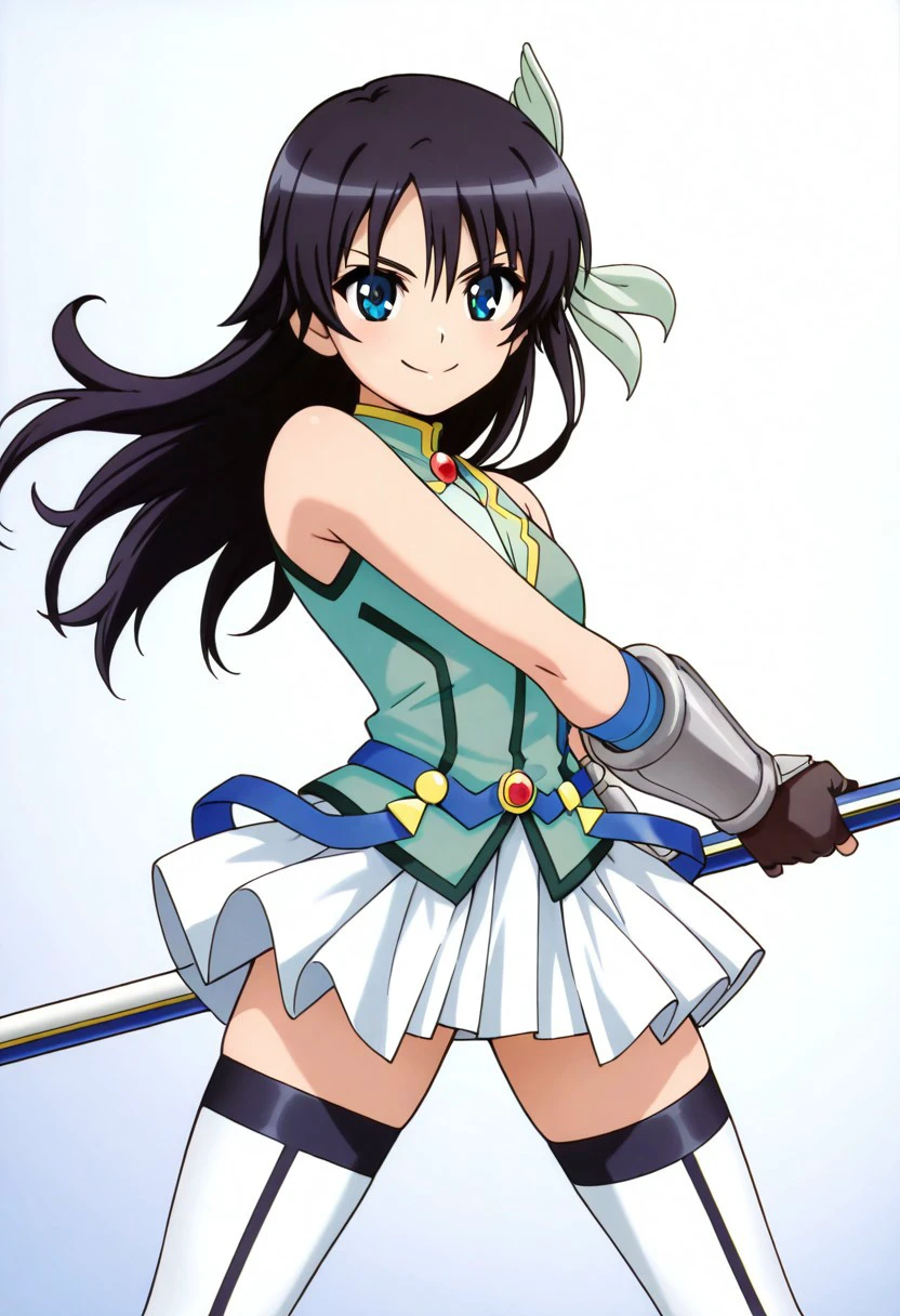 1girl, solo, NanamiTakatsuki, short hair, black hair, blue eyes, black and white cropped jacket with yellow trim, cyan shirt, blue belts, white pleated skirt, miniskirt, layered skirt, white thighhighs, blue anklet, metal shoes, red gem, armband, one metal gauntlet,