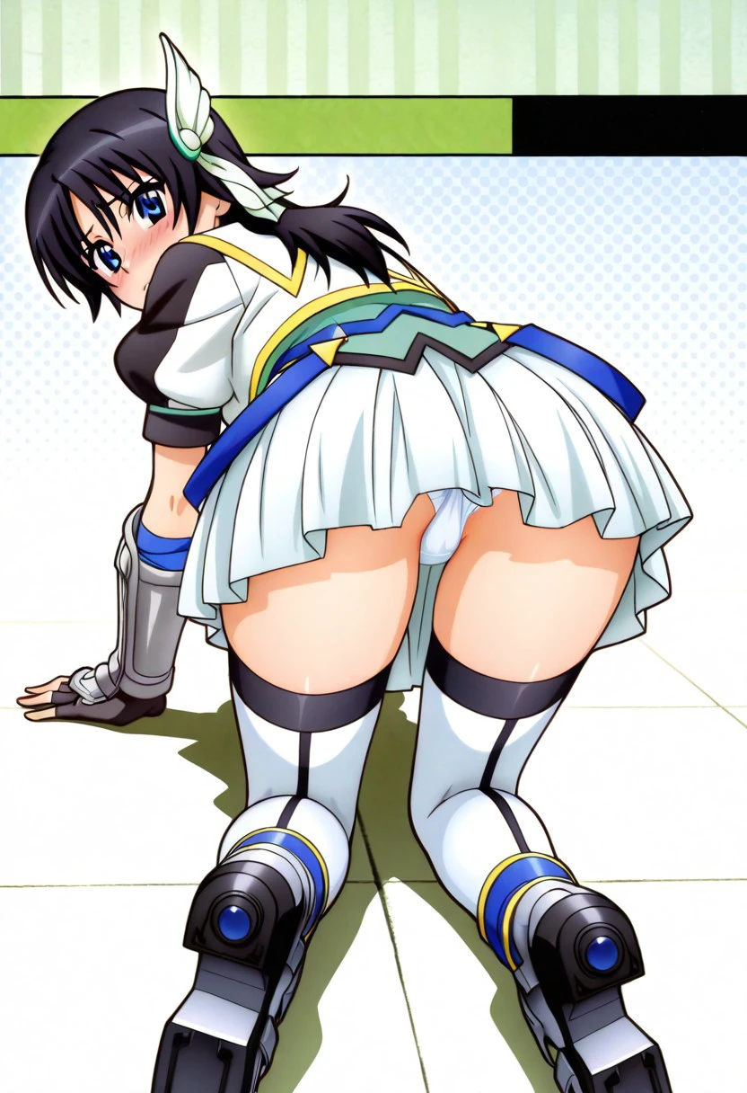 -Combat Uniform Variant: black and white cropped jacket with yellow trim, cyan shirt, blue belts, white pleated skirt, miniskirt, layered skirt, white thighhighs, blue anklet, metal shoes, red gem, armband, one metal gauntlet,