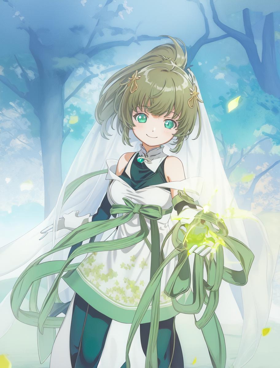 masterpiece,bast quality,official art,8K wallpaper,game cg,solo, green eyes, smile, 1girl, straight-on, green hair, standing, virtual youtuber, dress, gloves, looking at viewer, pantyhose, brown hair, long hair, very long hair, hair ornament, closed mouth,