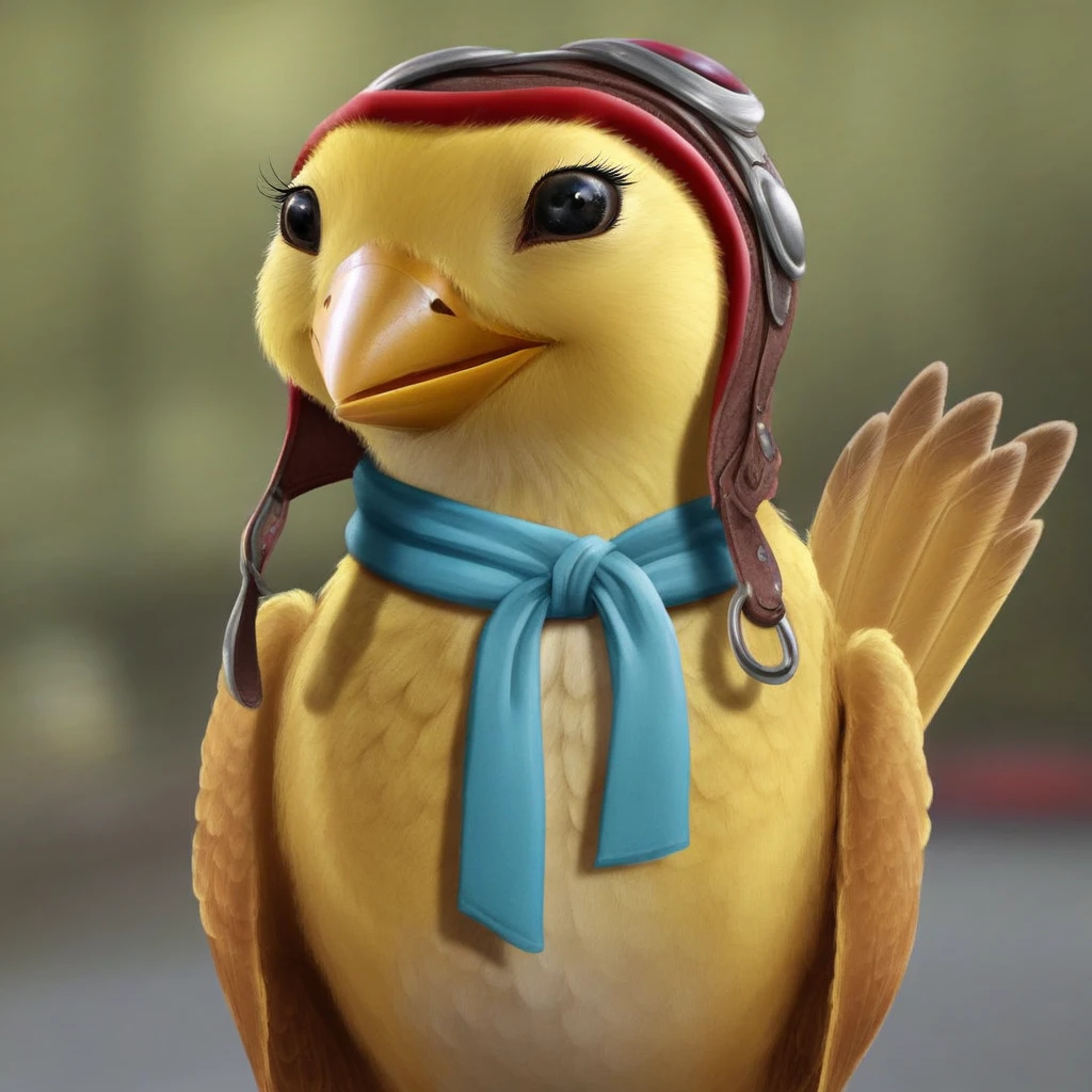 1girl, Avían, yellow Canary, black eyes, beak, yellow feathers, leather aviator helmet, googles, blue scarf,
