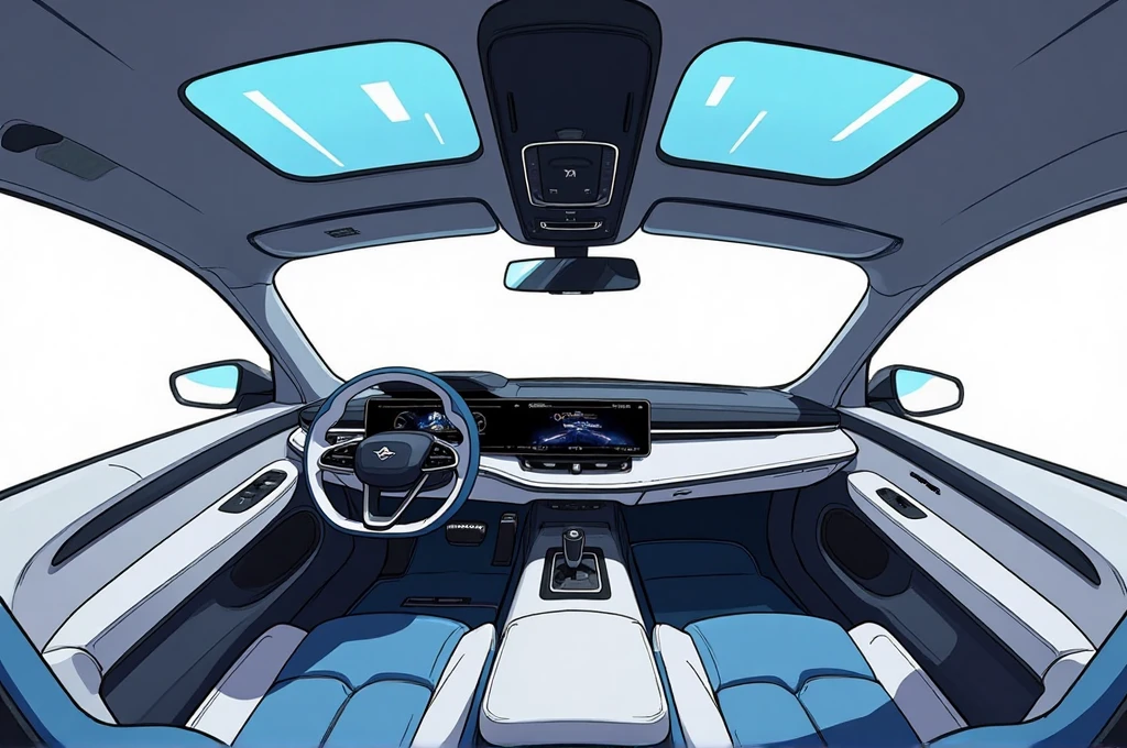 4. Car interior design sketches, luxury - oriented, leather upholstery, crystal - like controls, panoramic roof, deep blue & gold hues, large center console.