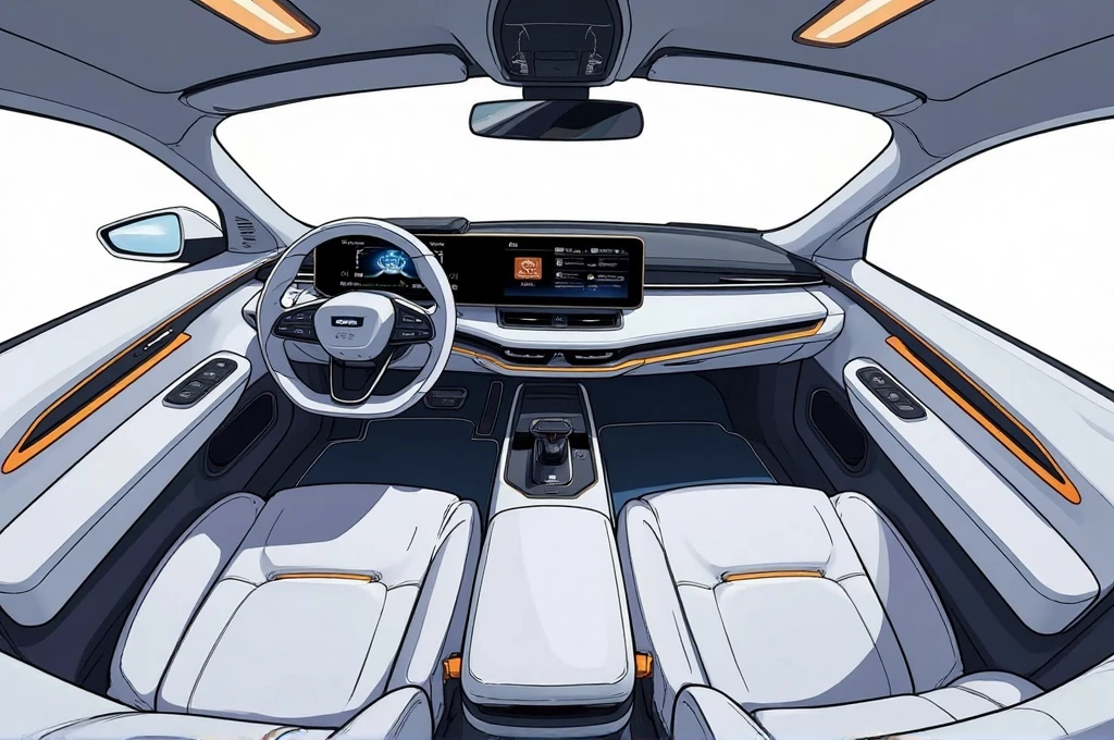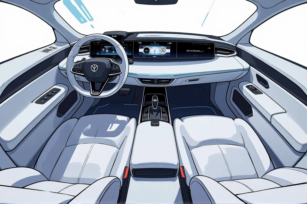 1. Car interior design sketches, futuristic style, minimalist lines, integrated smart displays, ambient light strips, light gray & metallic accents, spacious layout.