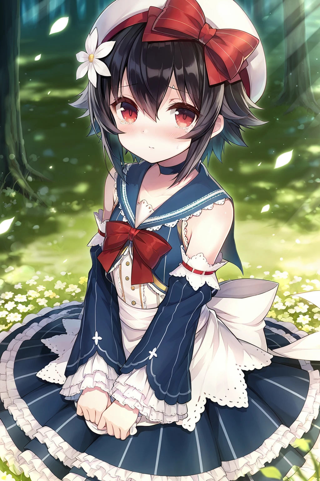 Snow White,red eyes,hair ornament,bow,hair flower,red bow,flower,short hair,ribbon,frills,hair bow,red ribbon,hair between eyes,black hair,flat chest,