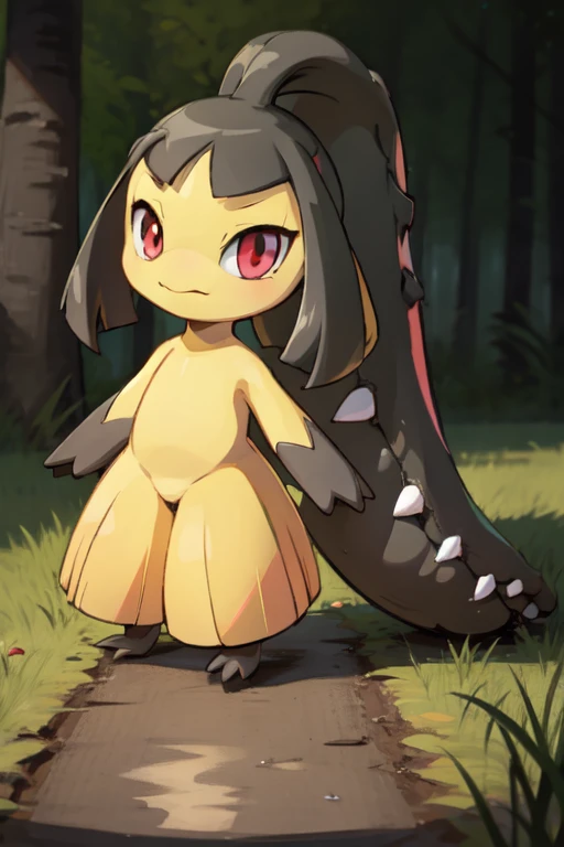 mawilePKMN, solo, no humans, pokemon \(creature\), multicolored skin, yellow skin, no nose, black hair, ponytail, extra mouth, red eyes