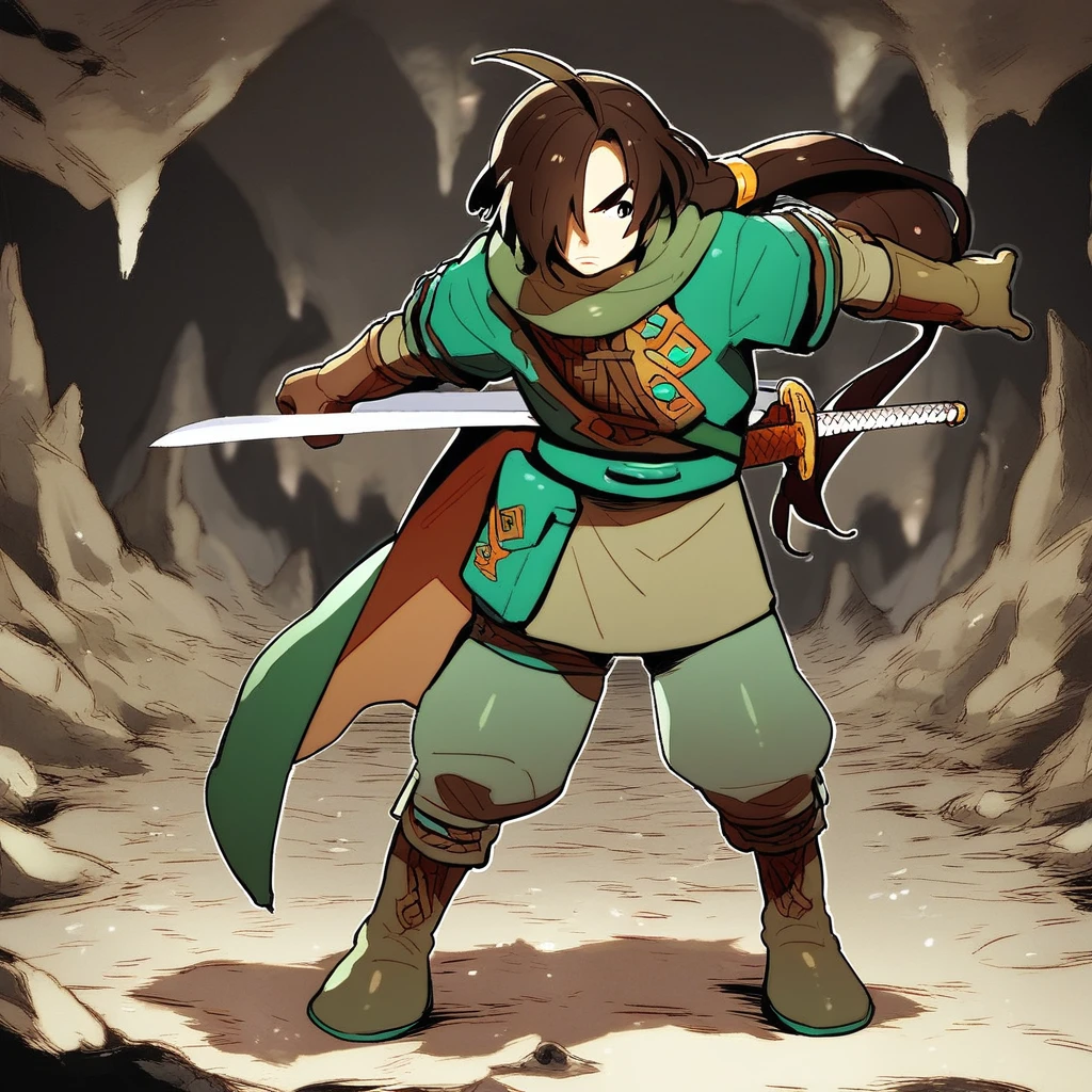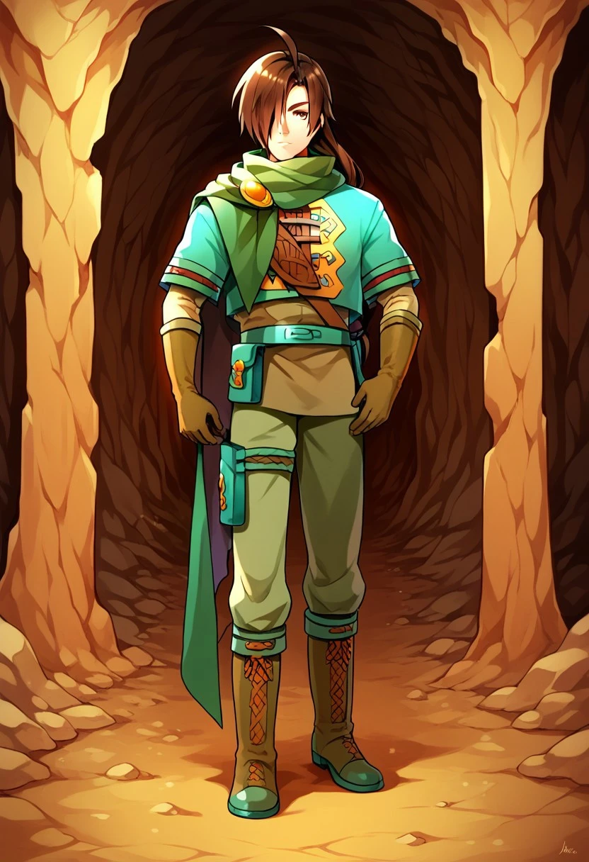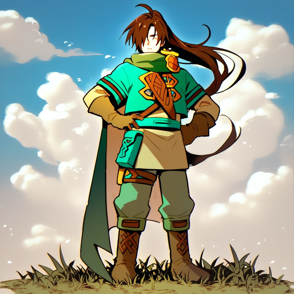 Outfit: cloak, short sleeves over long sleeves, green tunic, shoulder strap, belt, belt pouch, brown gloves, thigh holster, green pants, puttee, boots,