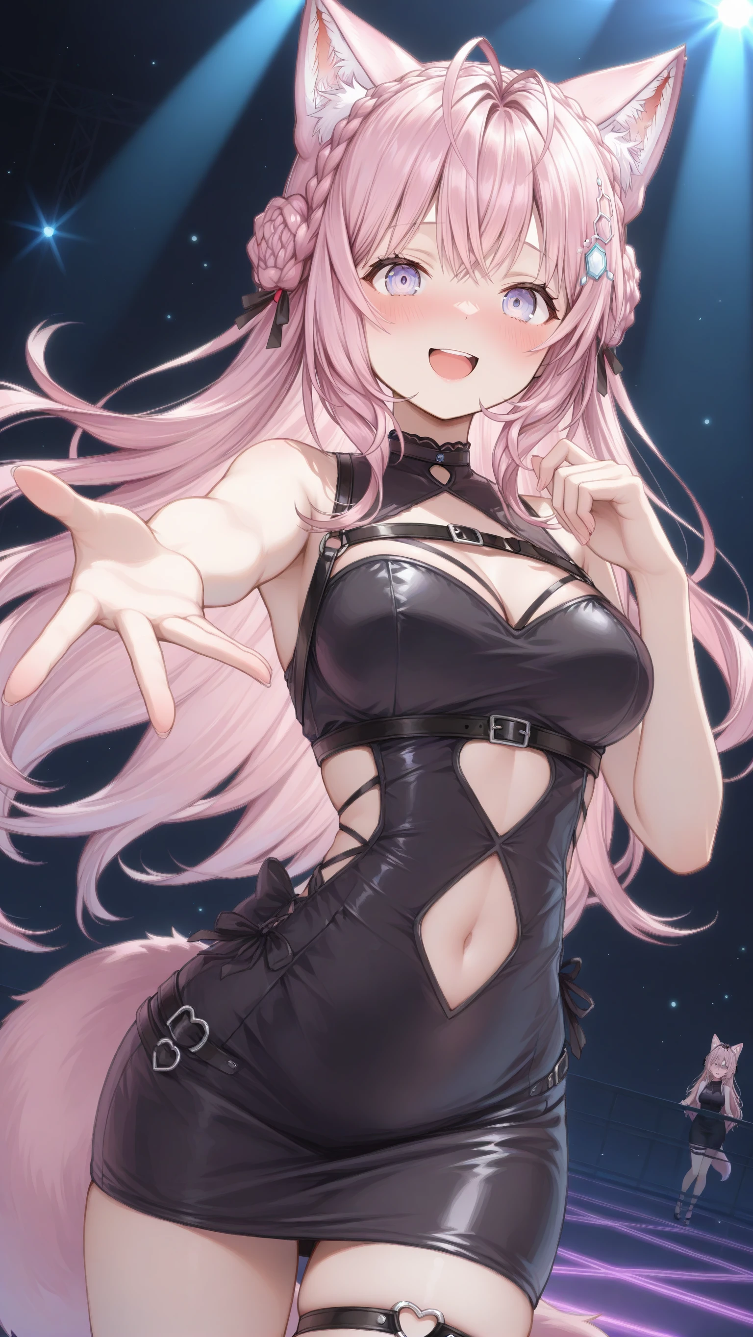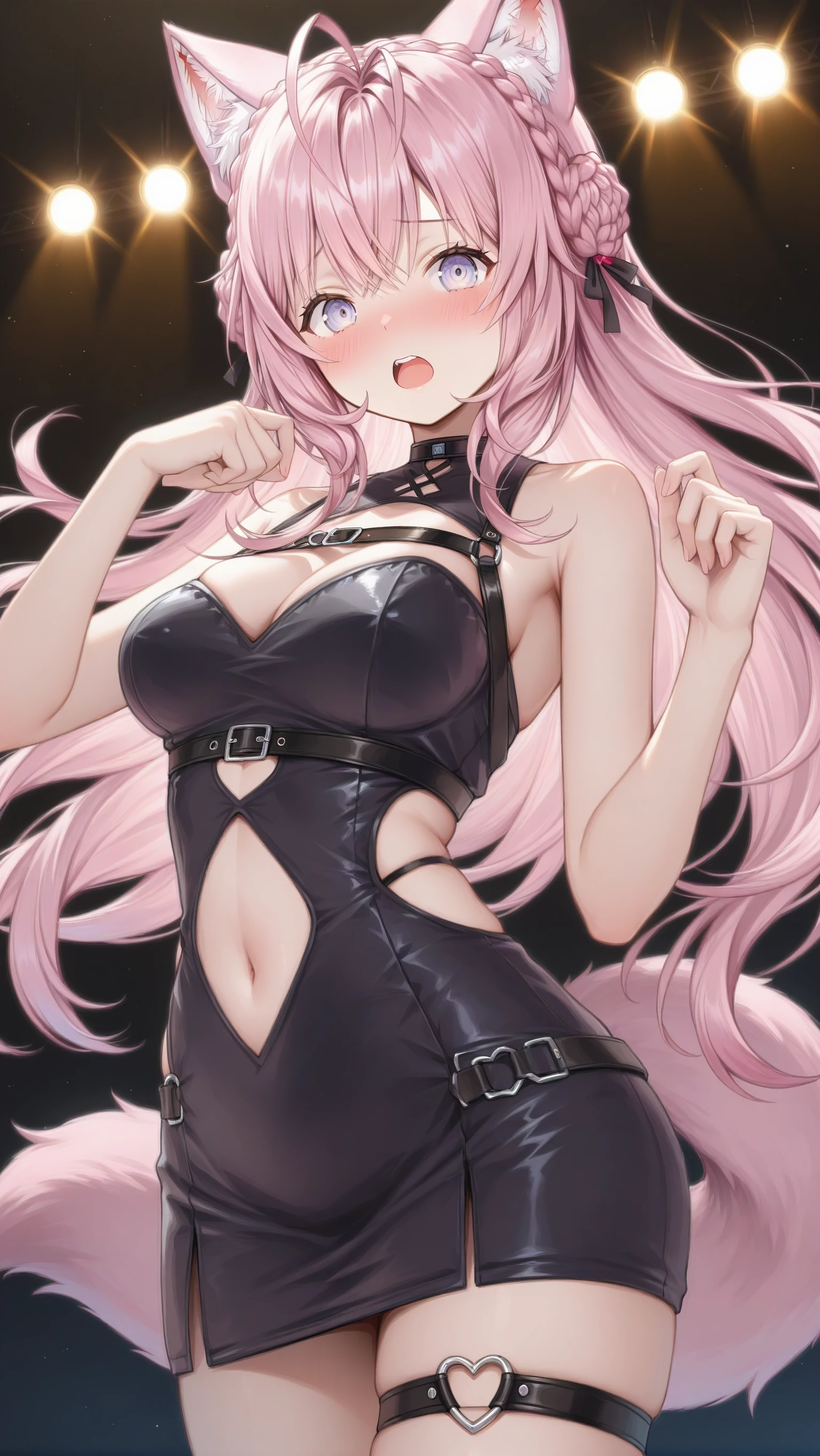 koyori_bondage, hakui_koyori, alternate costume, clothing cutout, bondage, black dress, thigh strap, waist ornament, short dress, navel cutout, tight skirt, black ribbon, skindentation💬 From the Creator