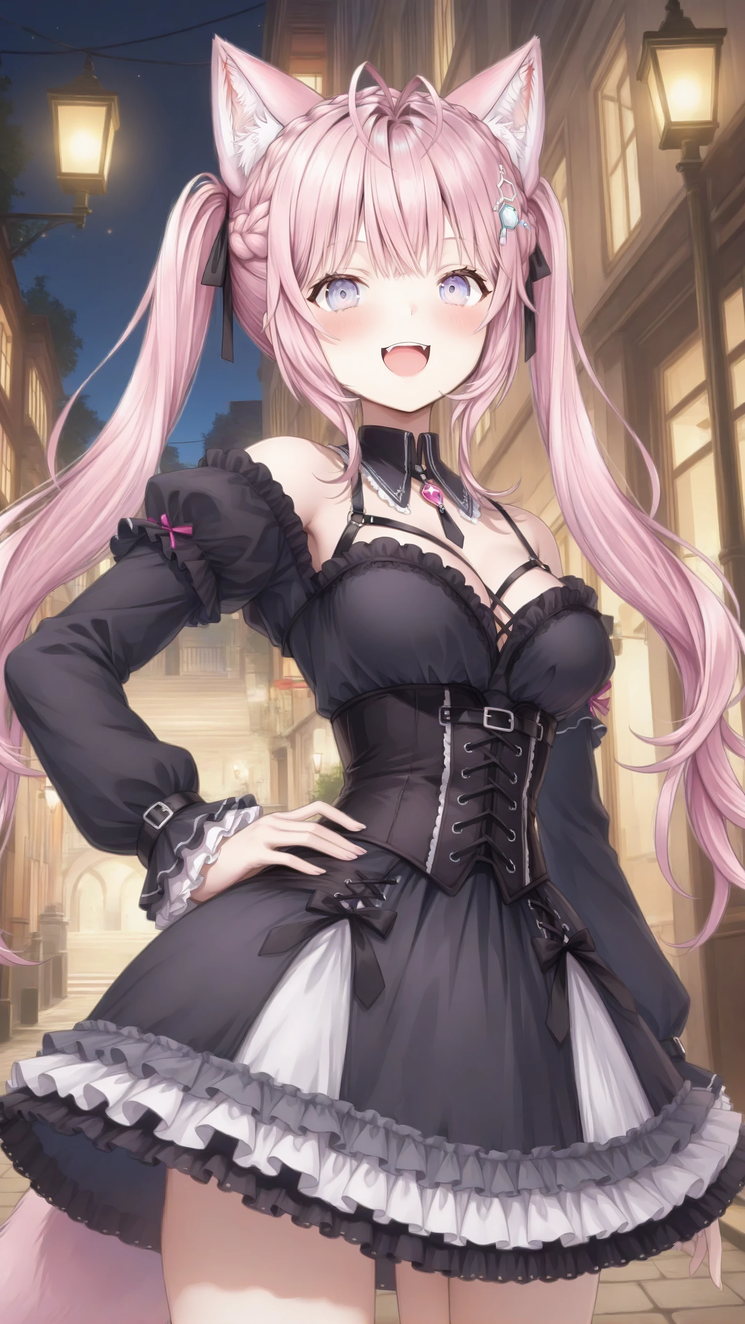 koyori_gothic, hakui_koyori, alternate costume, black dress, frills, frilled dress, lolita fashion, corset, cross-laced clothes, detached collar, off-shoulder, puffy sleevesBondage Style