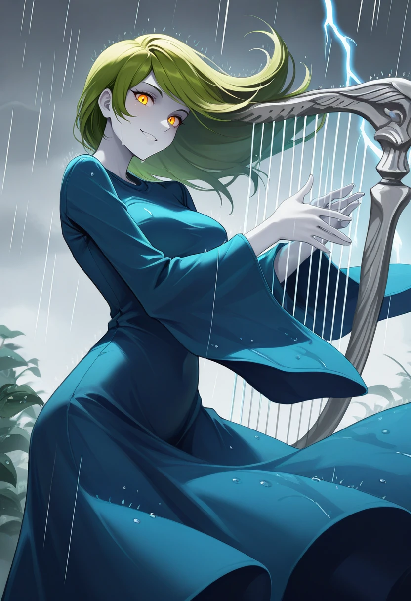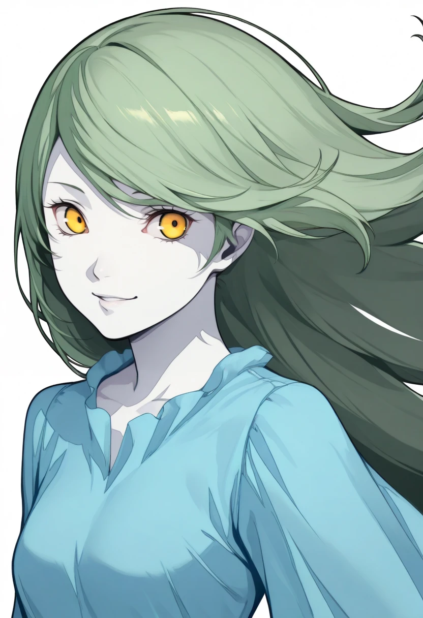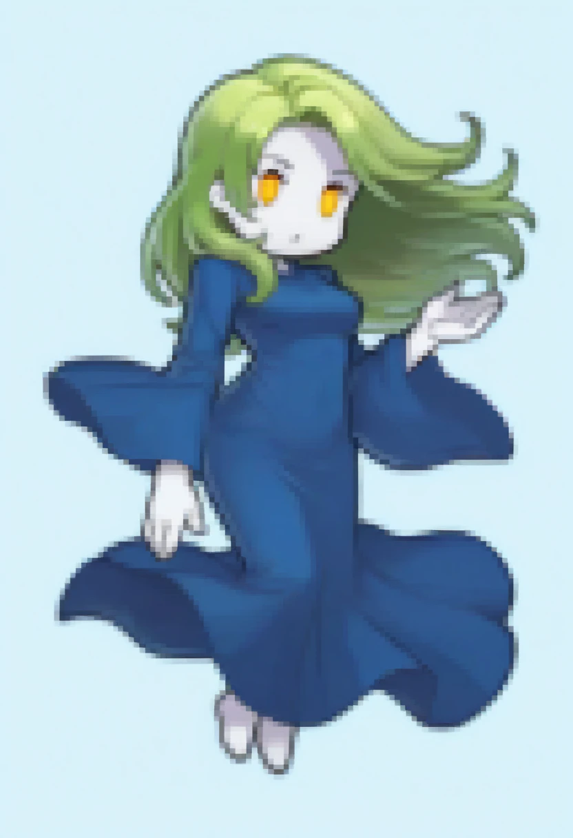 l0r3leismt, green hair, long hair, swept hair, hair blowing in the wind, colored skin, white skin, yellow eyes, blue dress, wide sleeves, long dress