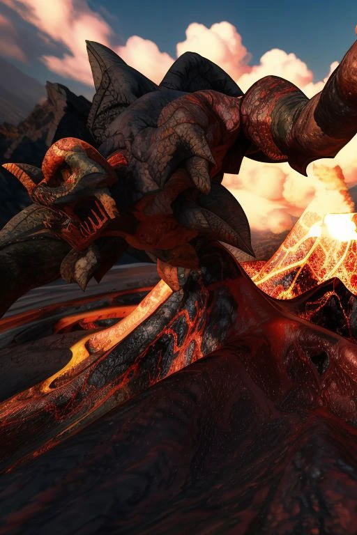 Prompt: Iblis, magma creature, lava, rock skin, green eyes, horns