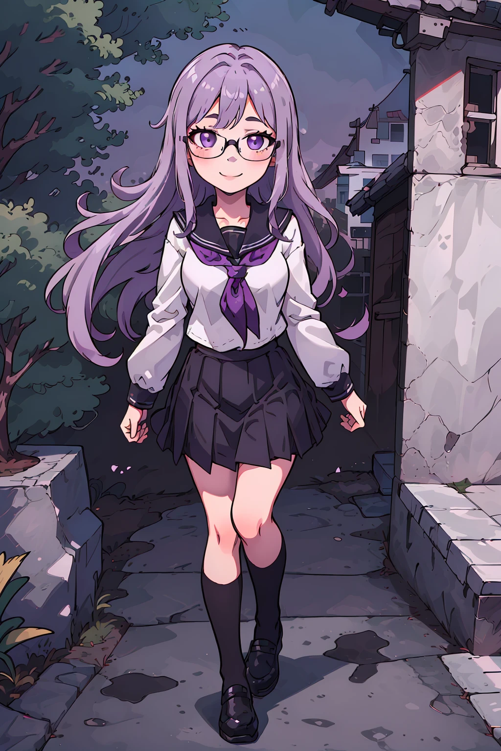 However, seeing as the character's physical characteristics are quite simple (long light purple hair, purple eyes, black-framed glasses), if you want a really different outfit, then it might be better to simply generate the image without using a LoRA at all.