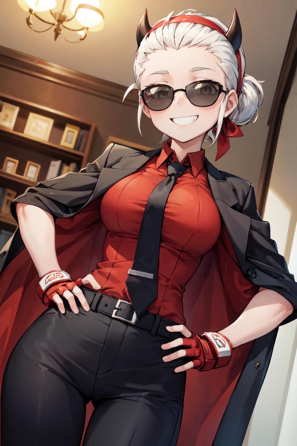 justice, horns, demon girl, demon horns, black horns, gloves, shirt, short hair, red gloves, red shirt, fingerless gloves, jacket, black jacket, necktie, black necktie, pants, sunglasses, blunt bangs, hairband, hair slicked back,