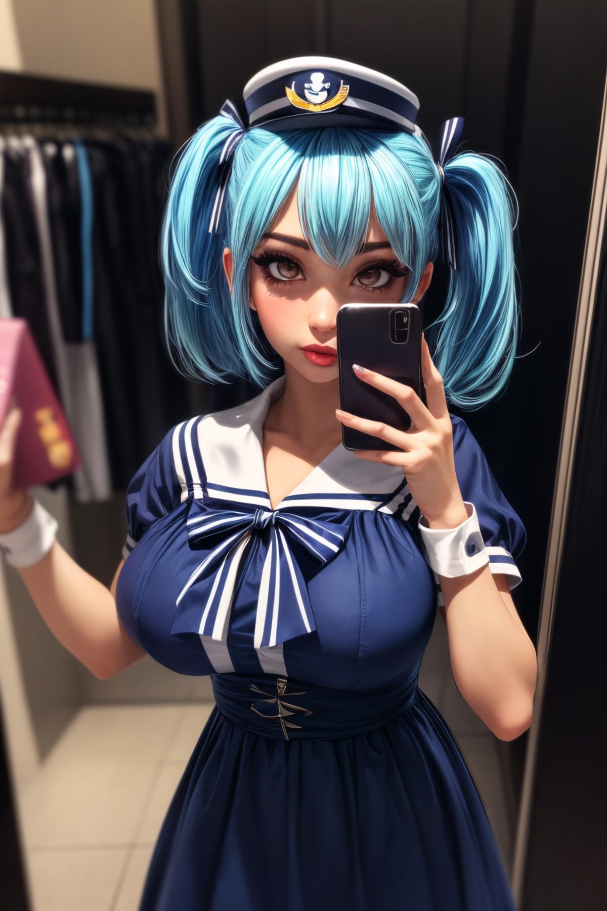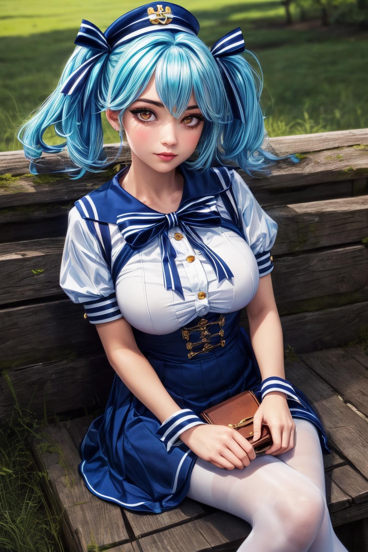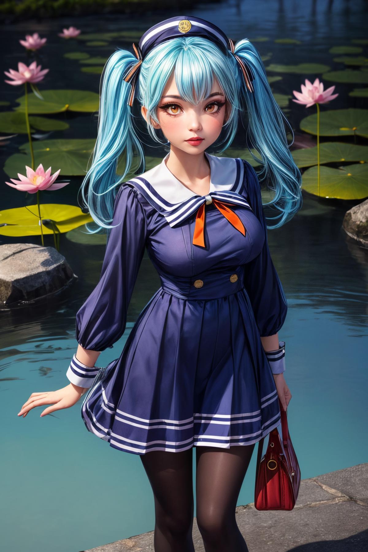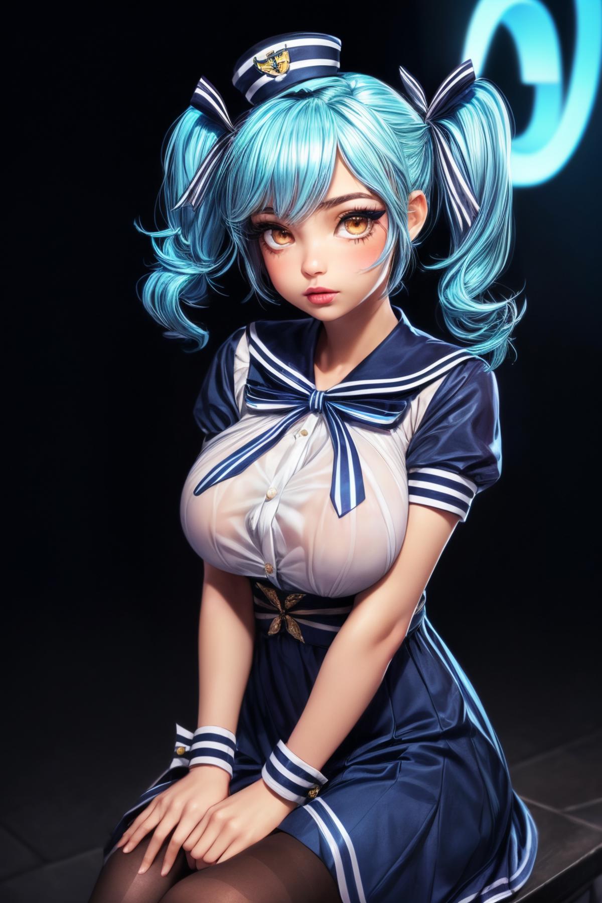 Outfit: dress, sailor dress, hat, two side up, looking at viewer, ribbon, blue dress, wrist cuffs, striped pantyhose, dixie cup hat, bag, sailor collar, short sleeves, sailor, bow,