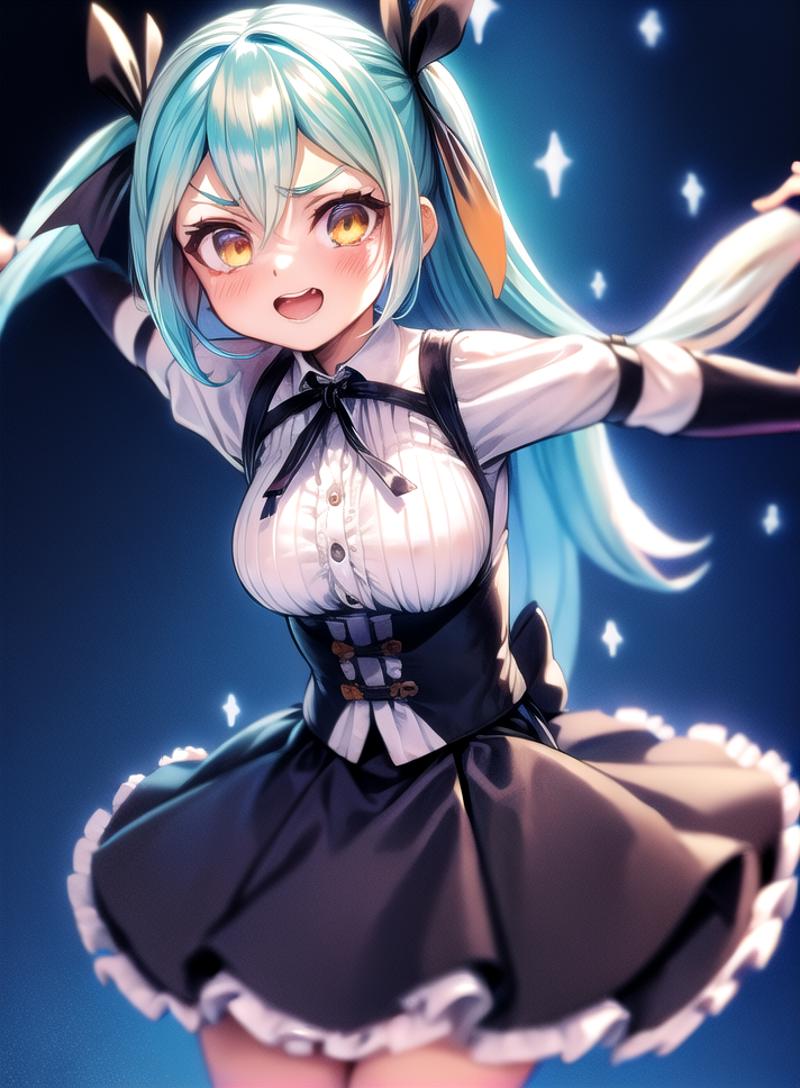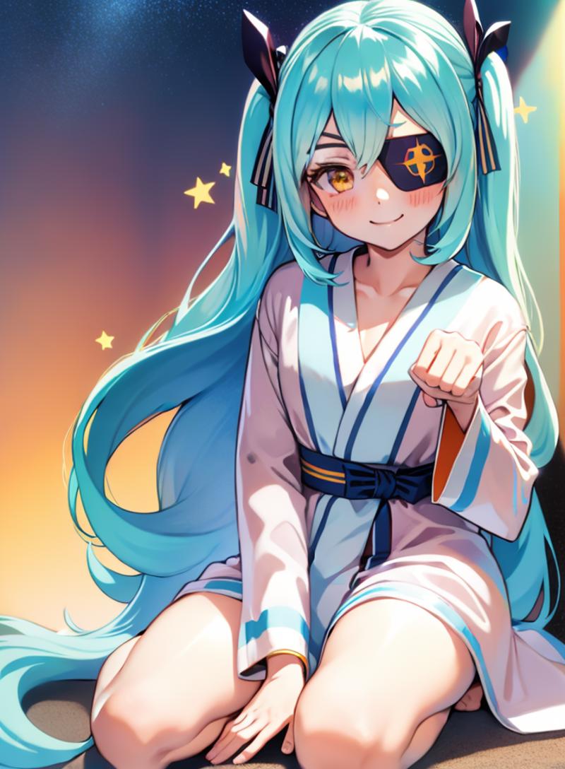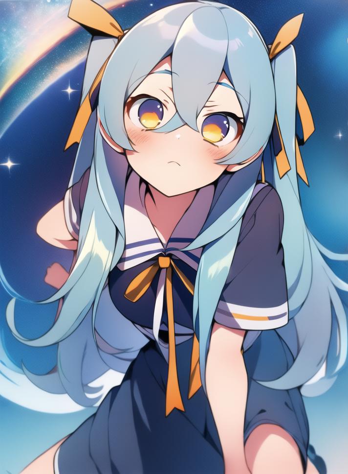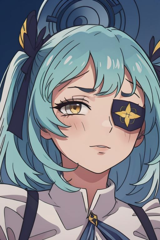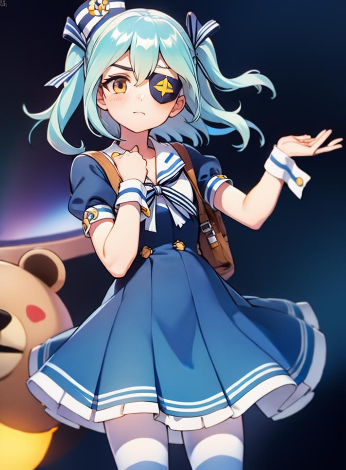 Appearance: 1girl, twintails, blue hair, yellow eyes, blush, hair ribbon, medium hair, light blue hair, orange eyes, bangs, two side up, eyepatch