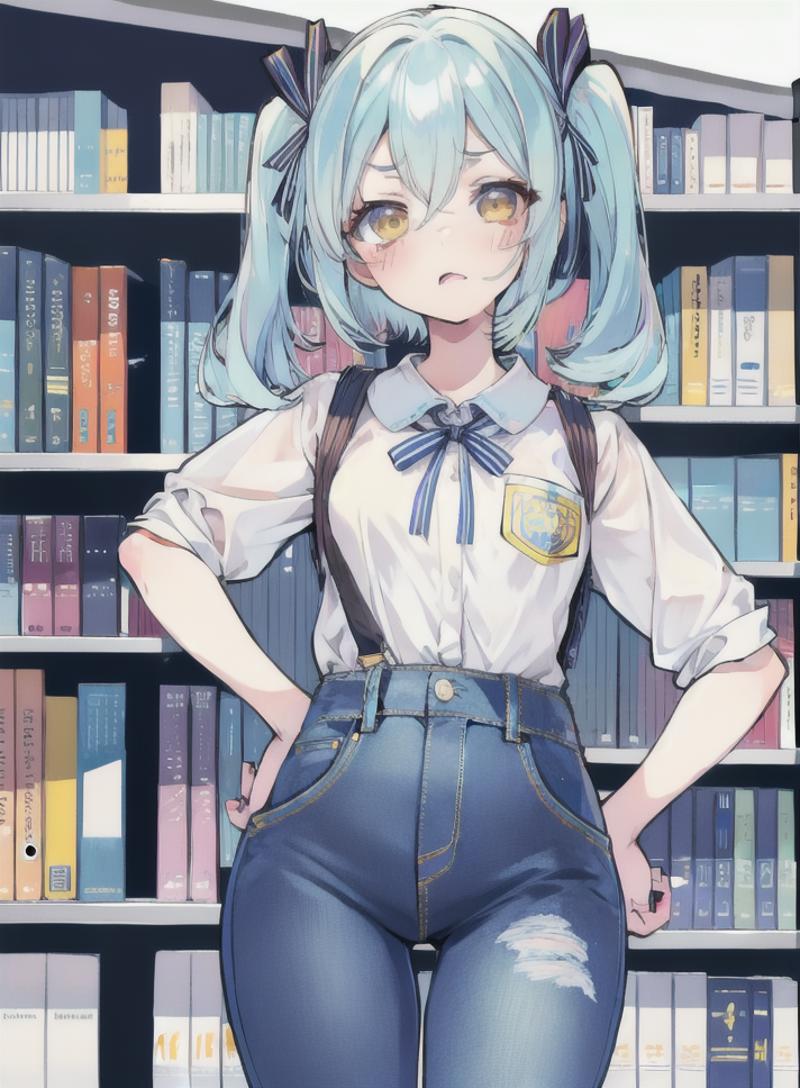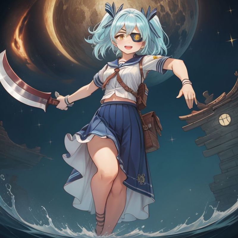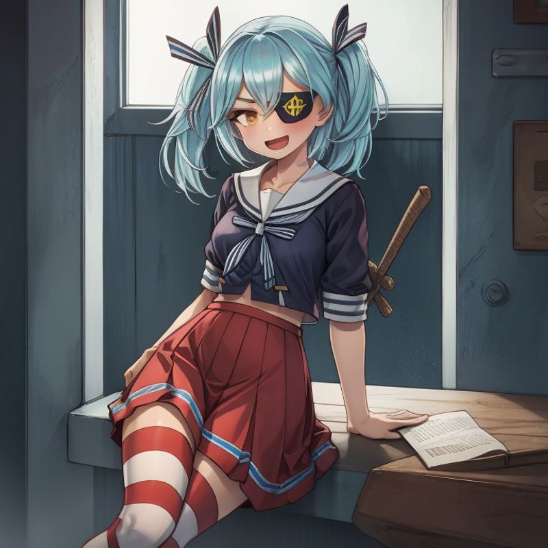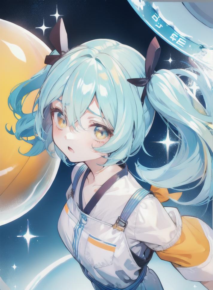 Appearance: 1girl, twintails, blue hair, yellow eyes, blush, hair ribbon, medium hair, light blue hair, orange eyes, bangs, two side up, eyepatch