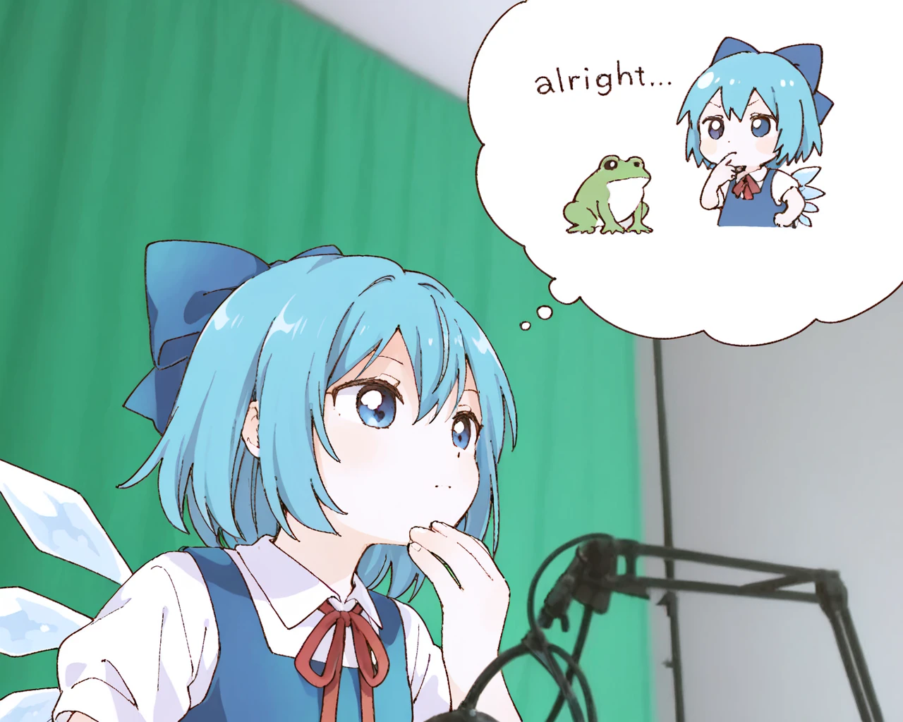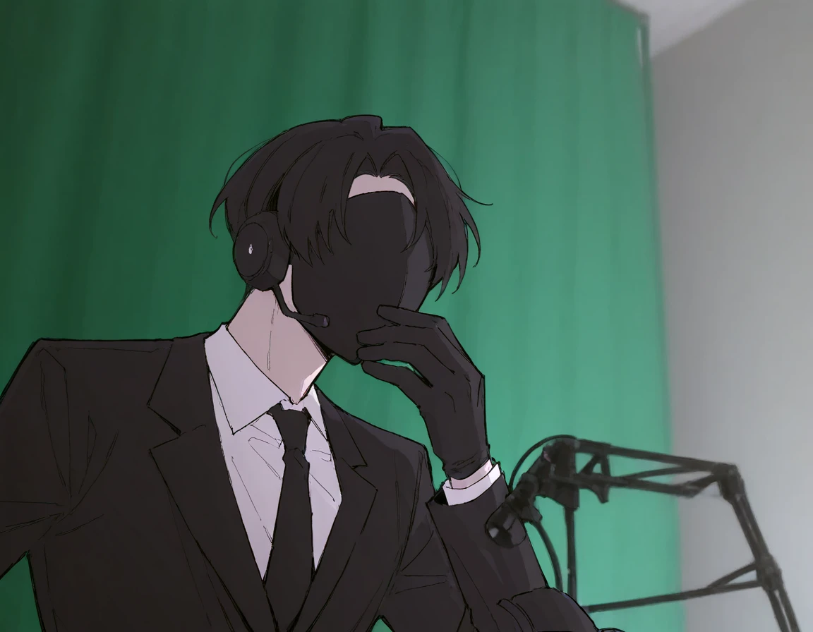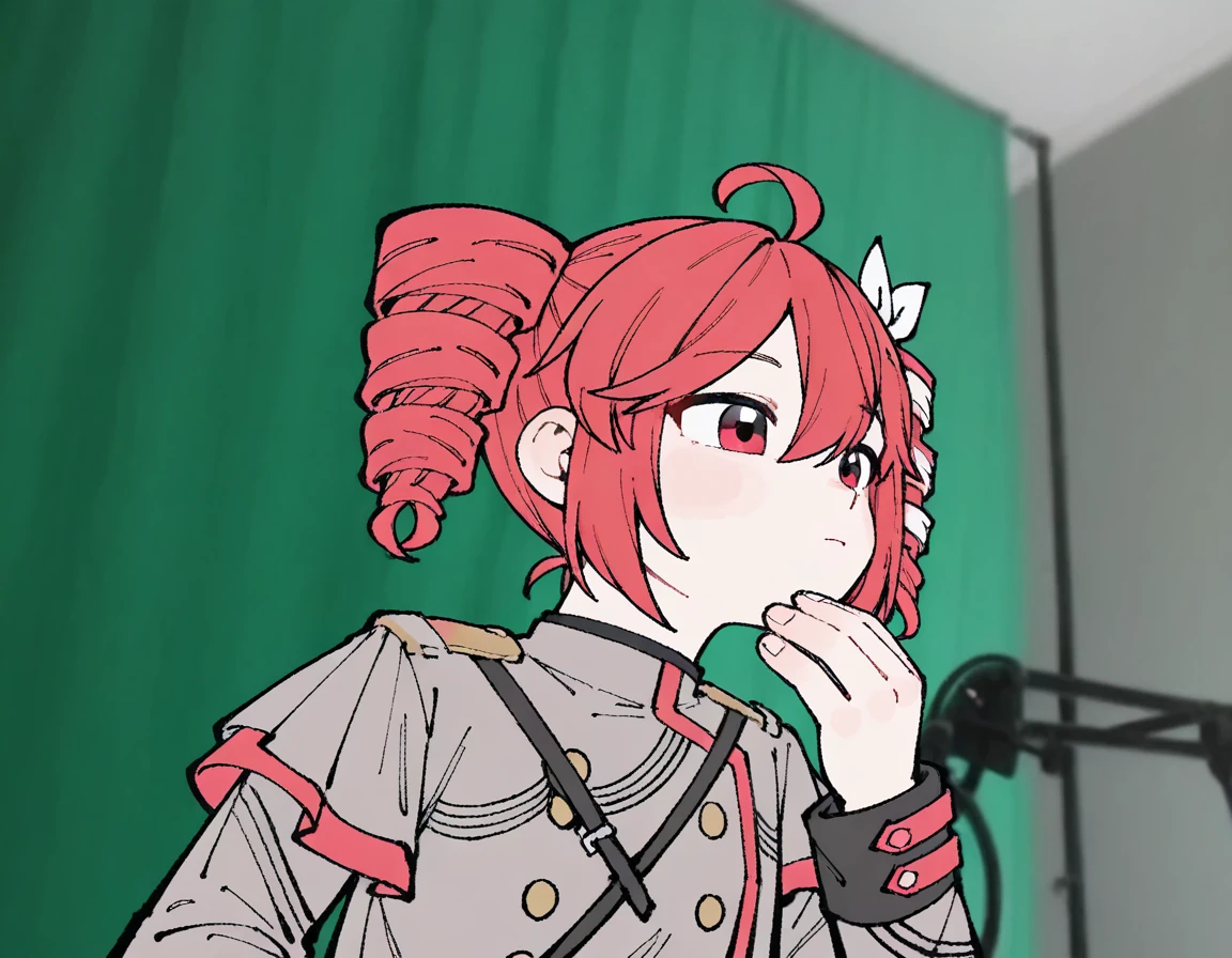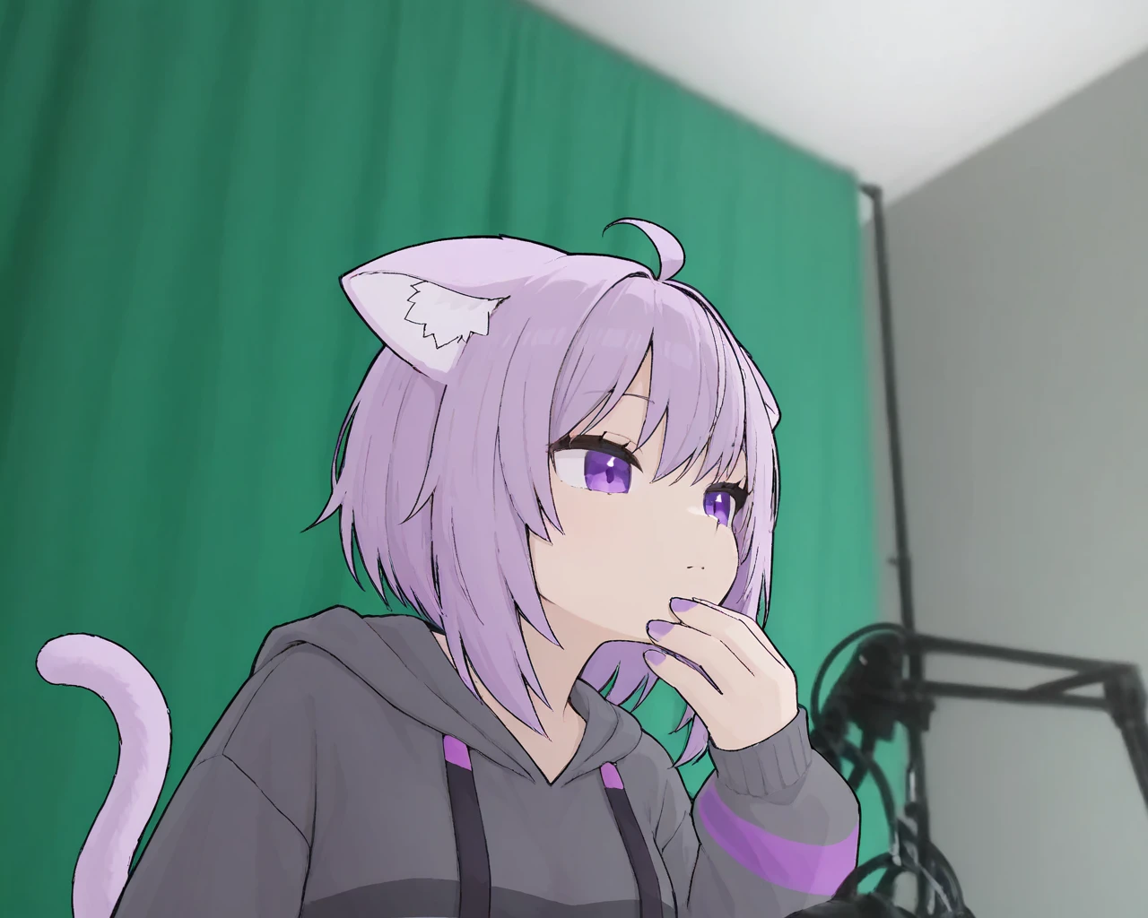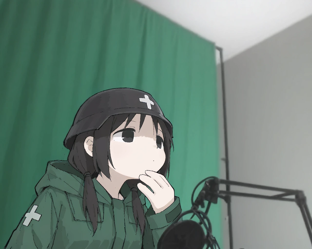 forsencam, solo, upper body, indoors, green curtains, microphone, looking ahead, hand on own chin, microphone stand, thinking
