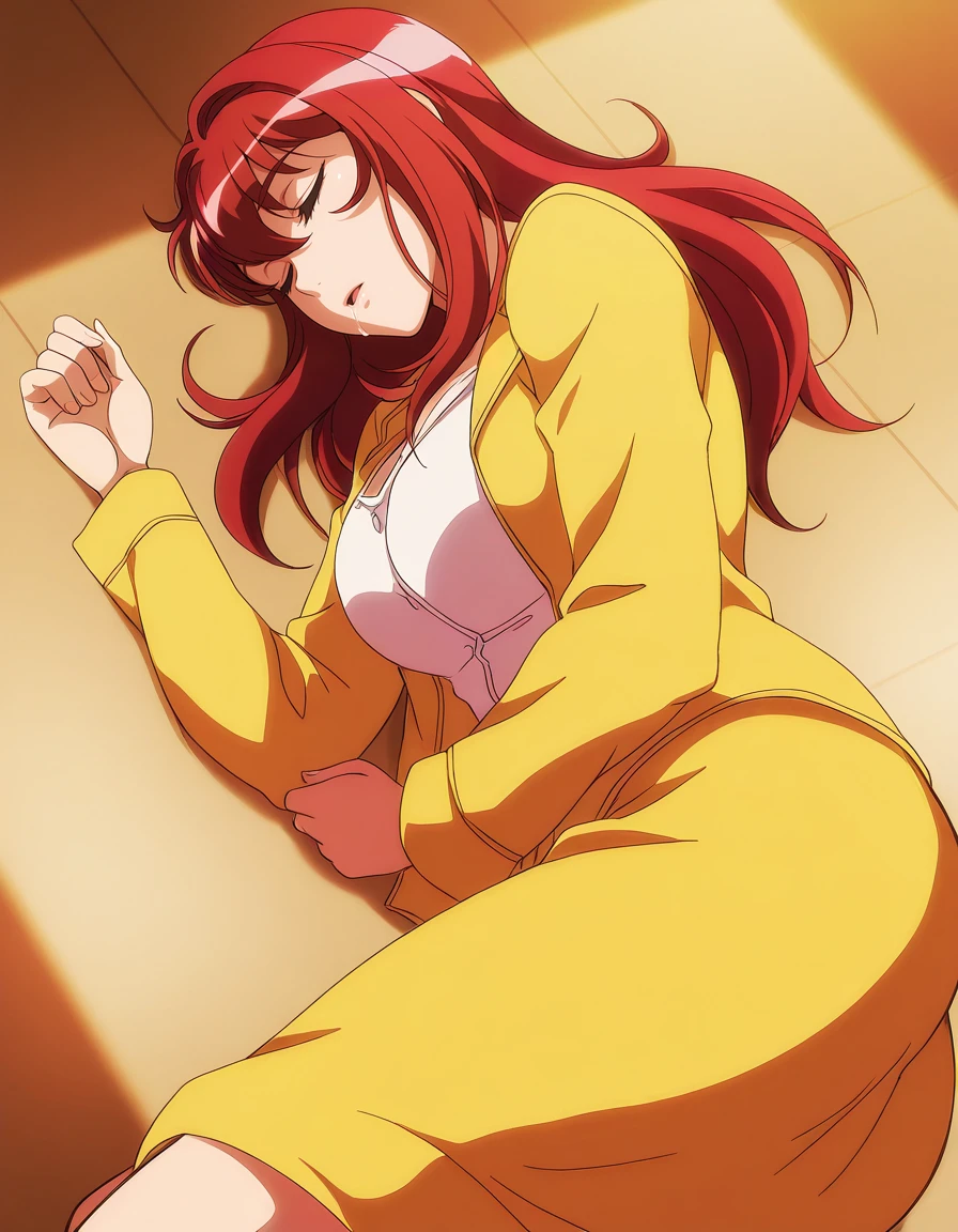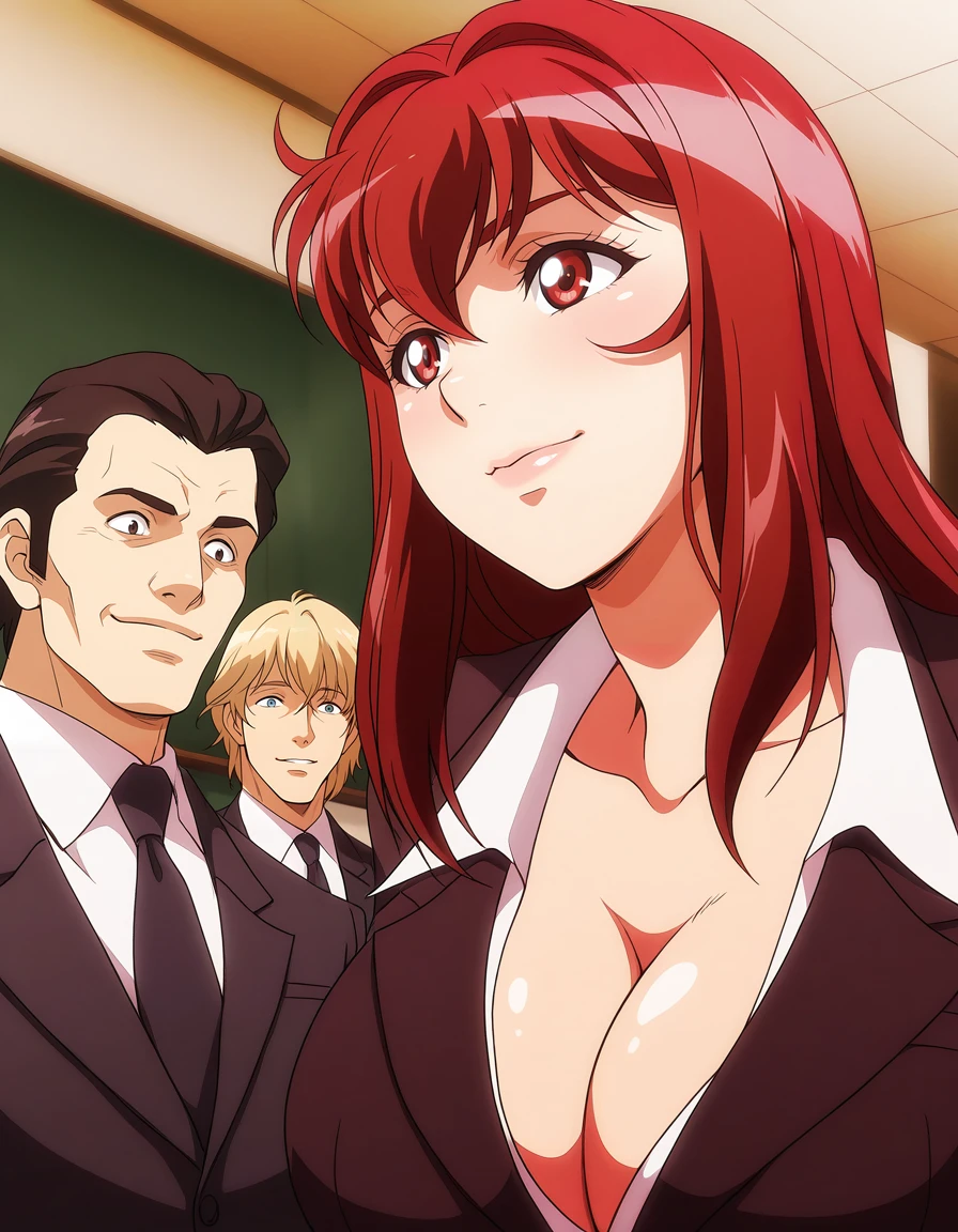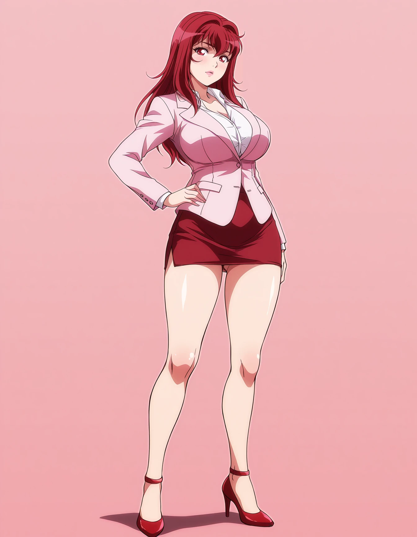 mai_yurinatnk,long_hair,red_hair,red_eyes,pink_lips,large_breasts,white_t-shirt,suit,pink_jacket,pencil_skirt,red_skirt,bare_legs,red_high_heels,cleavageRecommend preferred Strength: 1~2.