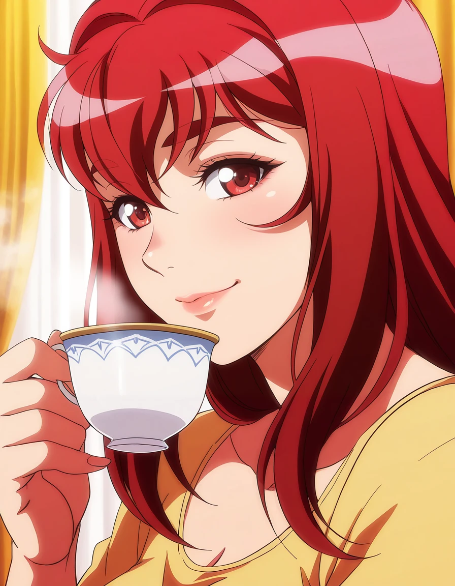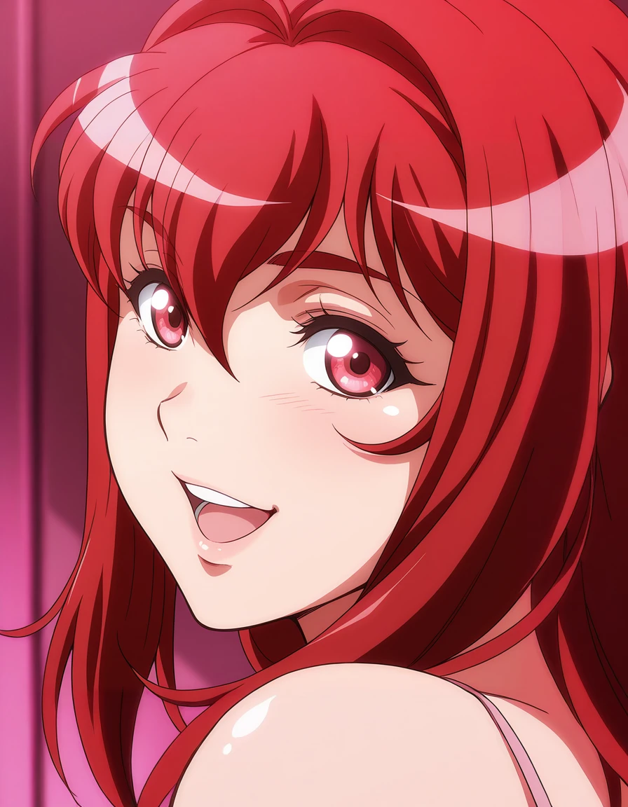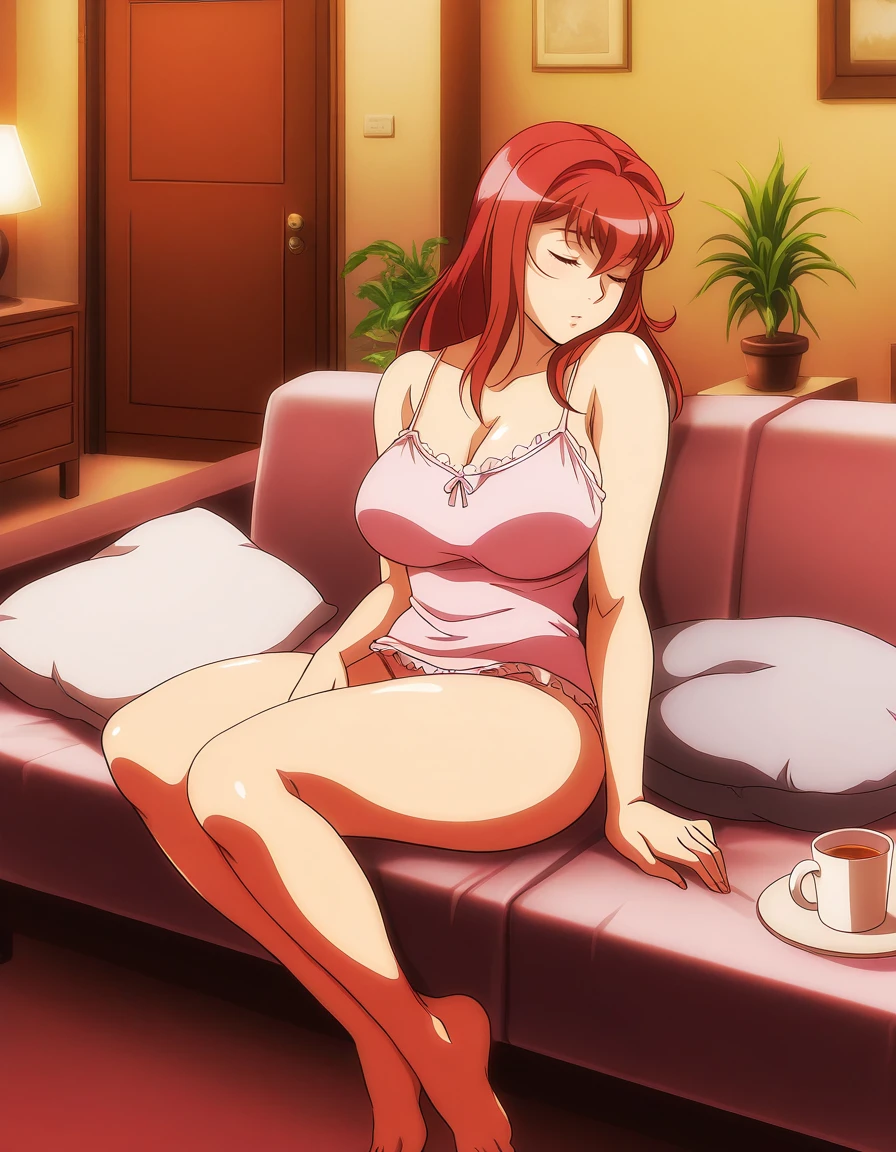 mai_yurinatnk,long_hair,red_hair,red_eyes,pink_lips,large_breasts,white_t-shirt,suit,pink_jacket,pencil_skirt,red_skirt,bare_legs,red_high_heels,cleavageRecommend preferred Strength: 1~2.