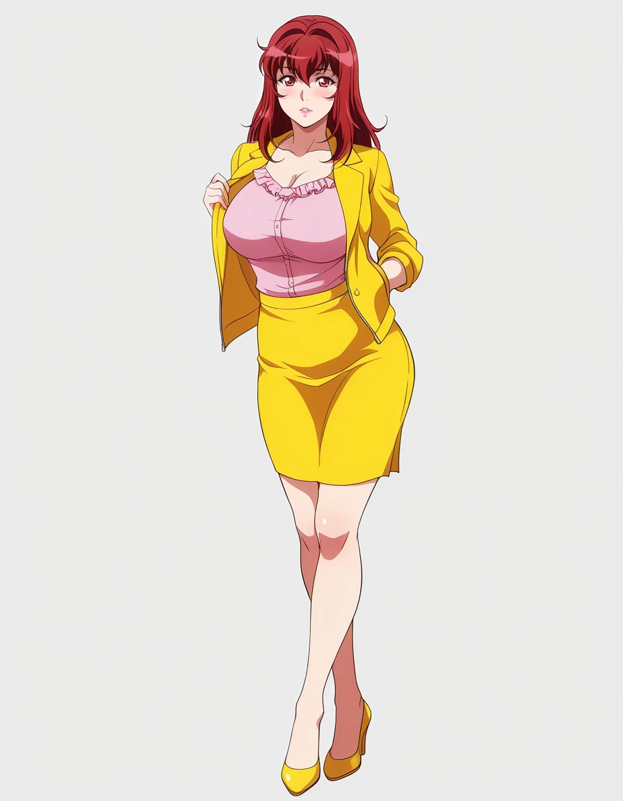 mai_yurinatnk,long_hair,red_hair,red_eyes,pink_lips,large_breasts,white_t-shirt,suit,pink_jacket,pencil_skirt,red_skirt,bare_legs,red_high_heels,cleavage