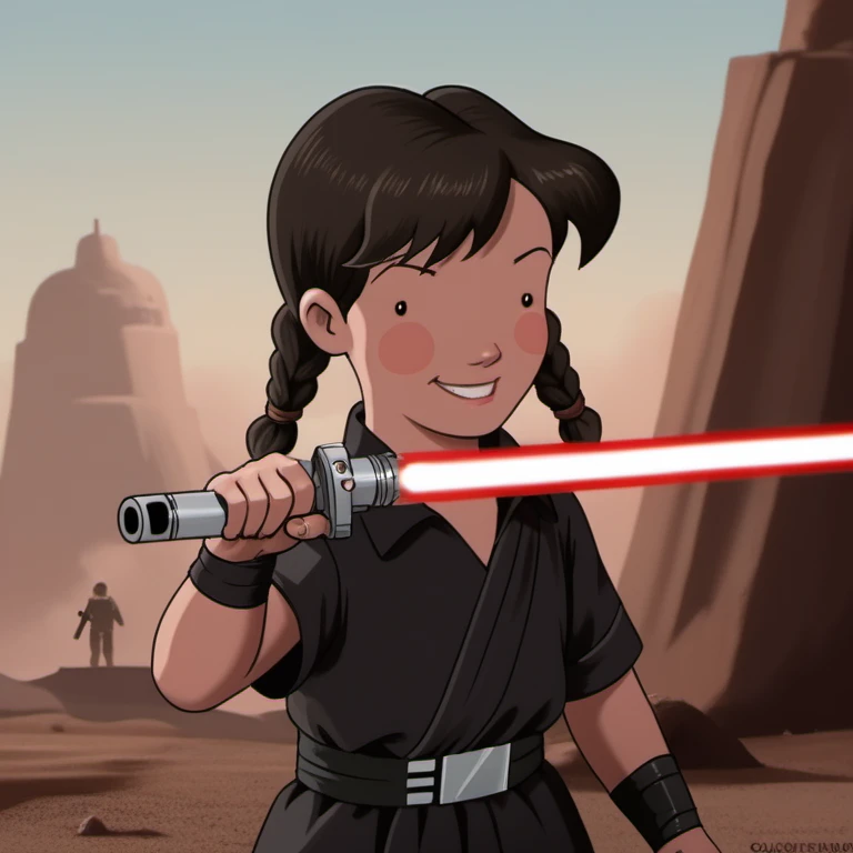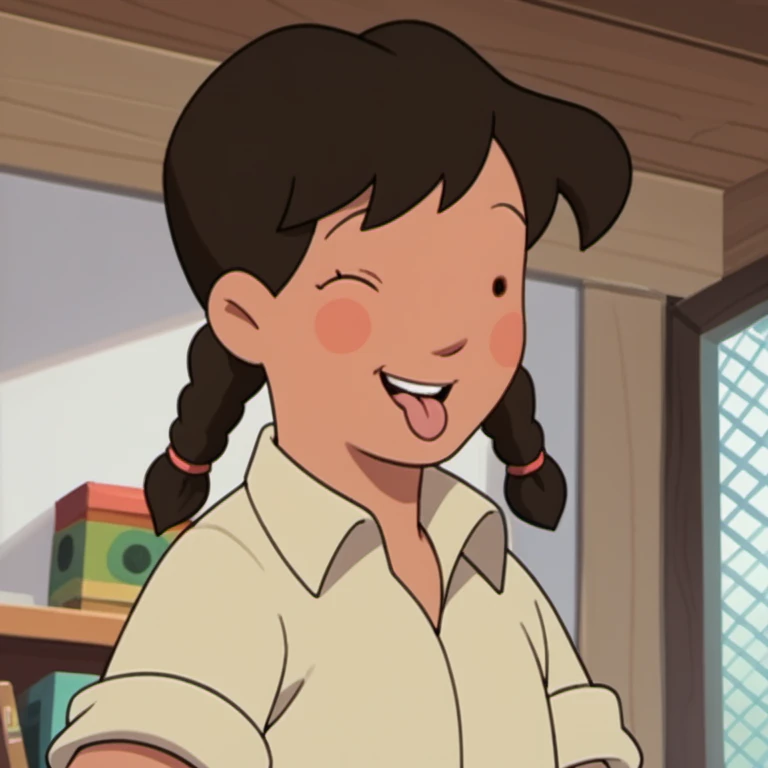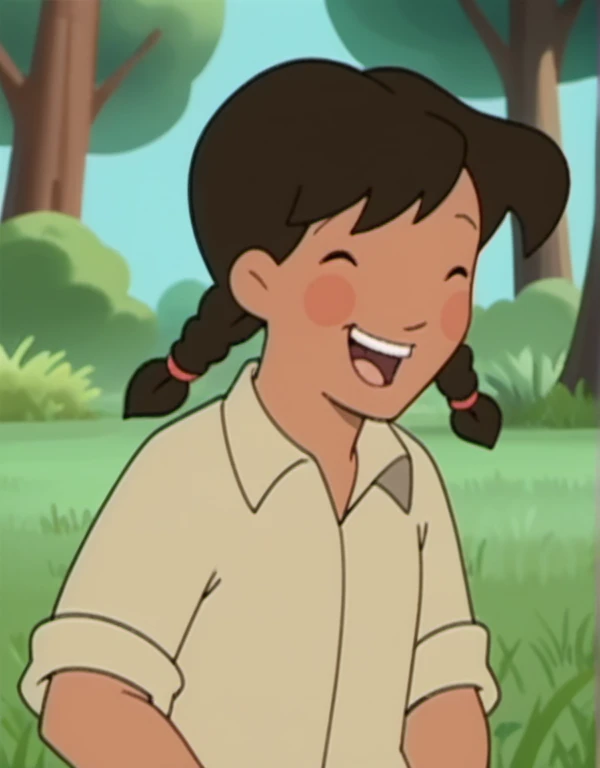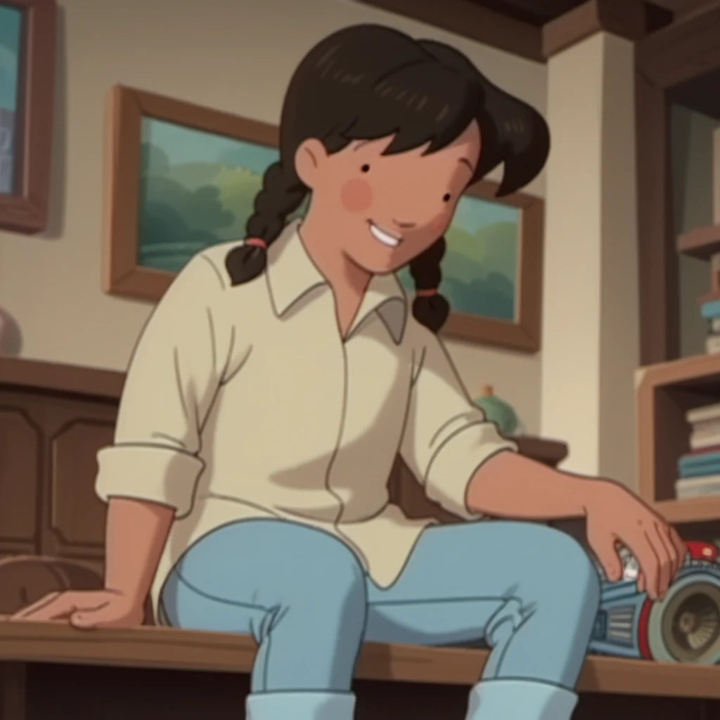 solo, 1girl, brown hair, twin braids, pants, shirt, smile, shoes, sleeves rolled up, blush stickers, black dot eyes, pants rolled up