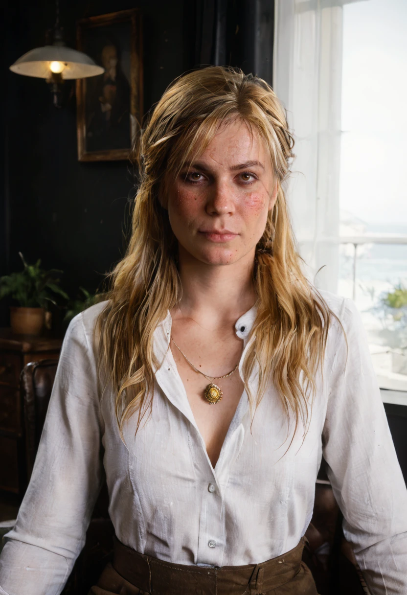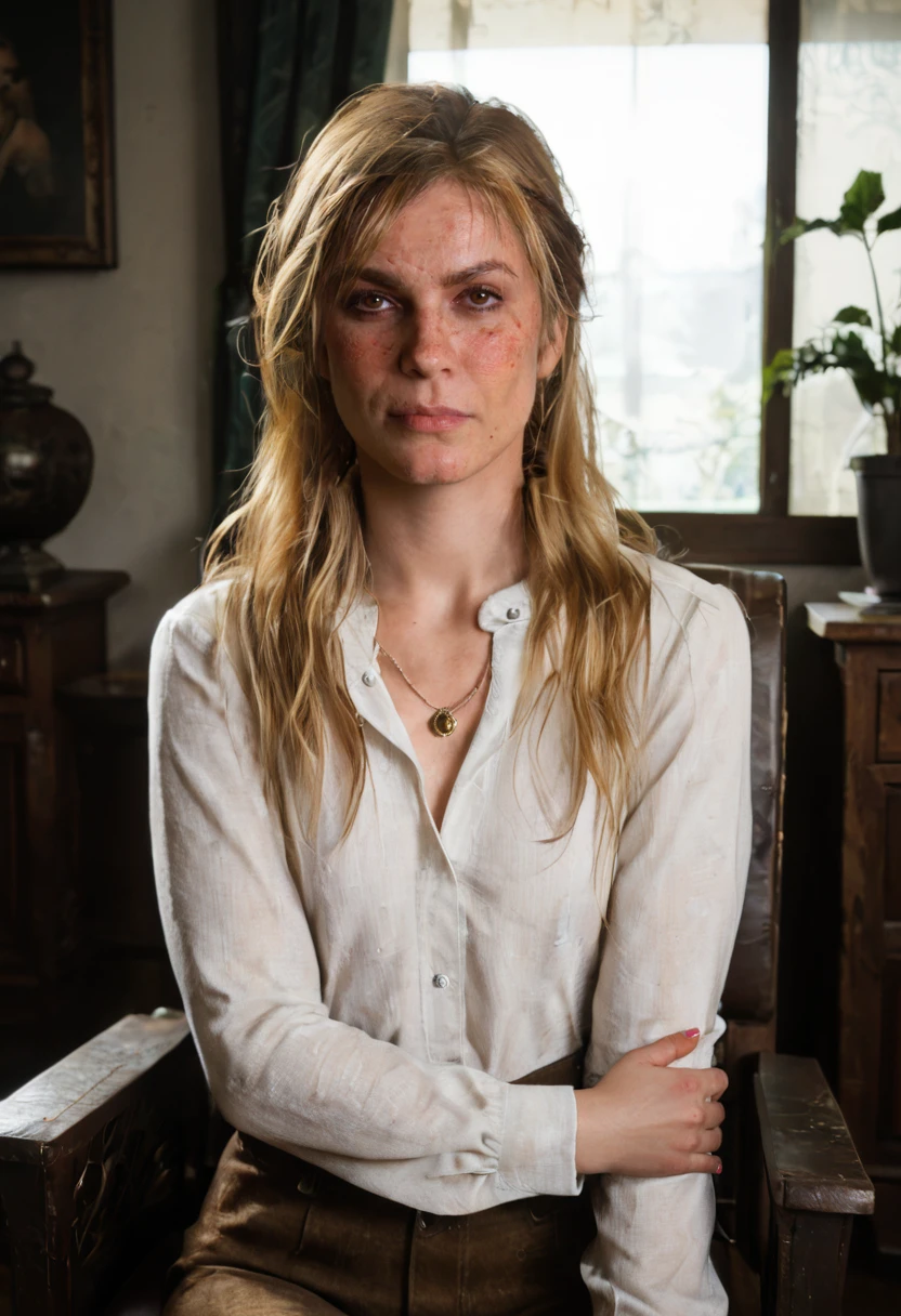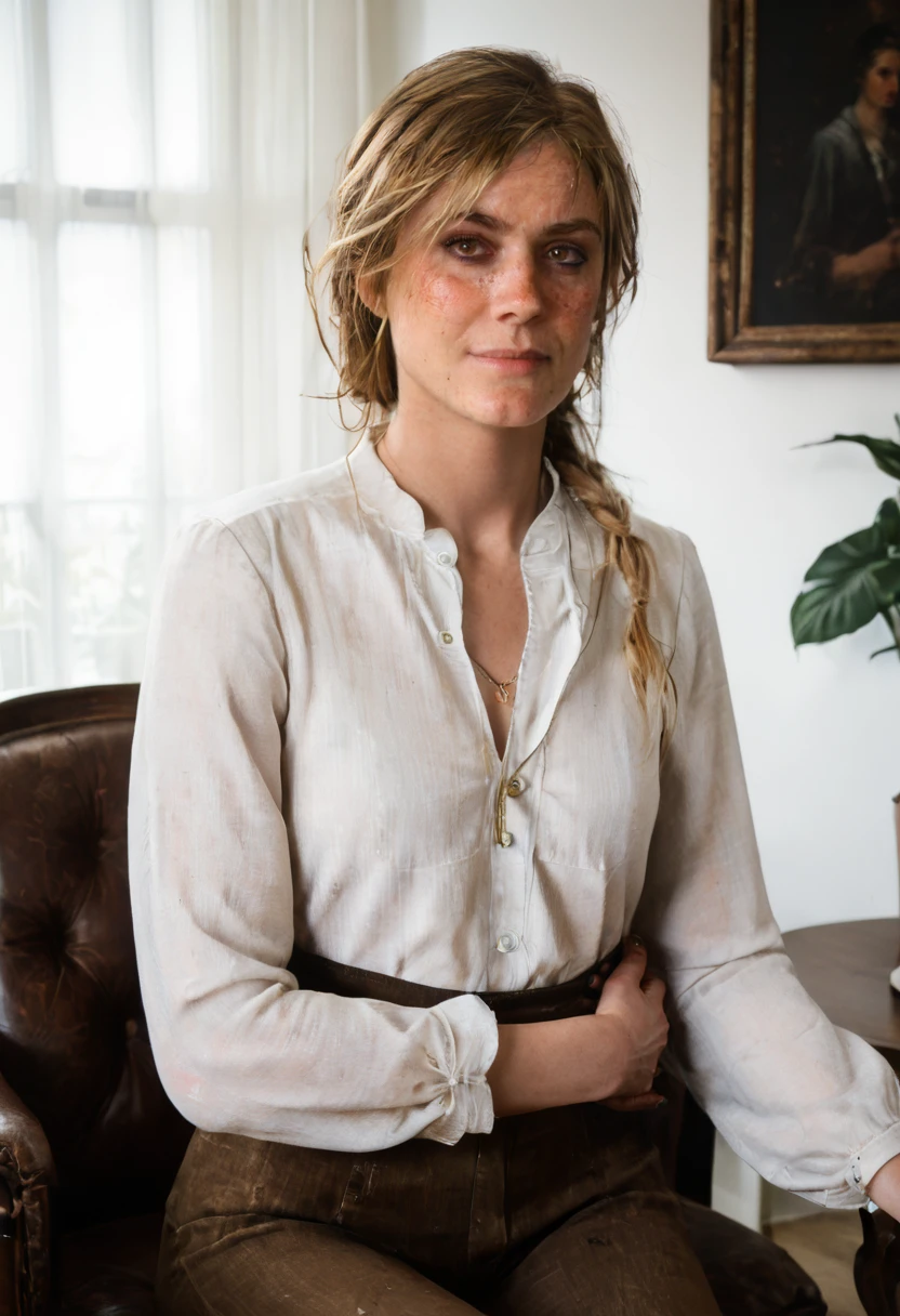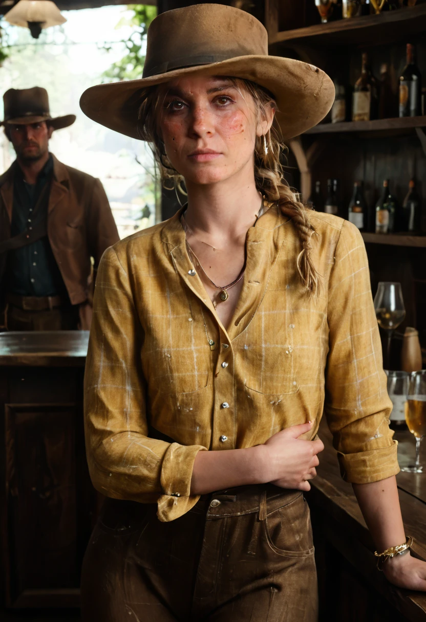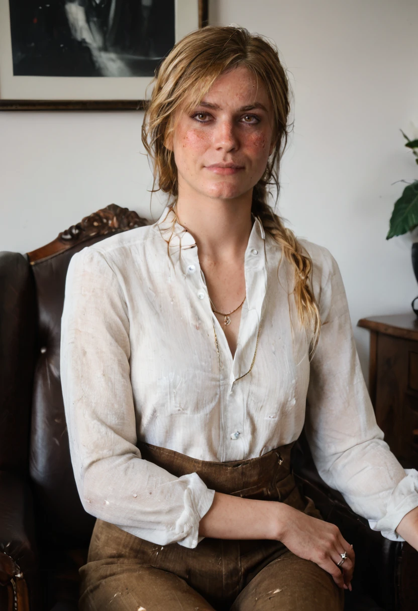 Use : "blonde,single braid,long braid,brown eyes,freckles,sadie_adler,yellow plaid shirt brown pants,sadie adler" + the Lora.