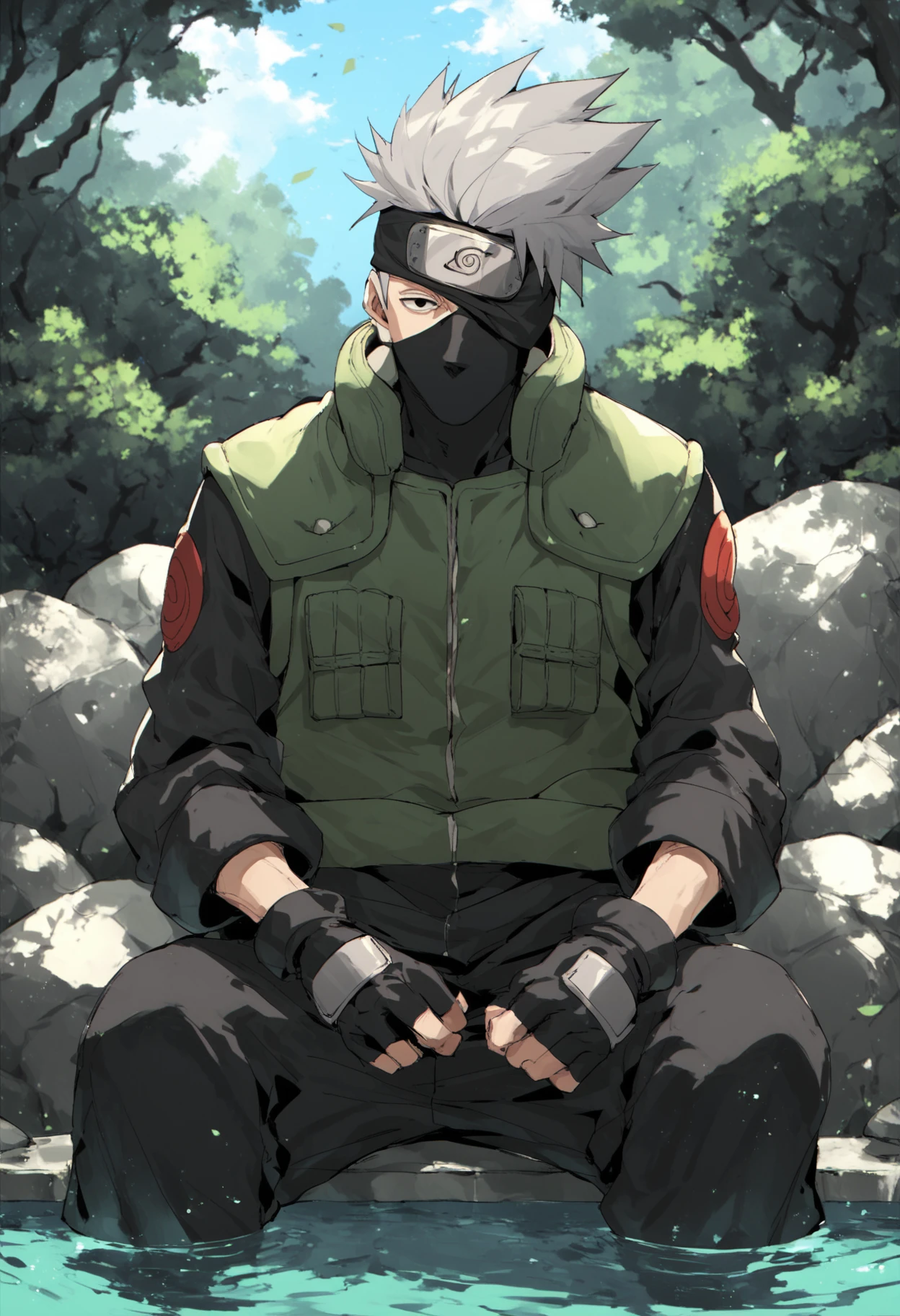 For images with both eyes showing, use "scar across his left eye" (either do not include "forehead protector covering his left eye" or just use "forehead protector" by itself). If an eye shows up as red, put "red eye" and/or "sharingan eye" in negative prompt.