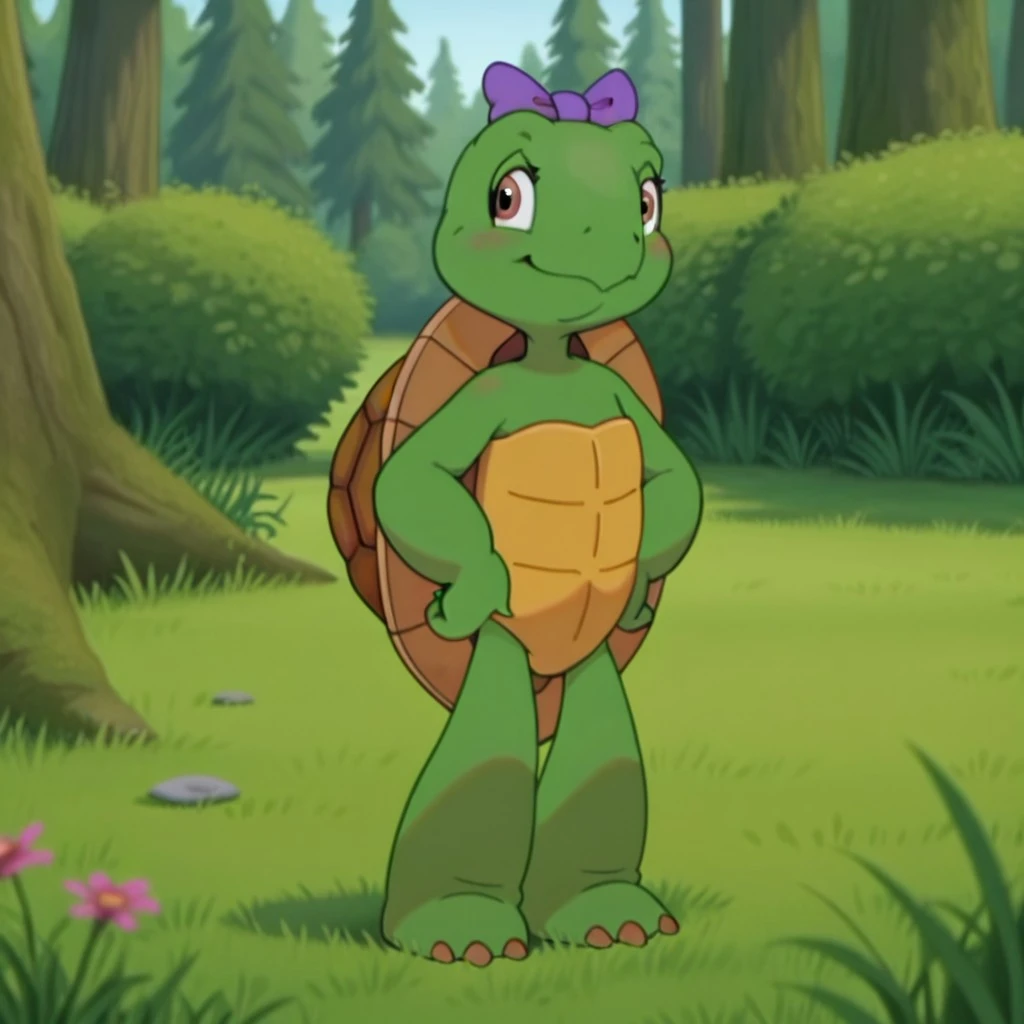Harrietturtleil, semi-anthro, female turtle, green skin, brown eyes, turtle shell, purple hairbow
