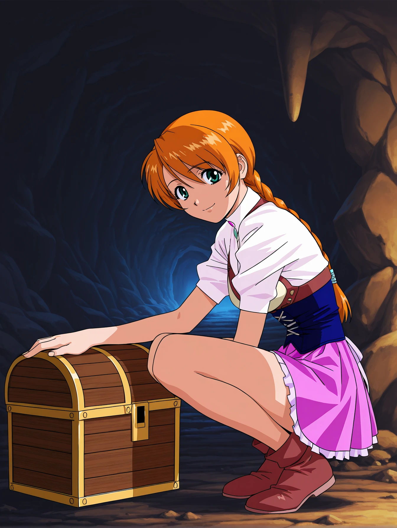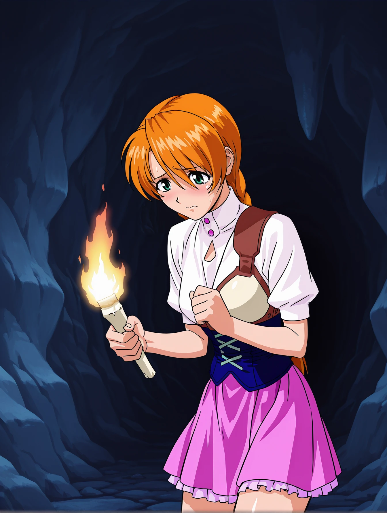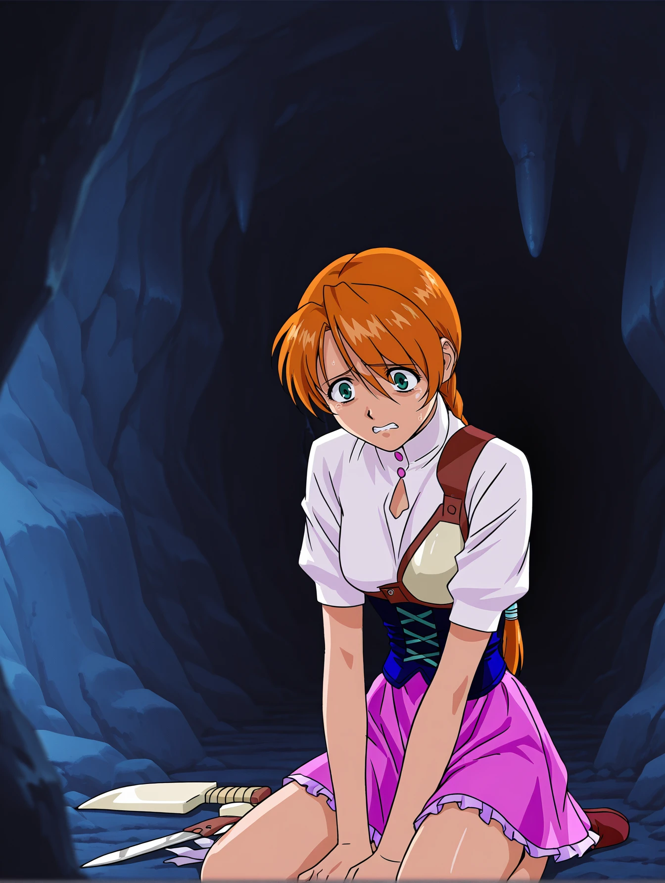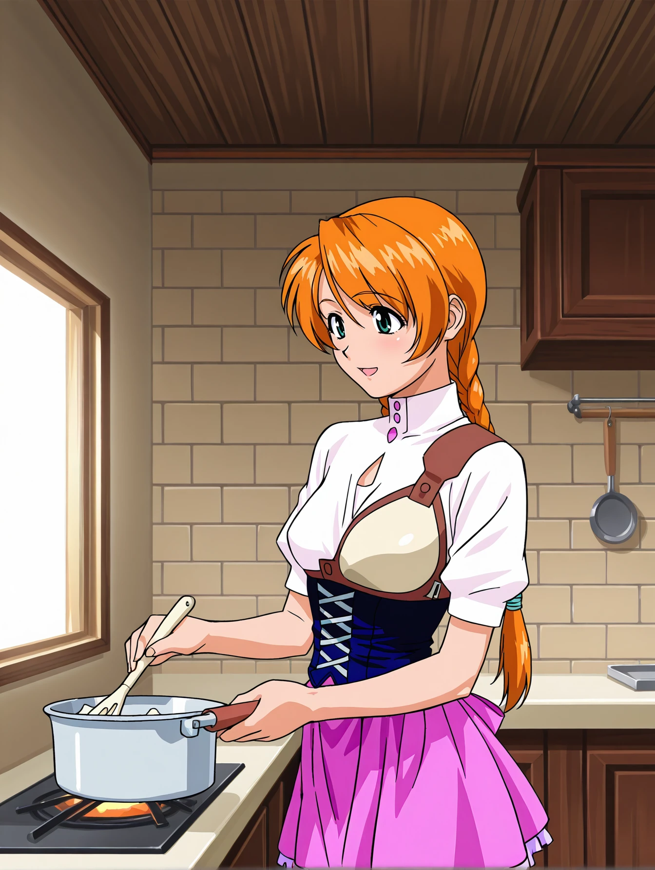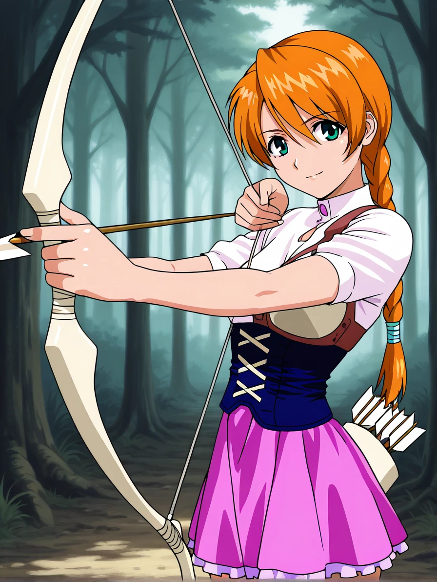 outfit: white shirt, short sleeves, blue corset, pink skirt