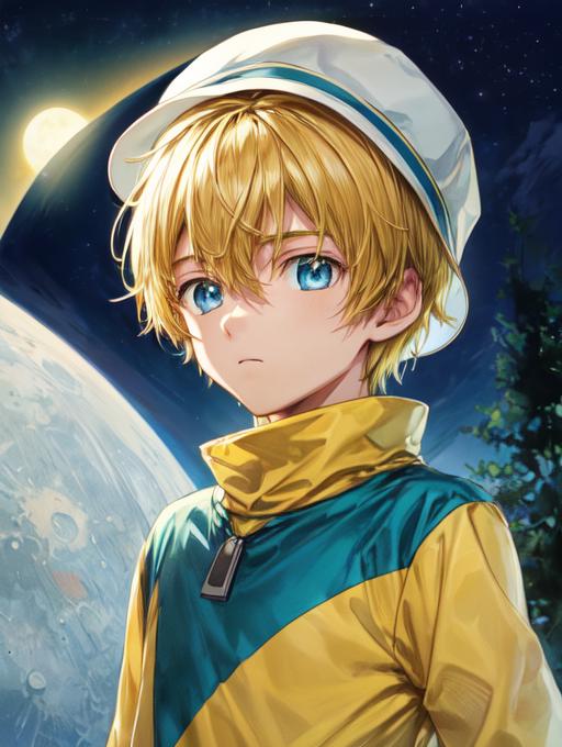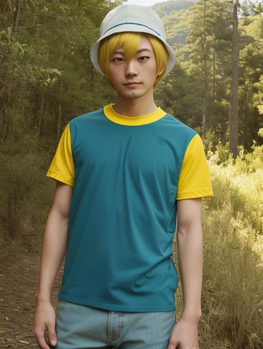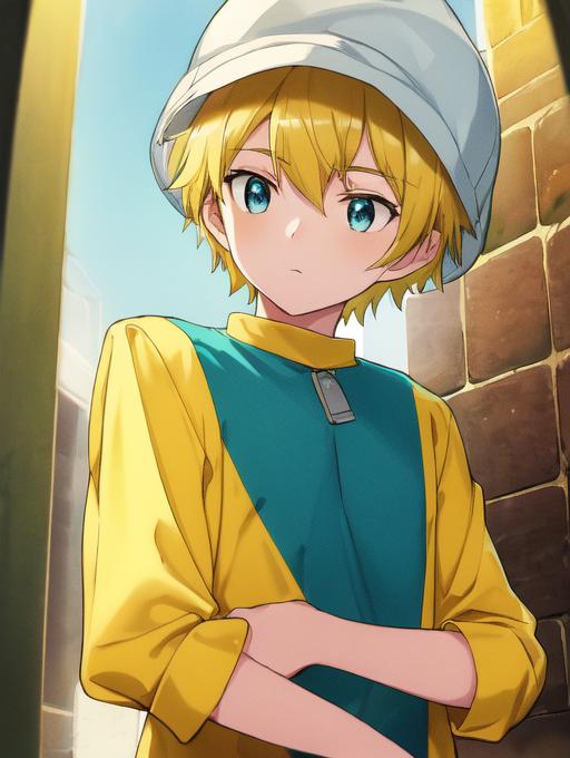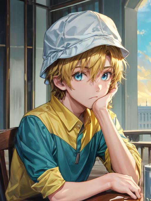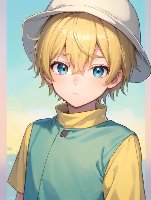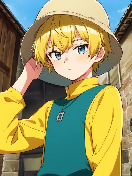 Additional words that may help: blonde hair, hat, blue eyes, turquoise and yellow shirt, hat