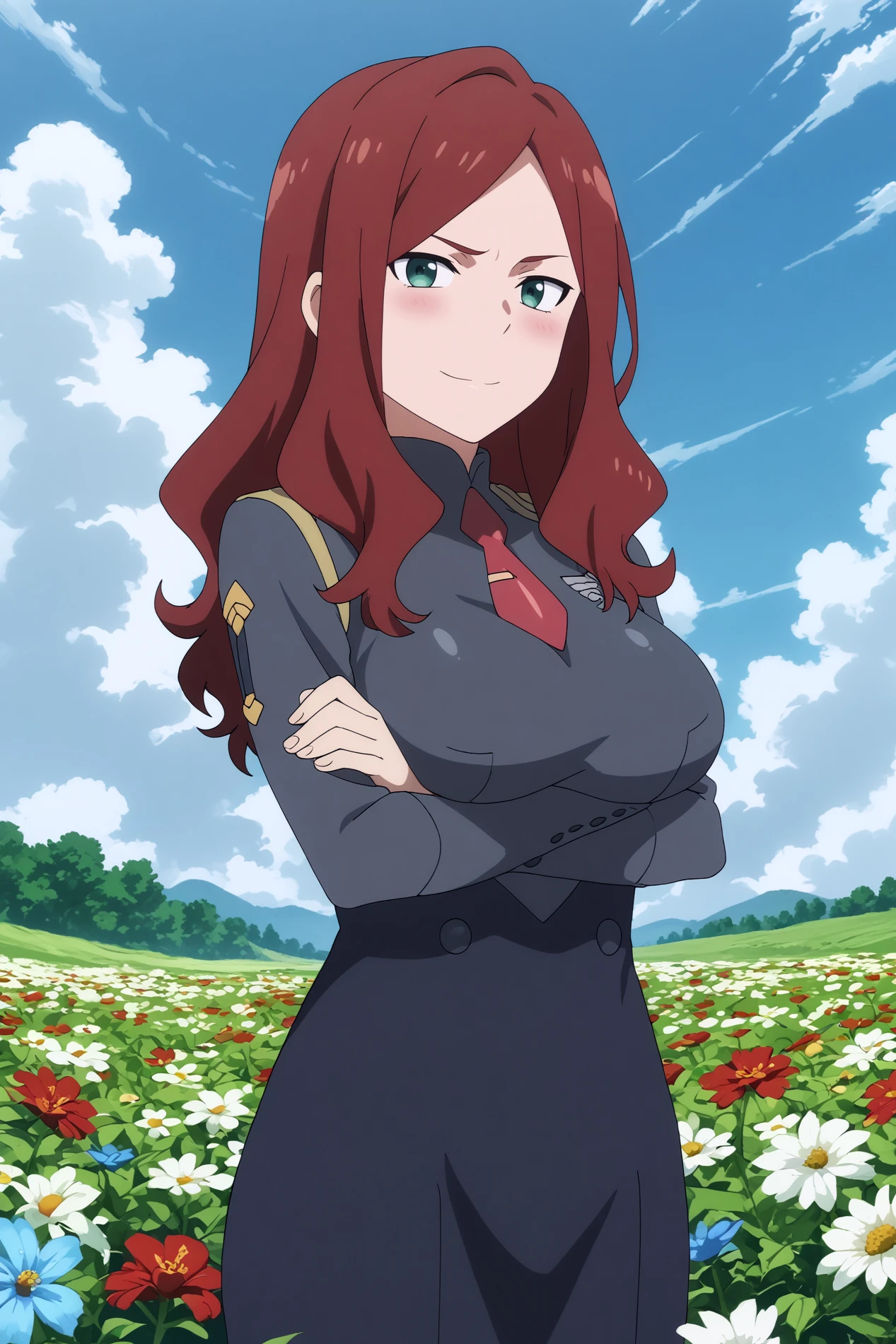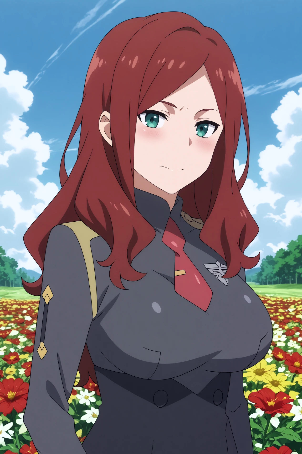 Triggers : nana,1girl,solo,long hair,uniform,military_uniform,brown hair,necktie,breasts,large breasts