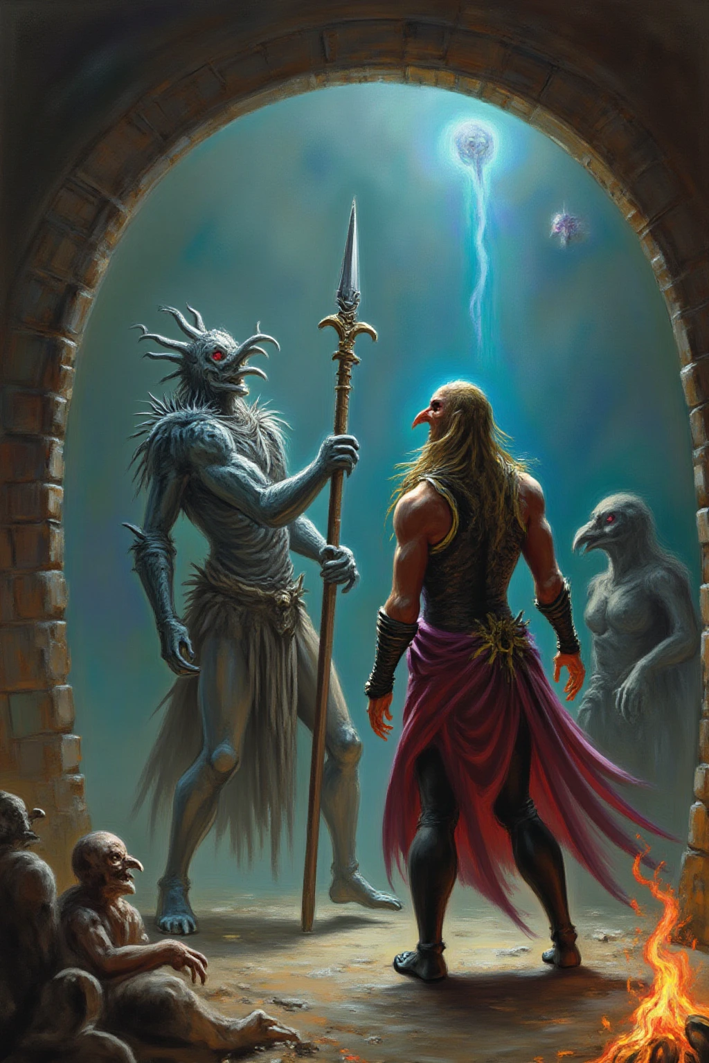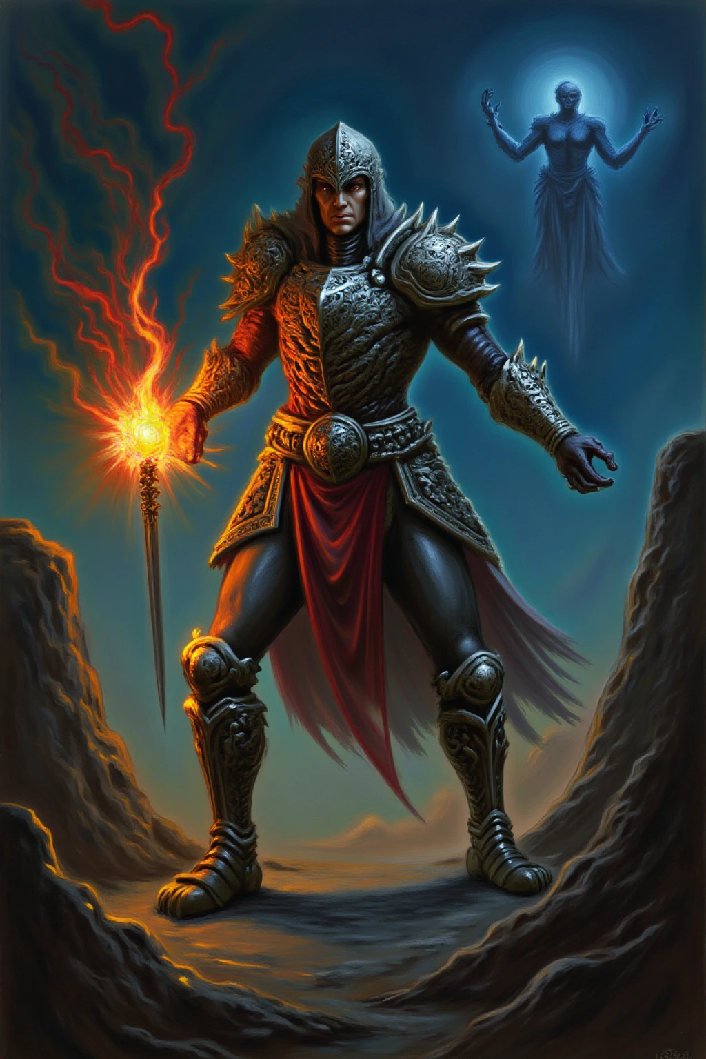 In the foreground, there appears to be a person standing on the edge of the cliff, holding a sword and shield. The person is wearing a blue robe and a hat, and is holding a staff in their right hand. The dog is standing next to the person, looking up at the dragon. The overall mood of the illustration is peaceful and serene.