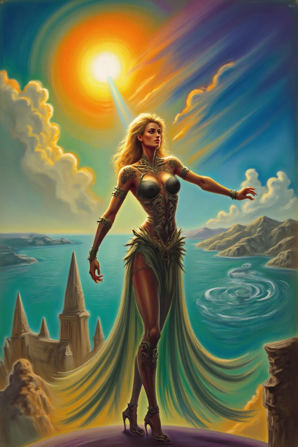 The image is a digital illustration of a fantasy landscape with a large pink and blue dragon on the right side of the image. The dragon is standing on a rocky cliff overlooking a body of water. On the left side, there is a tree with pink smoke coming out of its branches. In the background, there are mountains and a full moon. The sky is filled with clouds and there are two birds flying in the distance.