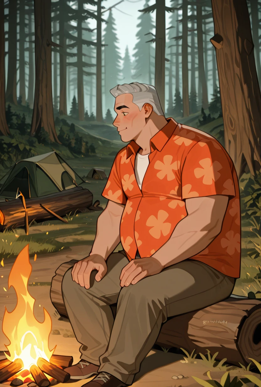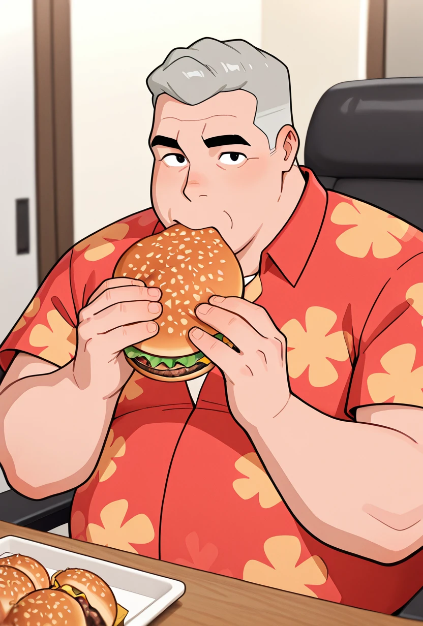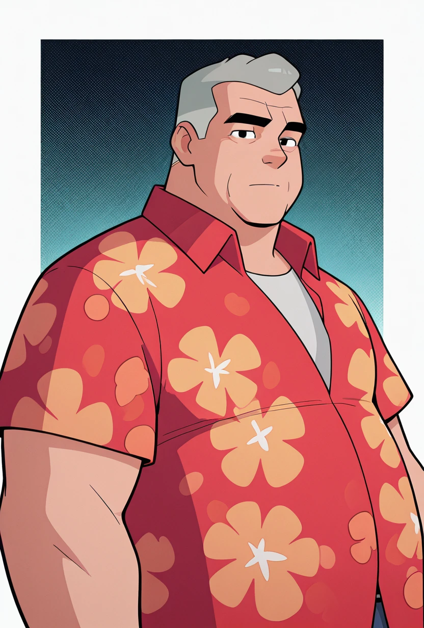 max, collared red shirt, grey hair, 1boy, short hair, short sleeves, red hawaiian shirt, floral print, chubby