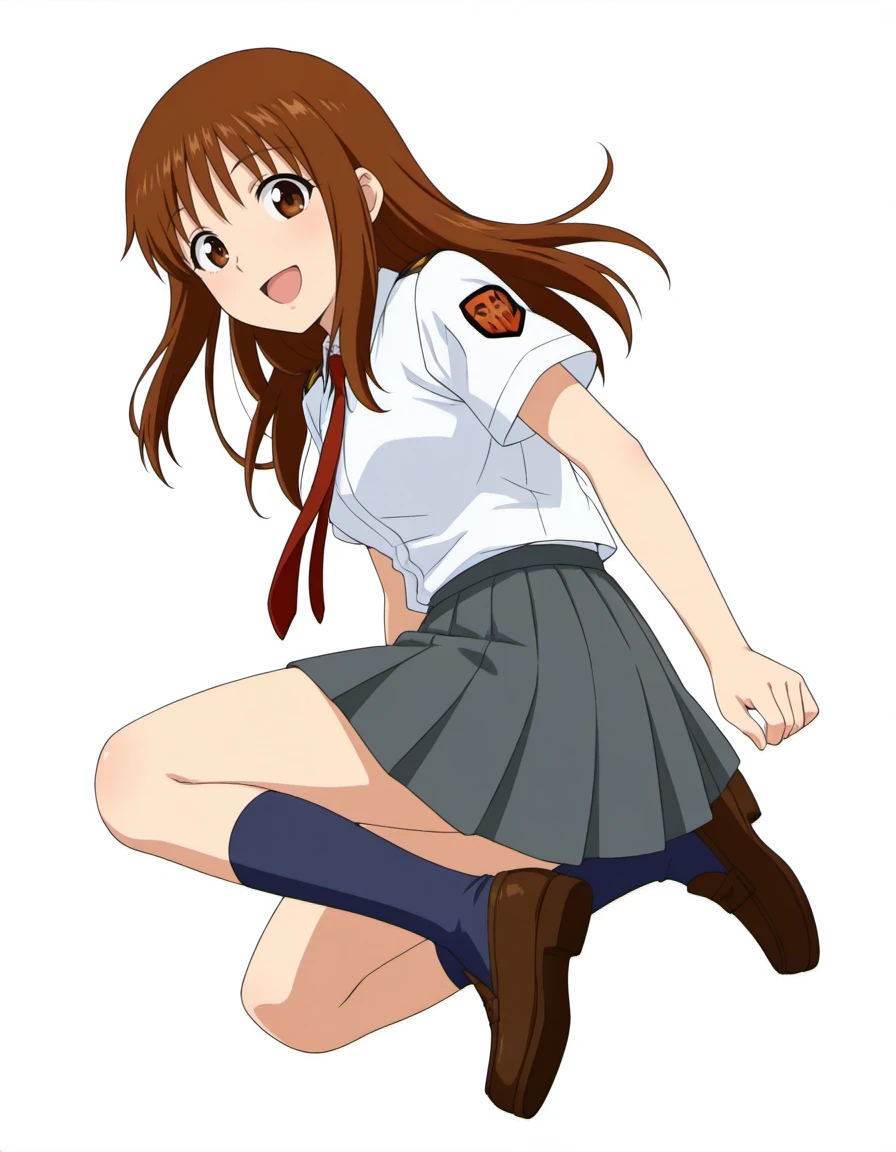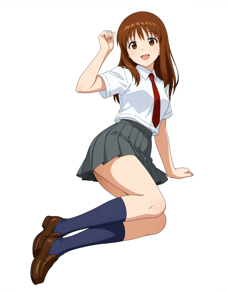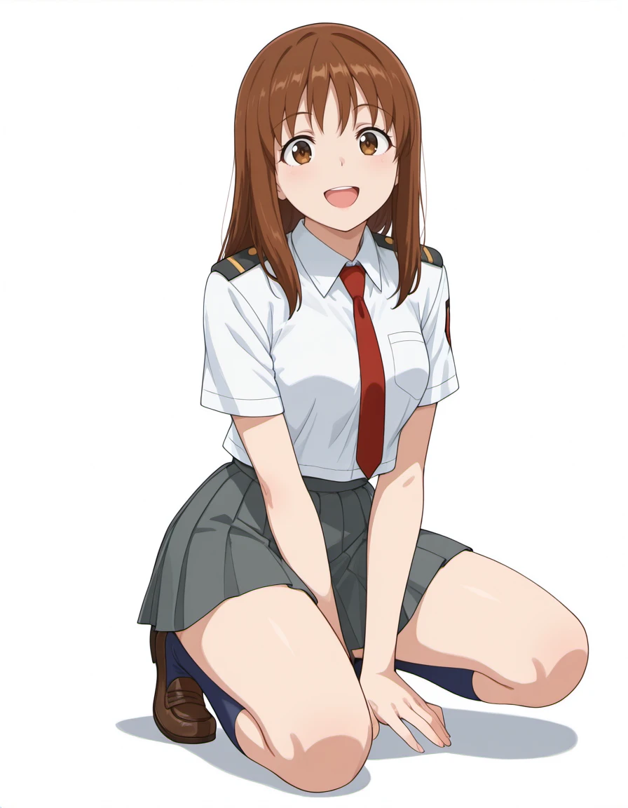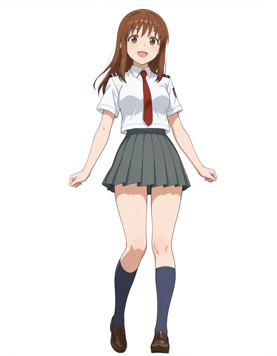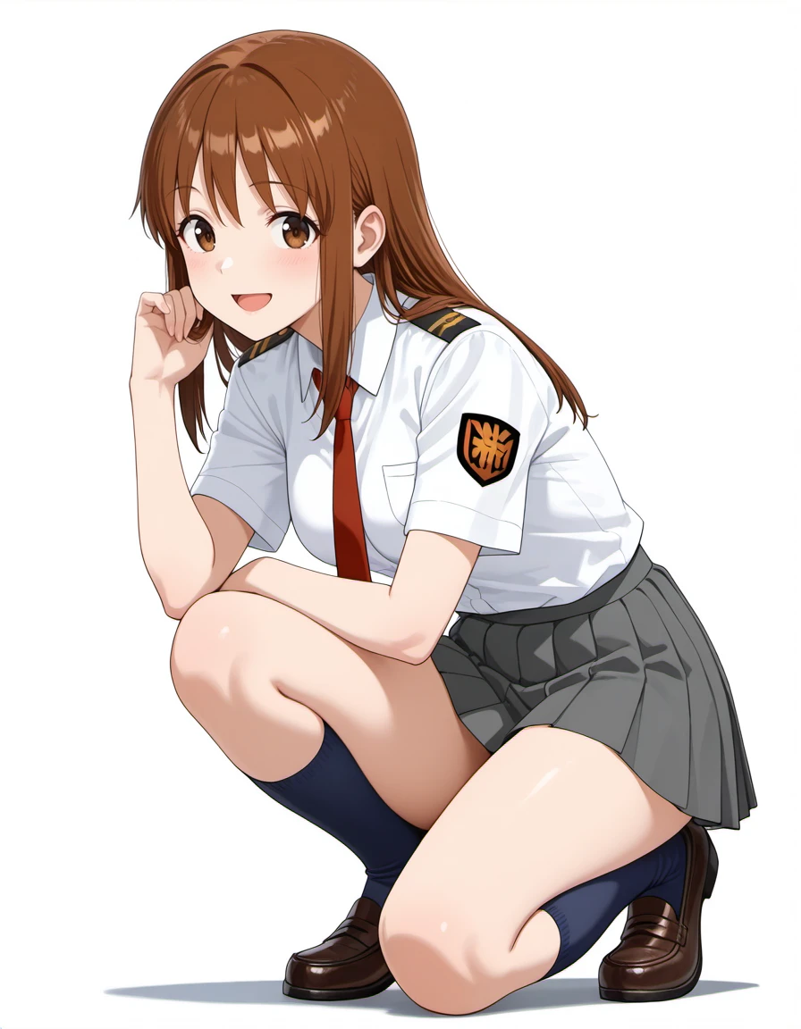 school uniform, white shirt, short sleeves, red necktie, pleated skirt, dark gray skirt, kneehighs, dark blue socks, loafers, emblem on left sleeve, epaulettes,