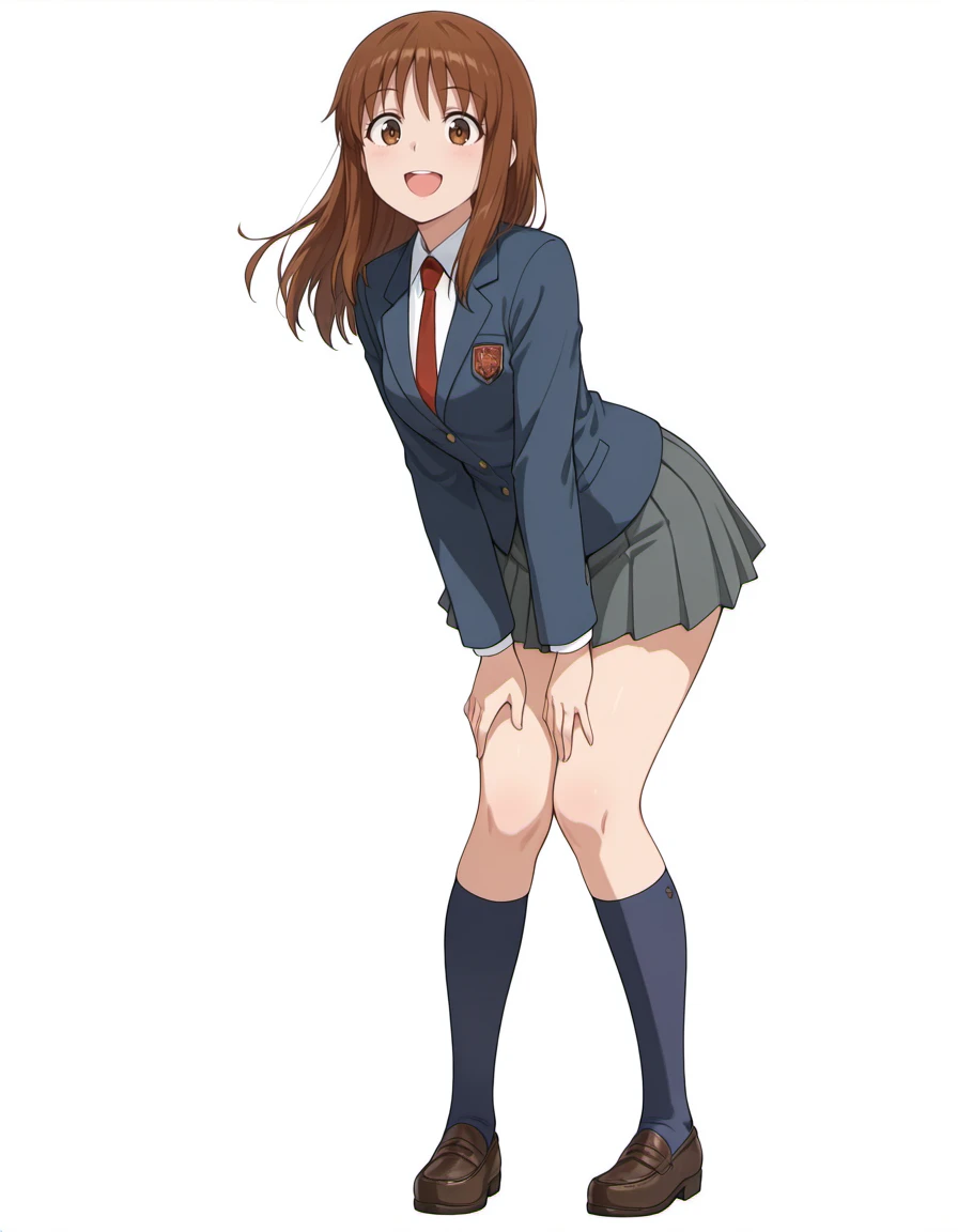 school uniform, dark blue blazer, long sleeves, red necktie, pleated skirt, dark gray skirt, kneehighs, dark blue socks, emblem on left chest, loafers,