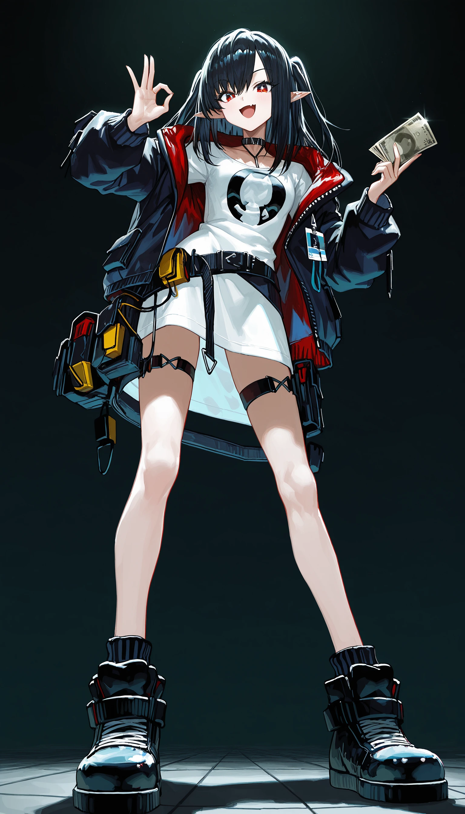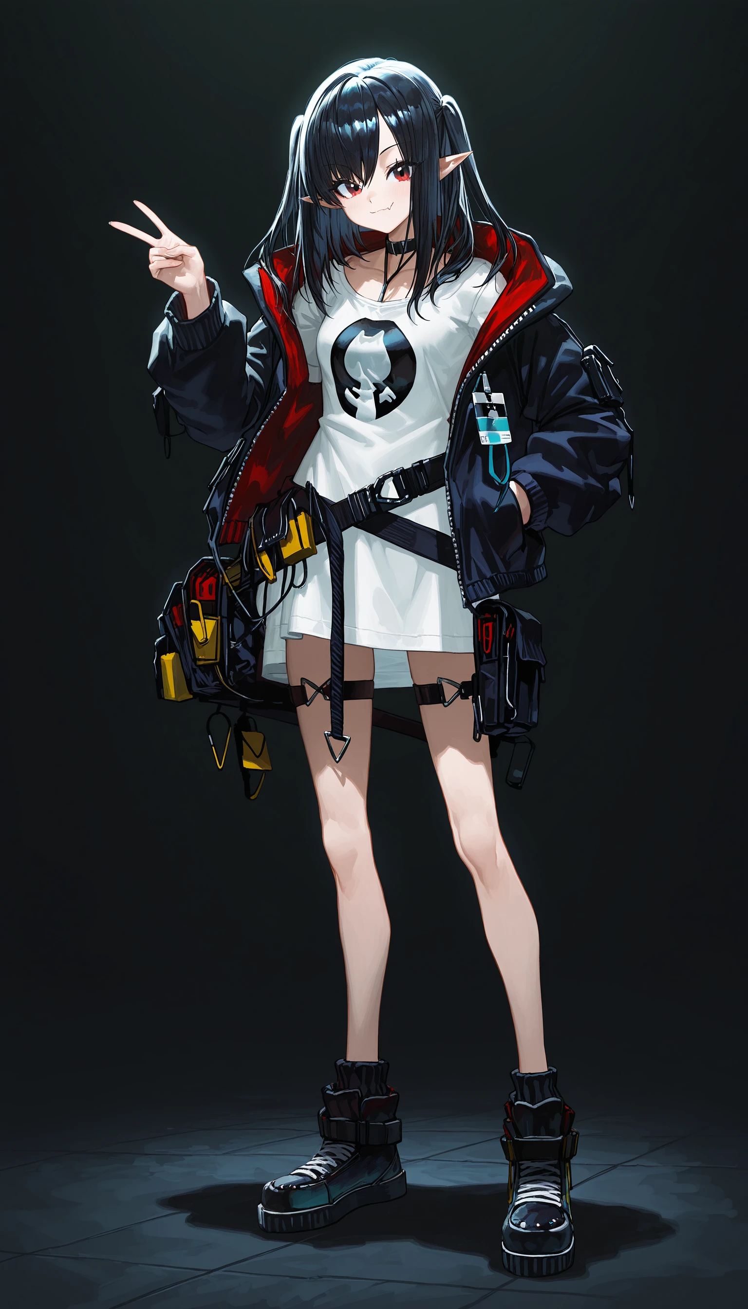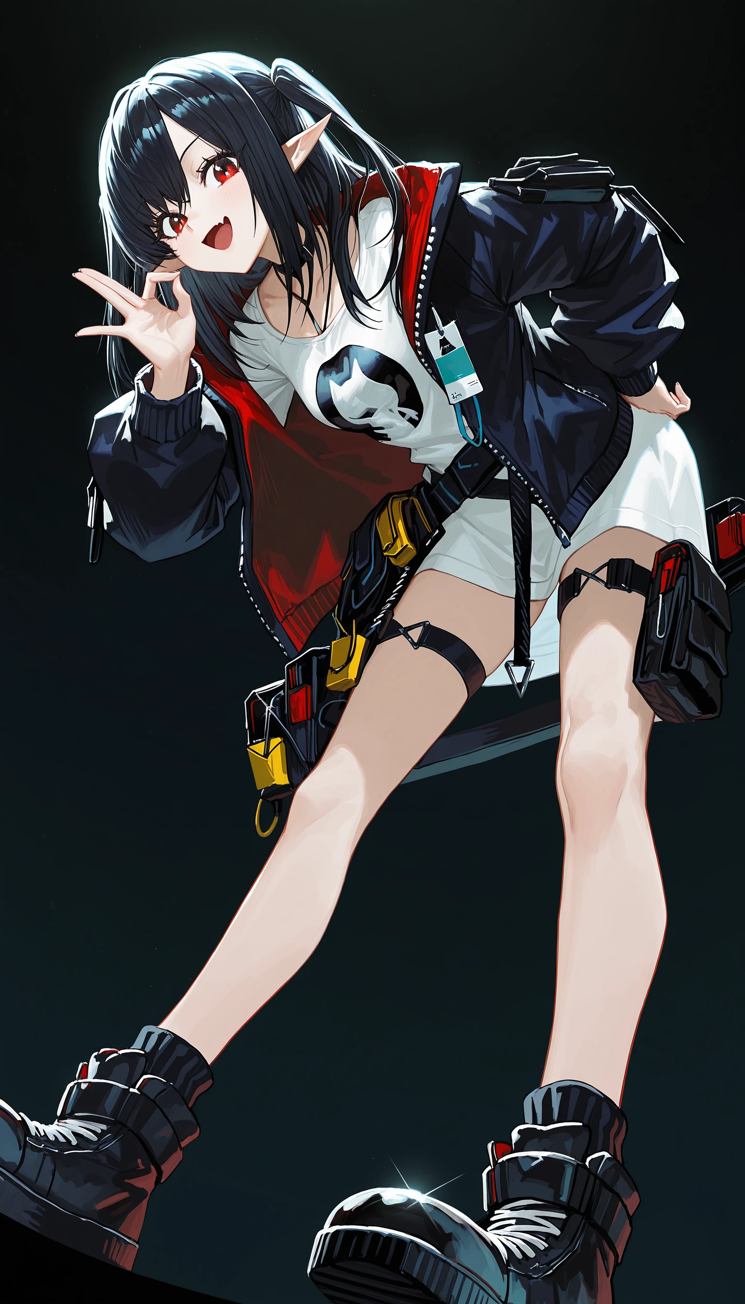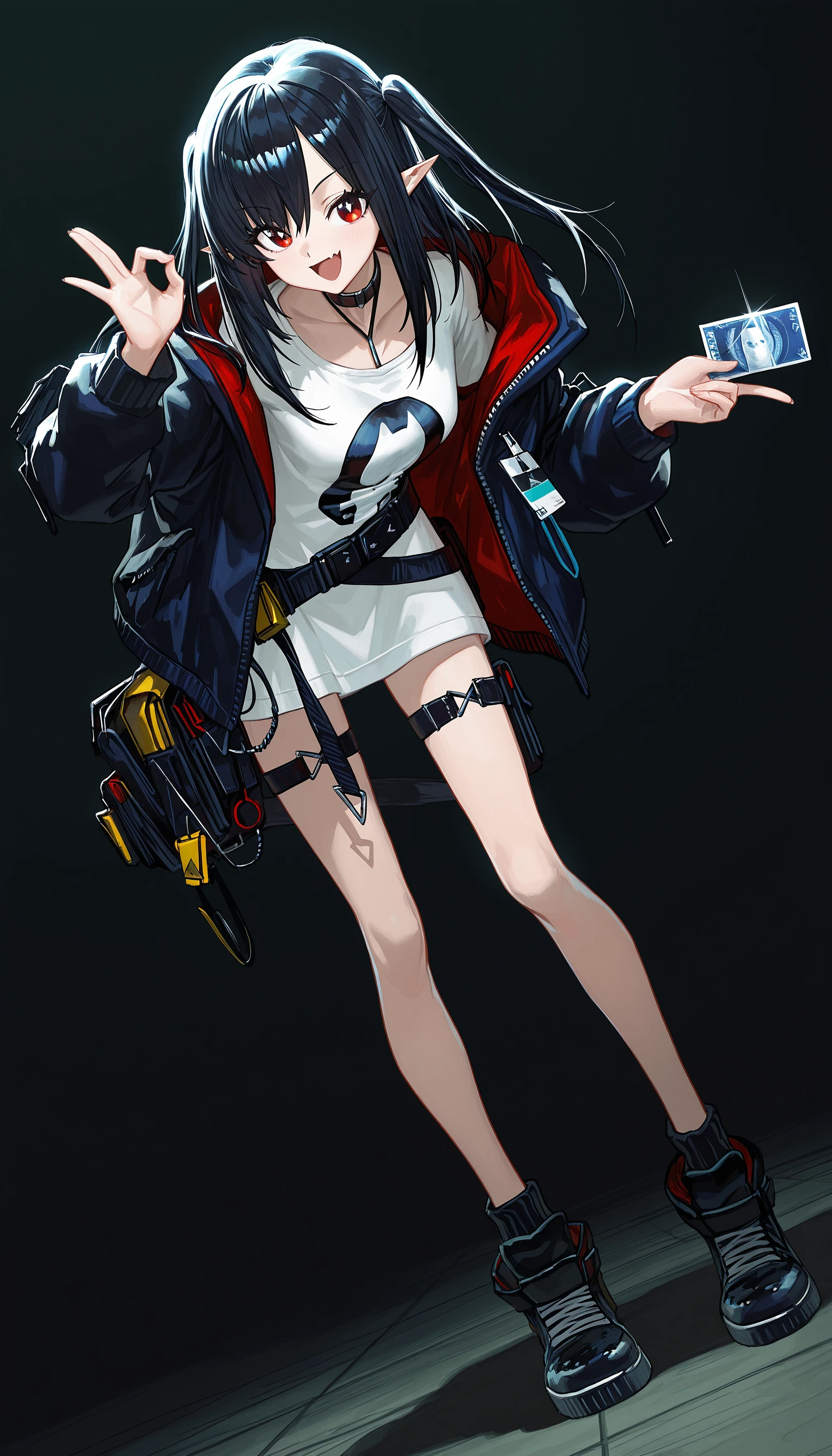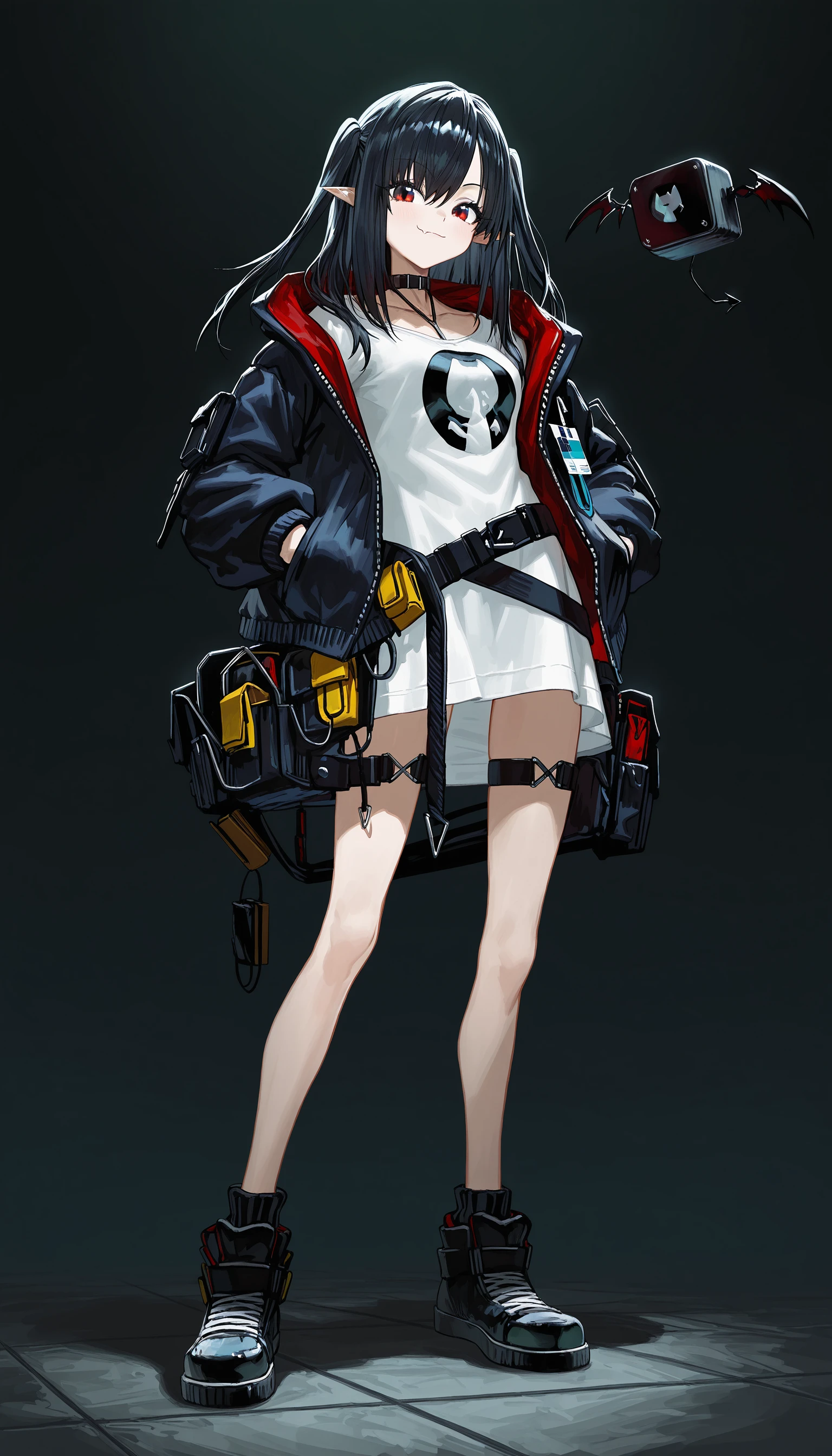 closure_\(arknights\) , red eyes, black hair, pointy_ears, two side up , lanyard, black choker,two-sided_jacket, id_card , long_shirt, thigh_strap, long_sleeves , sneakers, drone,