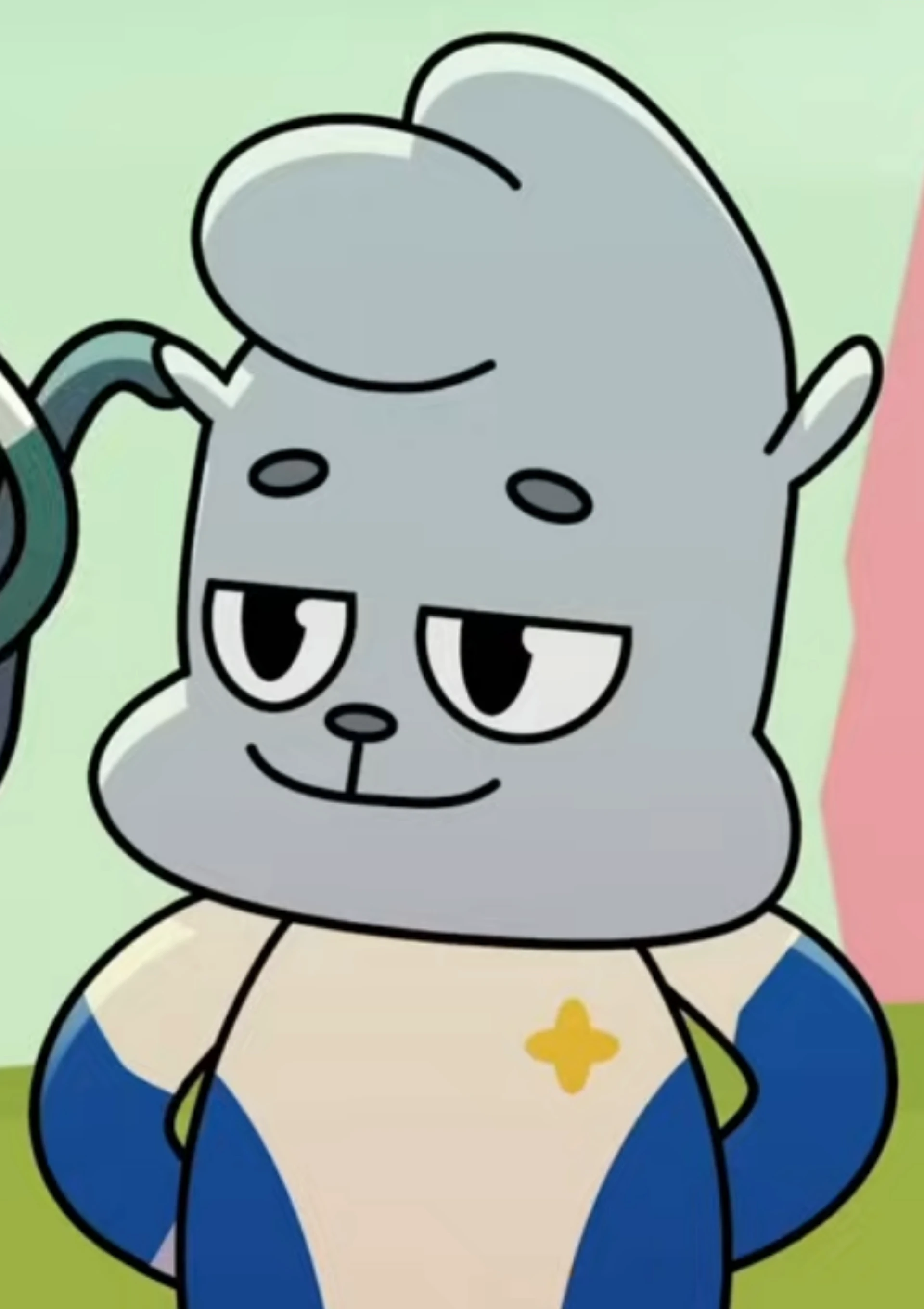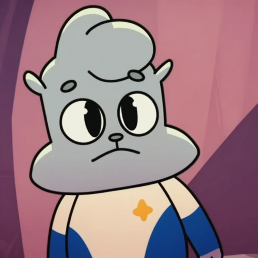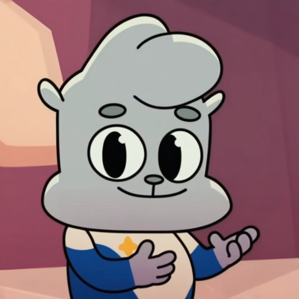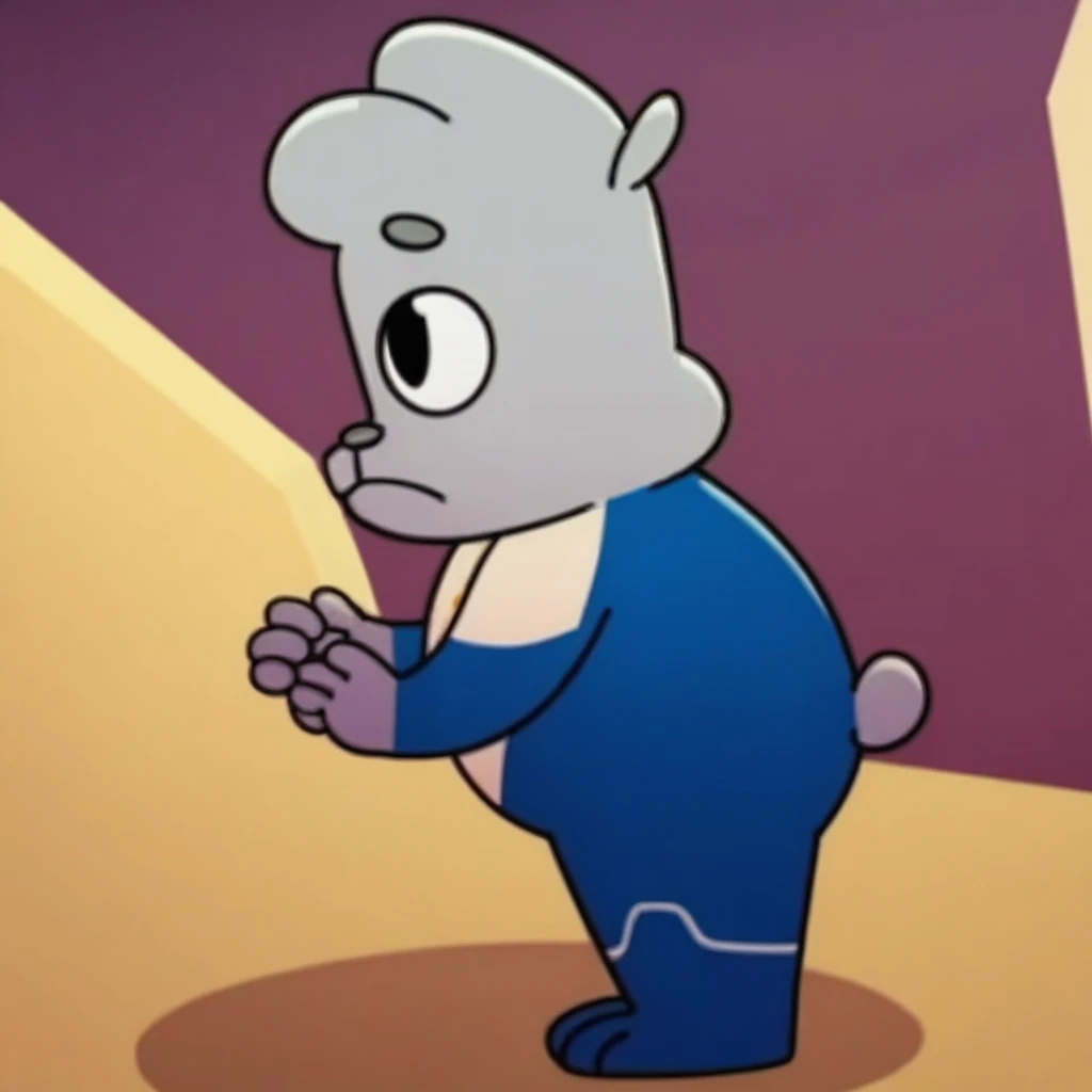 grey fur, grey hair, black eyes, small ears, small nose, small tail, small eyebrows, four fingers on arms