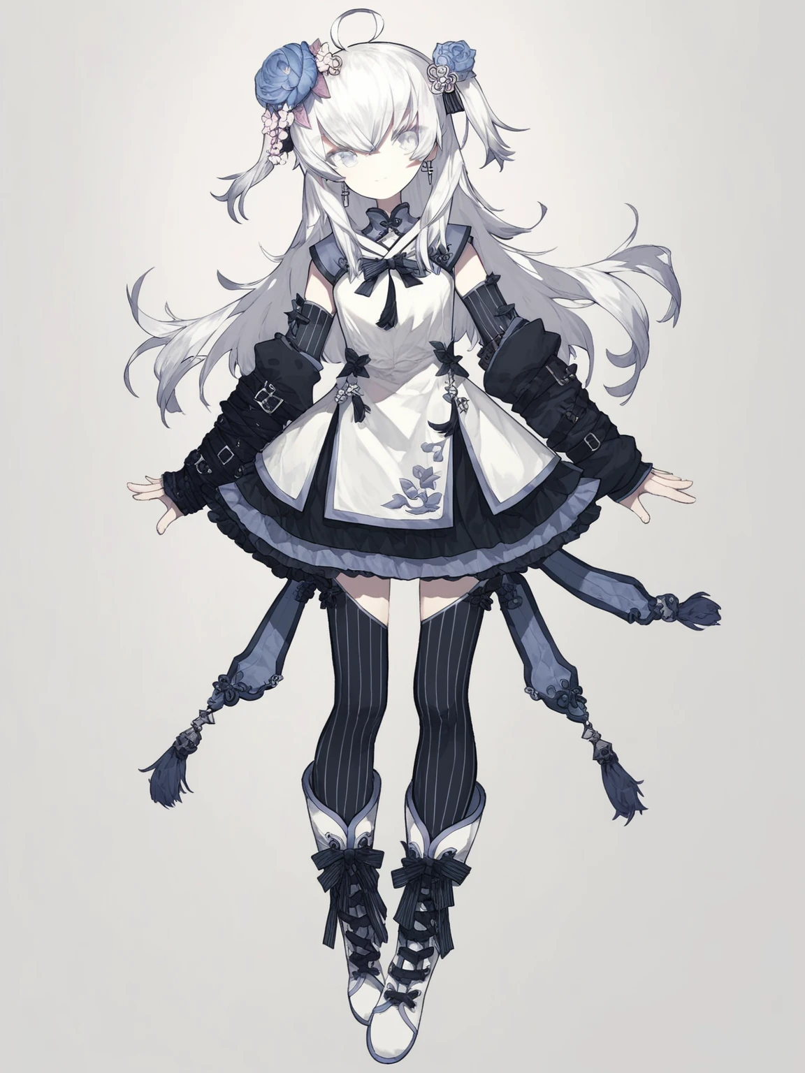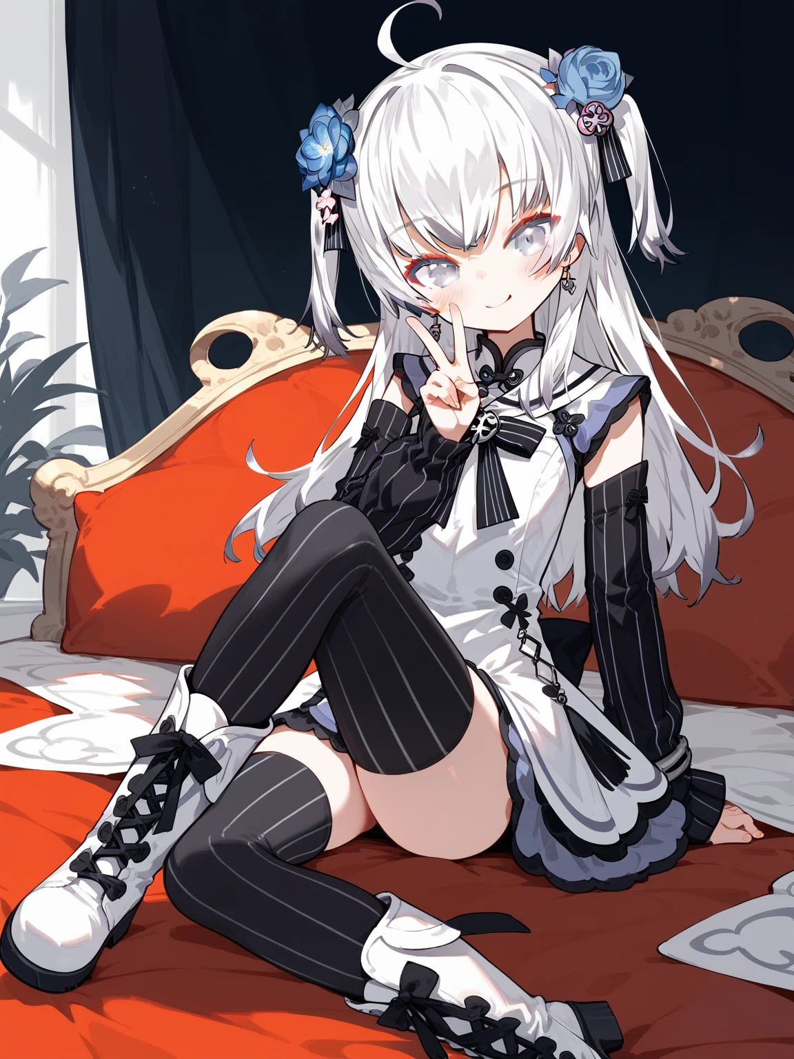 AzumaSeren,1girl,virtual youtuber,thighhighs,striped,ahoge,hair flower,white hair,bangs,two side up,detached sleeves,earrings,grey eyes,jewelry,white footwear,