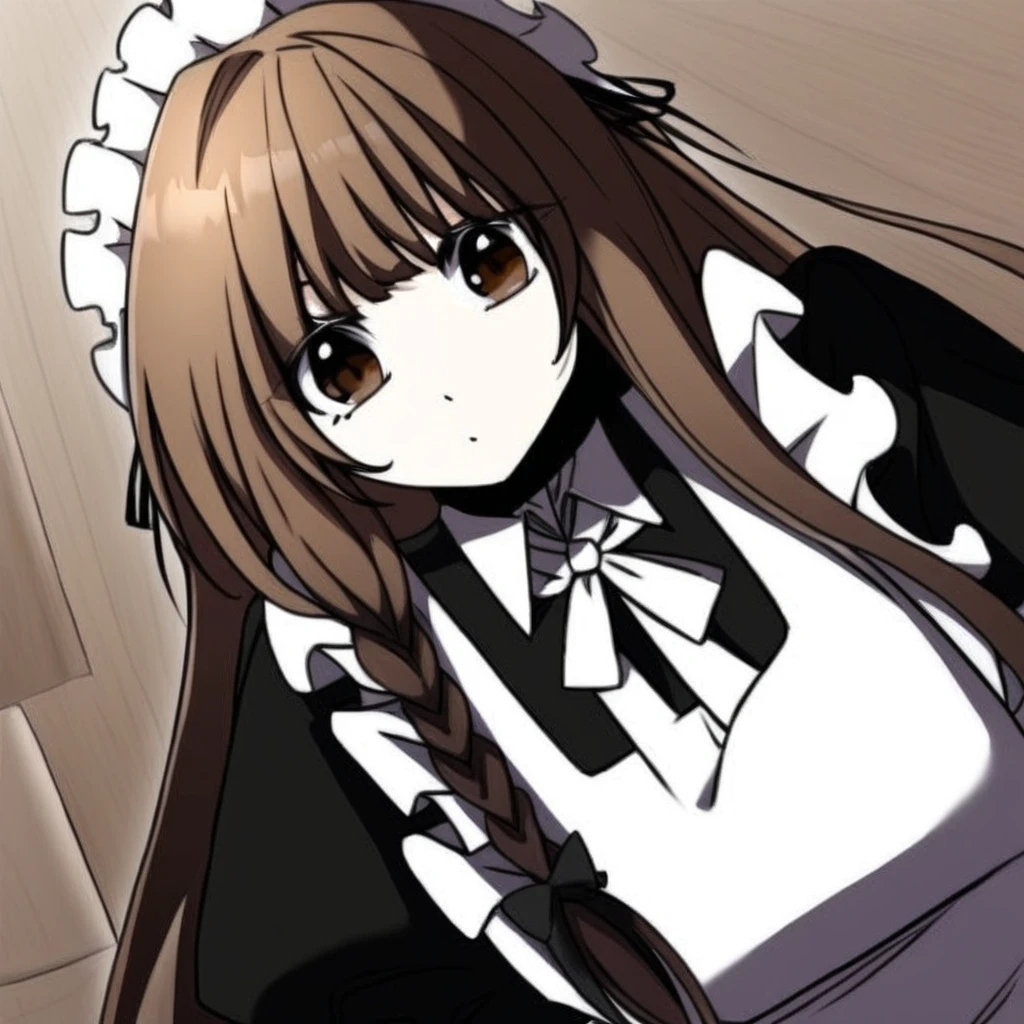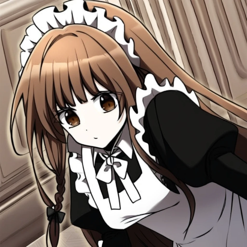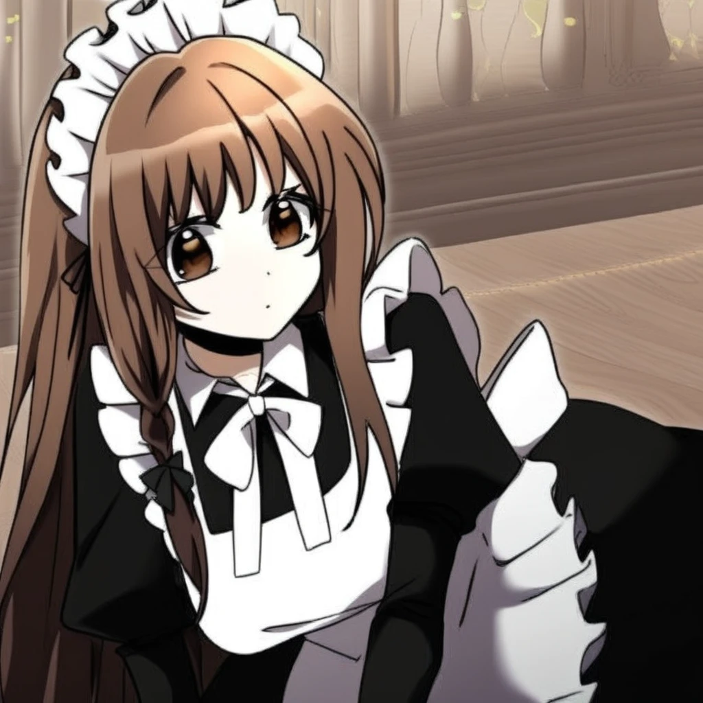 brown hair, long hair, brown eyes, side braid, black ribbon, hair ribbon, sidelocks, maid headdress, white bowtie, black dress, short dress, maid apron, white apron, frilled apron, juliet sleeves, long sleeves, white thighhighs