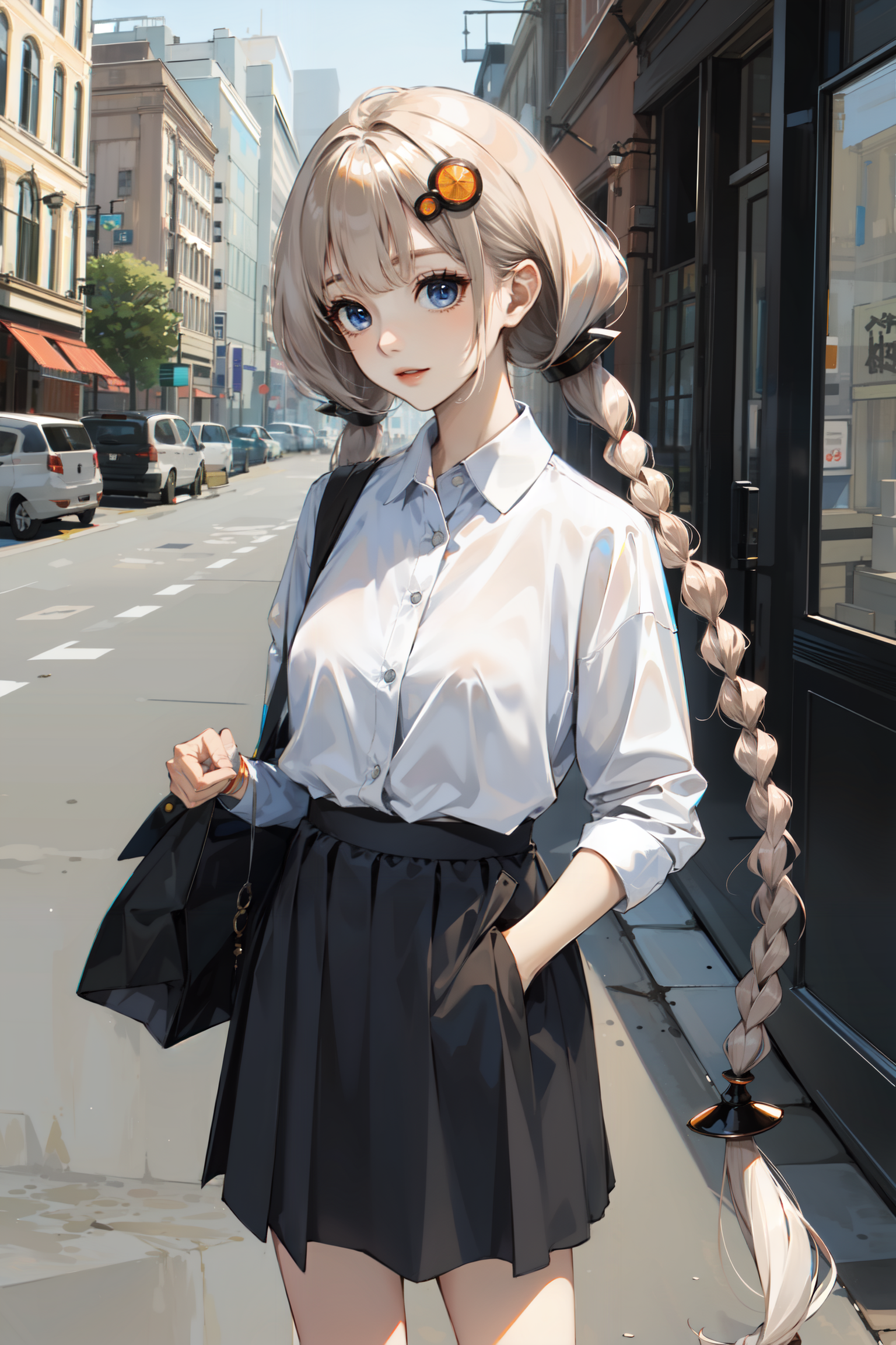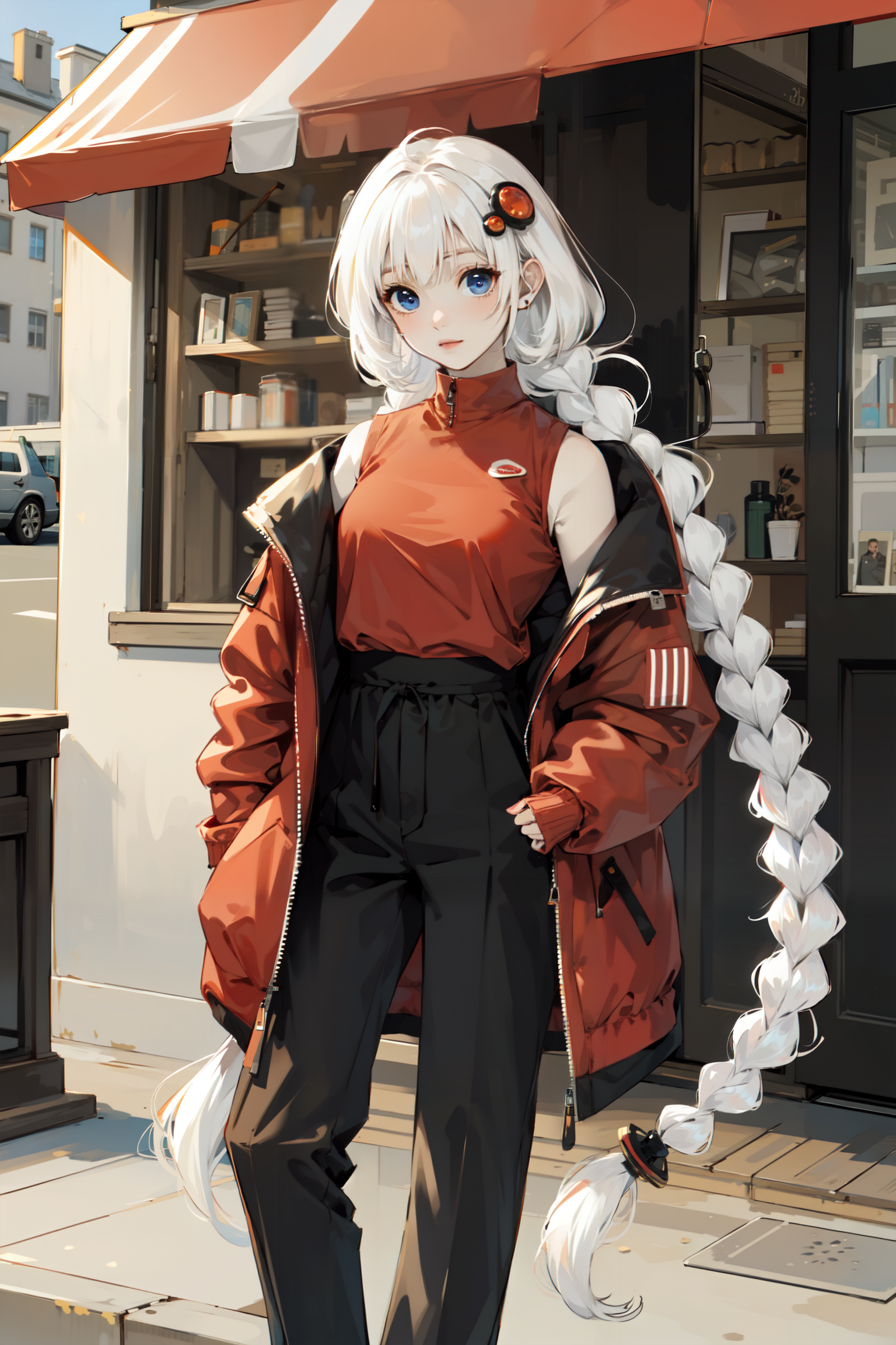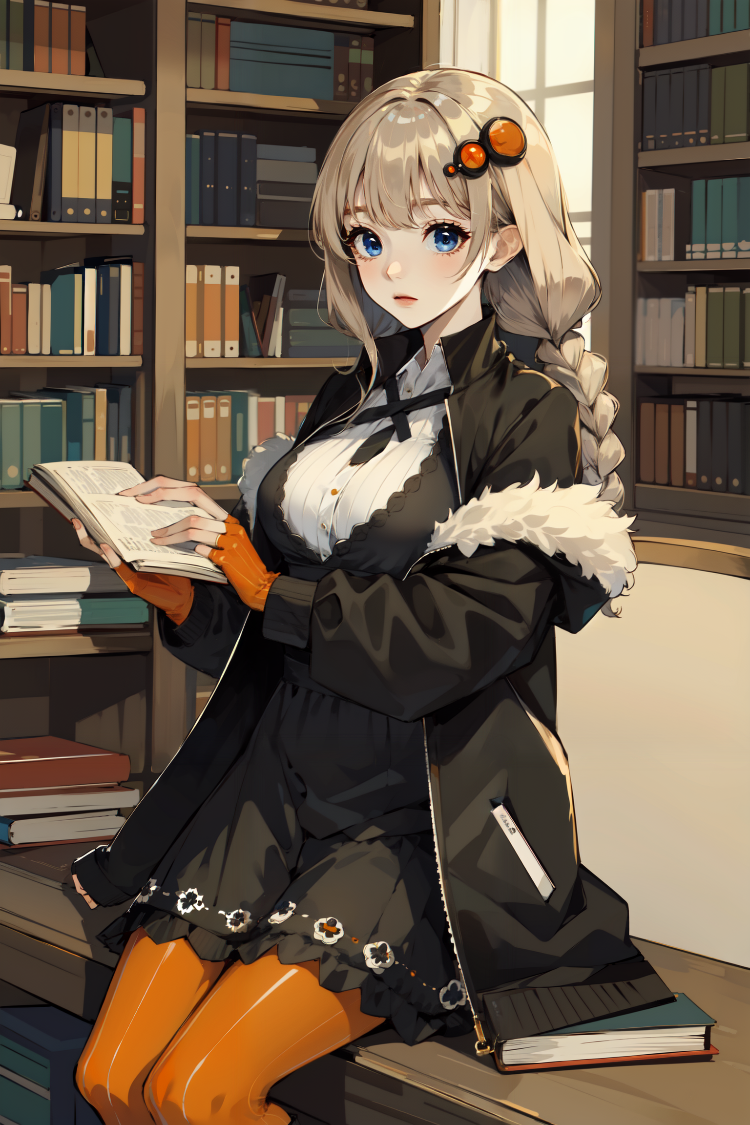 For best results I recommend using keywords like: orange hair ornament, white hair, very long hair, braided ponytails, twin braids, blue eyes.