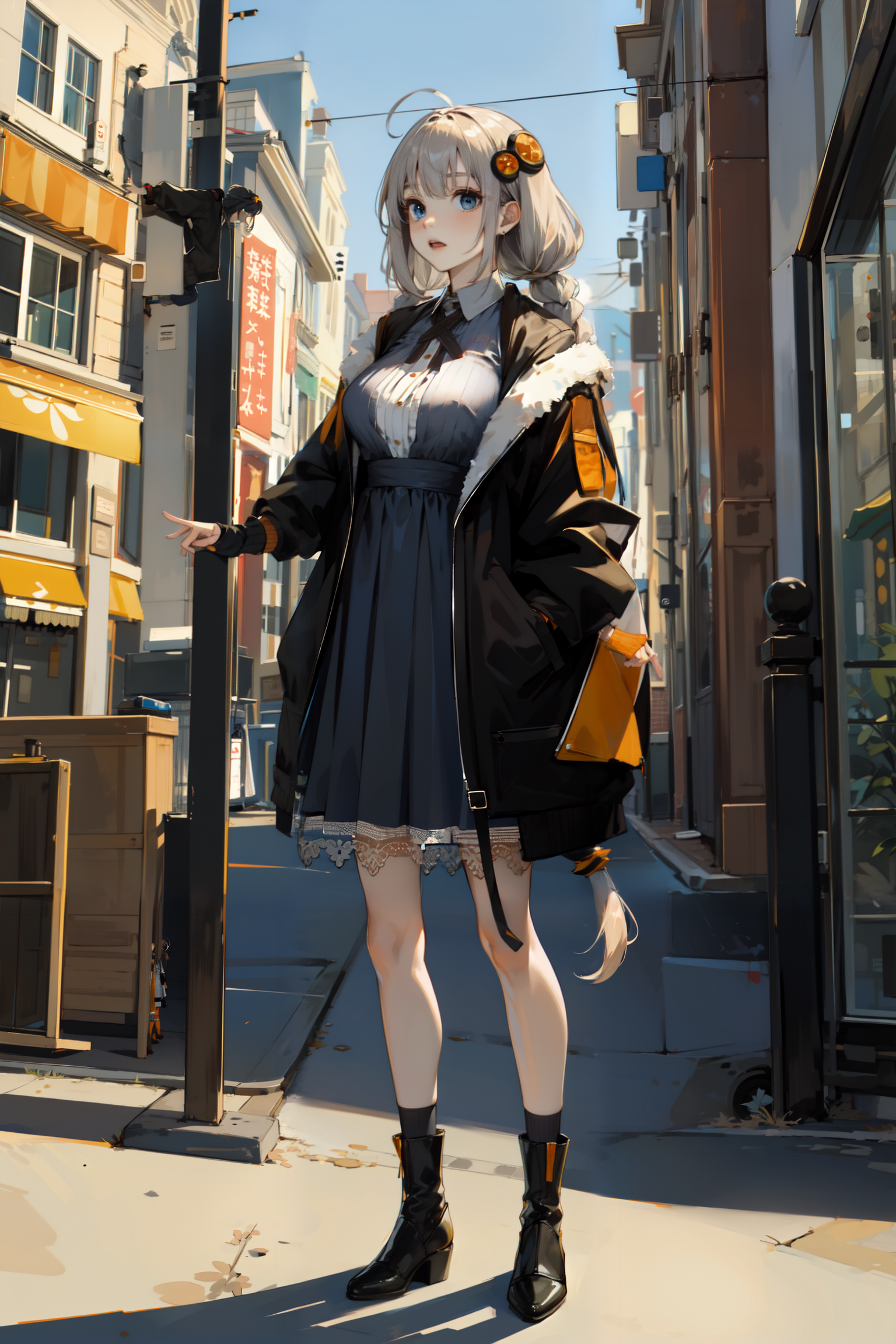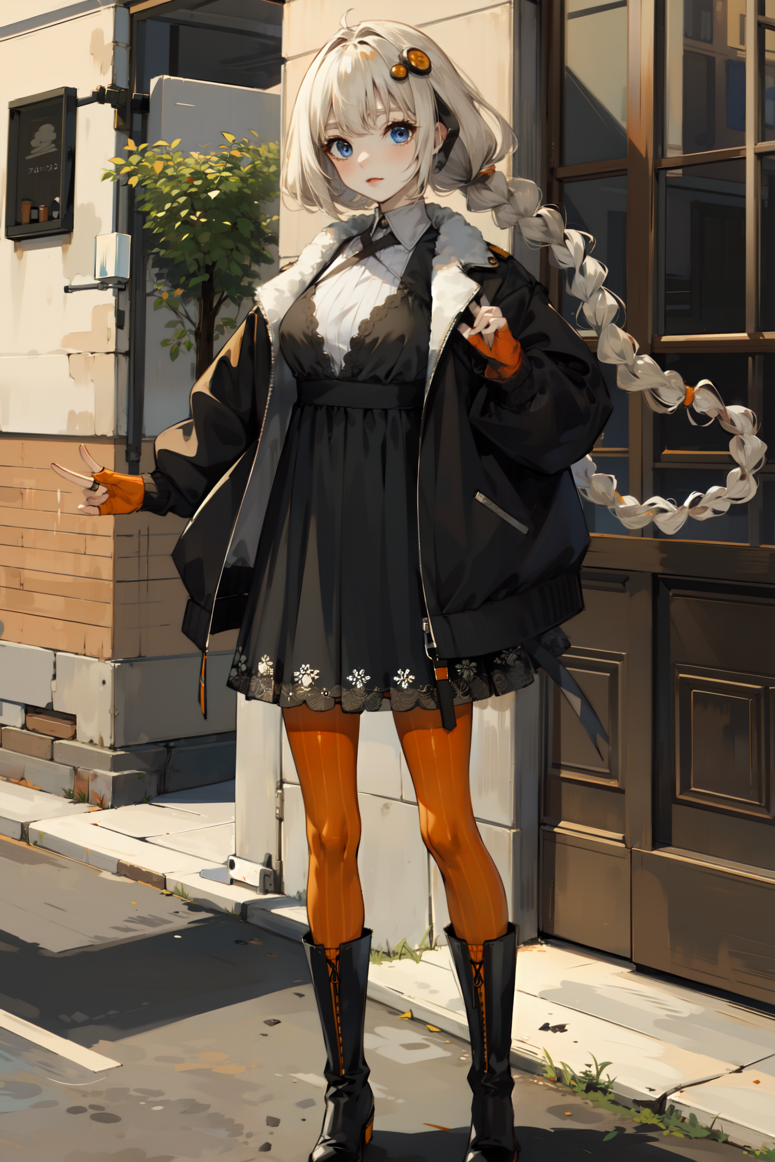 If you want to get her normal clothes, these keywords seem to help: black inside fur jacket, black dress, white shirt, orange gloves, fingerless gloves, orange pantyhose.