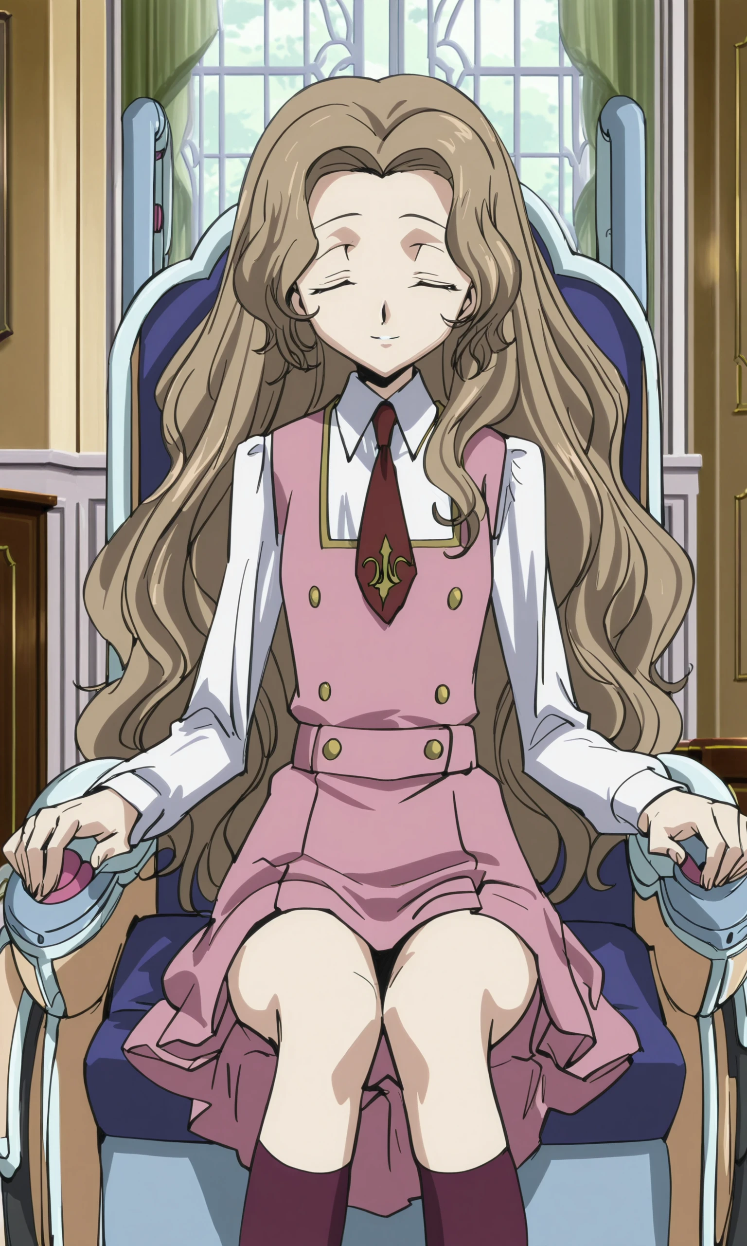 Suggested keywords: Nunnally Lamperouge, 1girl, long hair, brown hair, closed eyes | unusually open eyes, purple eyes